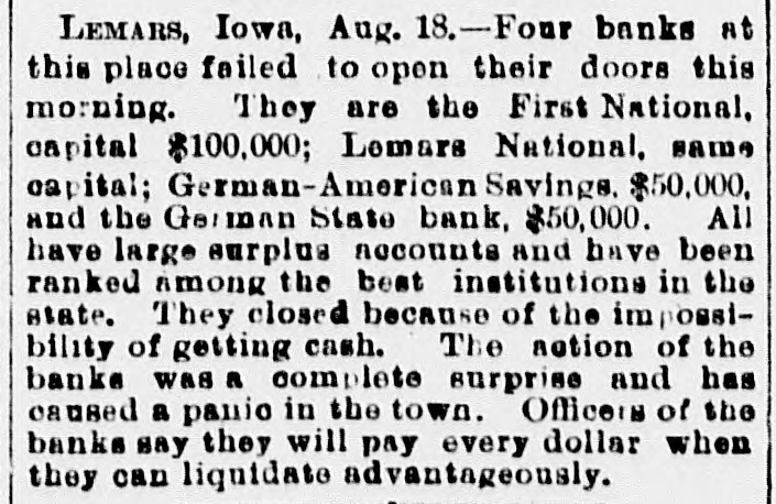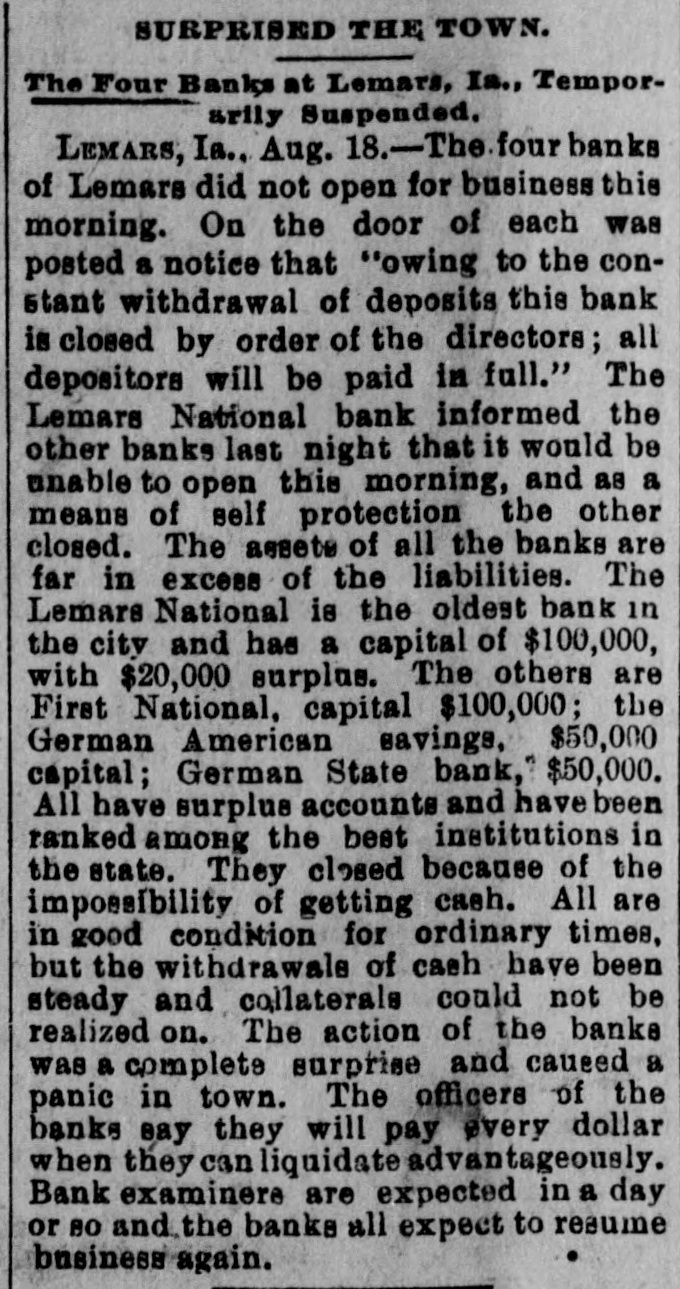 FOUR BANKS CLOSE. Every Bank in Lemars, Ia,, Fails to Open Yesterday. LEMARS, Ia., Aug. 18.-Four banks at this place failed to open their doors this morning. They are the First National, capital $100,000; Lemars National, same capital; German-American Savings, $50,000 capital; and German State bank, $50,000. All have large surplus accounts and have been ranked among the best institutions in the state. They closed because of the impossibility of getting cash. All were in good condition for ordinary times, but the withdrawals of cash had been steady and collaterals could not be realized on. The action of the banks was a complete surprise, and has caused a panic in town. Officers of the banks say they will pay every dollar when they can liquidate advantageously. On the door of each was posted a notice stating that "owing to the constant withdrawal of deposits this bank is closed by order of the directors and all depositors will be paid in full." The Lemars National bank informed the other banks last night that it would be unable to open this morning, and as a means of self-protection the other banks closed. Bank examiners are expected in a day or so and the banks all expect to resume business again.