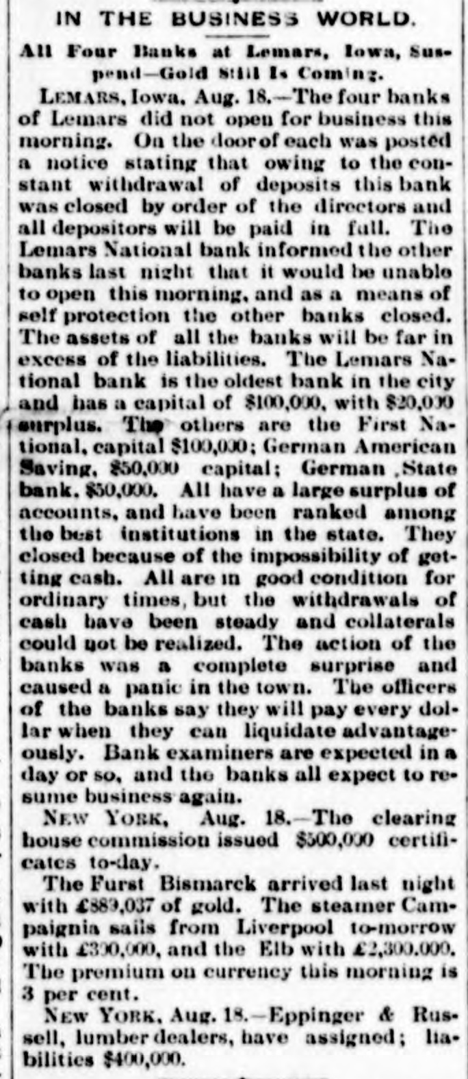 IN THE BUSINESS WORLD. All Four Banks at Lemars, Iowa, Suspend-Gold suit 1. Coming. LEMARS, Iowa. Aug. 8.-The four banks of Lemars did not open for business this morning. On the door of each was posted a notice stating that owing to the constant withdrawal of deposits this bank was closed by order of the directors and all depositors will be paid in fall. The Lemars National bank informed the other banks last night that it would be unable to open this morning. and as a means of self protection the other banks closed. The assets of all the banks will be far in excess of the liabilities. The Lemars National bank is the oldest bank in the city and has a capital of $100,000. with $20,000 surplus. The others are the First National, capital $100,000; German American Saving. $50,000 capital: German State bank. $50,000. All have a large surplus of accounts, and have been ranked among the best institutions in the state. They closed because of the impossibility of getting cash. All are in good condition for ordinary times, but the withdrawals of cash have been steady and collaterals could got be realized. The action of the banks was a complete surprise and caused a panic in the town. The officers of the banks say they will pay every dollar when they can liquidate advantageously. Bank examiners are expected in a day or so, and the banks all expect to resume business again. NEW YORK, Aug. 8.-The clearing house commission issued $500,000 certificates to-day. The Furst Bismarck arrived last night with £883,037 of gold. The steamer Campaignia sails from Liverpool to-morrow with £300,000, and the Elb with £2,300,000. The premium on currency this morning is 3 per cent. NEW YORK, Aug. 18.-Eppinger & Russell, lumber dealers, have assigned; liabilities $400,000.