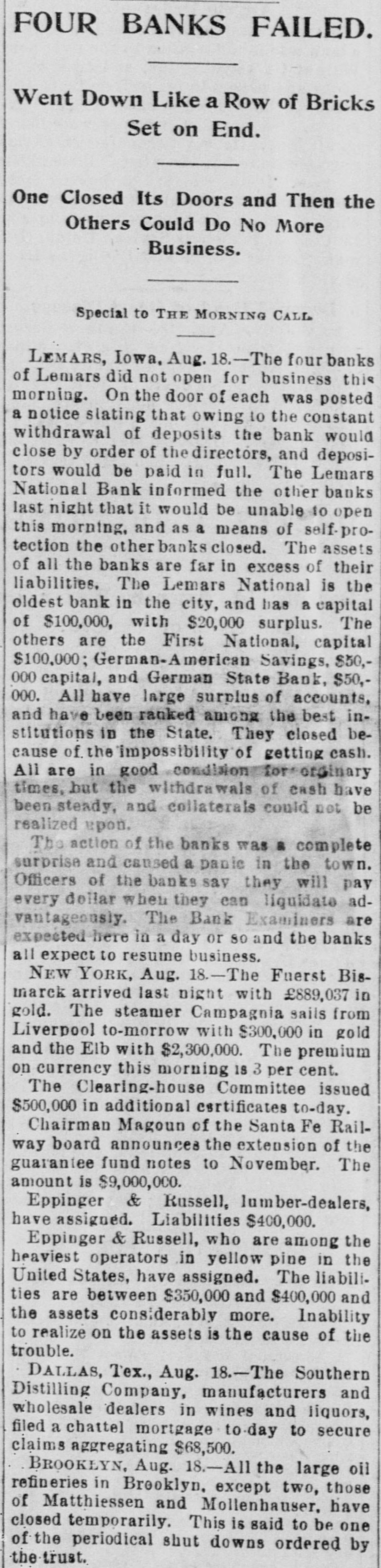 FOUR BANKS FAILED. Went Down Like a Row of Bricks Set on End. One Closed Its Doors and Then the Others Could Do No More Business. Special to THE MORNING CALL LEMARS, Iowa, Aug. 18.-The four banks of Lemars did not open for business this morning. On the door of each was posted a notice slating that owing to the constant withdrawal of deposits the bank would close by order of the directors, and depositors would be paid in full. The Lemars National Bank informed the other banks last night that it would be unable to open this morning, and as a means of self-protection the other banks closed. The assets of all the banks are far in excess of their liabilities. The Lemars National is the oldest bank in the city, and has a capital of $100,000, with $20,000 surplus. The others are the First National, capital $100,000; German-American Savings, $50,000 capital, and German State Bank, $50,000. All have large surplus of accounts. and have been ranked among the best institutions in the State. They closed because of the impossibility of getting cash. All are in good condition for orginary times, but the withdrawals of cash have been steady, and collaterals could not be realized upon. The action of the banks was a complete surprise and caused a panic in the town. Officers of the banks say they will pay every dollar when they can liquidate advantageously. The Bank Examiners are expected here in a day or 80 and the banks all expect to resume business. NEW YORK, Aug. 18.-The Fuerst Bismarck arrived last night with £889,037 in gold. The steamer Campagnia sails from Liverpool to-morrow with $300,000 in gold and the Elb with $2,300,000. The premium on currency this morning 18 3 per cent. The Clearing-house Committee issued $500,000 in additional certificates to-day. Chairman Magoun of the Santa Fe Railway board announces the extension of the guarantee fund notes to November. The amount is $9,000,000. Eppinger & Russell, lumber-dealers, have assigned. Liabilities $400,000. Eppinger & Russell, who are among the heaviest operators in yellow pine in the United States, have assigned. The liabilities are between $350,000 and $400,000 and the assets considerably more. Inability to realize on the assets is the cause of the trouble. DALLAS, Tex., Aug. 18.-The Southern Distilling Company, manufacturers and wholesale dealers in wines and liquors, filed a chattel mortgage today to secure claims aggregating $68,500. BROOKLYN, Aug. 18.-All the large oil refineries in Brooklyn, except two, those of Matthiessen and Mollenhauser, have closed temporarily. This is said to be one of the periodical shut downs ordered by the trust.