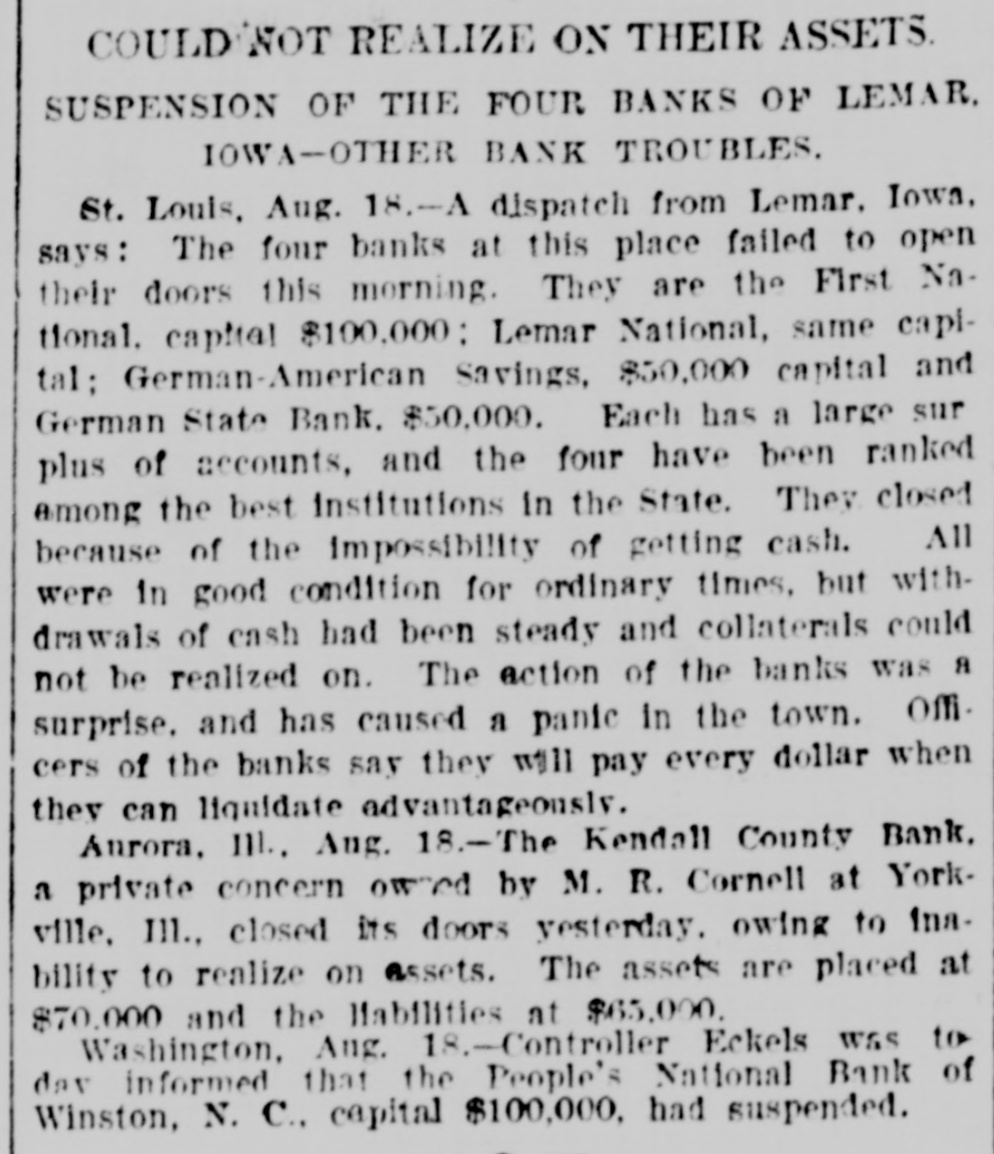 COULD NOT REALIZE ON THEIR ASSETS. SUSPENSION OF THE FOUR BANKS OF LEMAR. IOWA-OTHER BANK TROUBLES. St. Louis, Aug. 18.-A dispatch from Lemar. Iowa, says: The four banks at this place failed to open their doors this morning. They are the First National. capital $100,000; Lemar National, same capital; German-American Savings, $50,000 capital and German State Bank. $50,000. Each has a large sur plus of accounts, and the four have been ranked among the best institutions in the State. They closed because of the impossibility of getting cash. All were in good condition for ordinary times, but withdrawals of cash had been steady and collaterals could not be realized on. The action of the banks was a surprise. and has caused a panic in the town. Officers of the banks say they will pay every dollar when they can liquidate advantageously. Aurora. III., Aug. 18.-The Kendall County Bank. a private concern owned by M. R. Cornell at Yorkville, III., closed its doors yesterday. owing to Inability to realize on assets. The assets are placed at $70,000 and the Habilities at $65,000. Washington, Aug. 18.-Controller Eckels WaS to day informed that the People's National Bank of Winston, N. C., capital $100,000, had suspended.