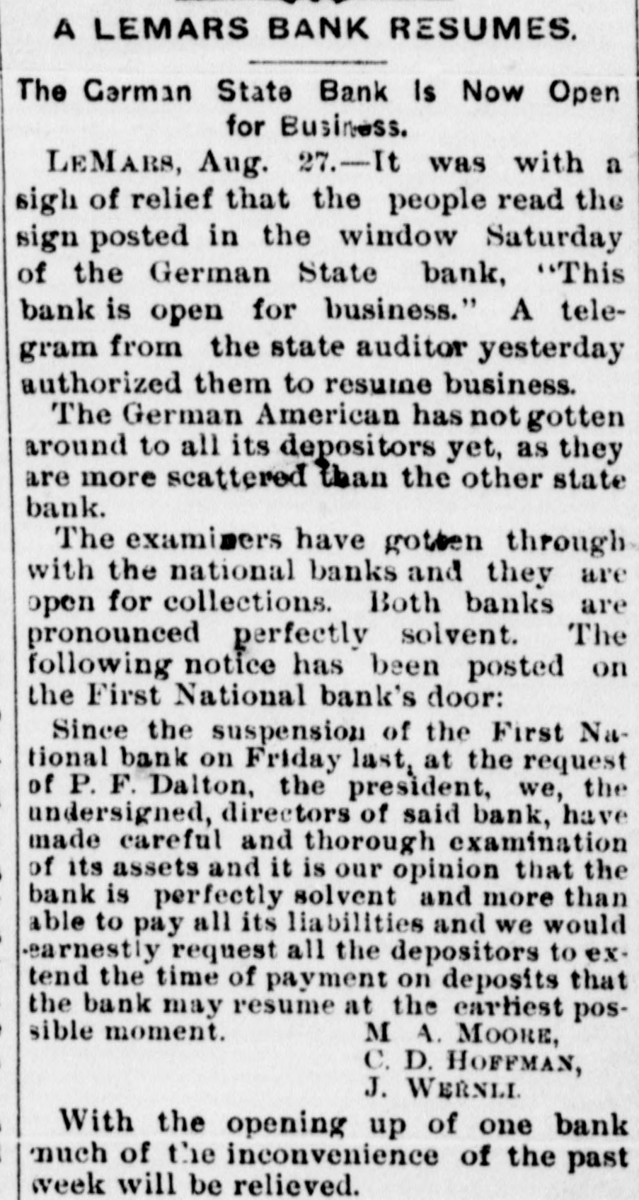 A LEMARS BANK RESUMES. The Garman State Bank Is Now Open for Business. LEMARS, Aug. 27.-It was with a sigh of relief that the people read the sign posted in the window Saturday of the German State bank, "This bank is open for business." A telegram from the state auditor yesterday authorized them to resume business. The German American has not gotten around to all its depositors yet, as they are more scattered than the other state bank. The examiners have gotten through with the national banks and they are open for collections. Both banks are pronounced perfectly solvent. The following notice has been posted on the First National bank's door: Since the suspension of the First National bank on Friday last, at the request of P. F. Dalton, the president, we, the undersigned, directors of said bank, have made careful and thorough examination of its assets and it is our opinion that the bank is perfectly solvent and more than able to pay all its liabilities and we would earnestly request all the depositors to extend the time of payment on deposits that the bank may resume at the earliest possible moment. M A. MOORE, C. D. HOFFMAN, J. WERNLL With the opening up of one bank much of the inconvenience of the past week will be relieved.