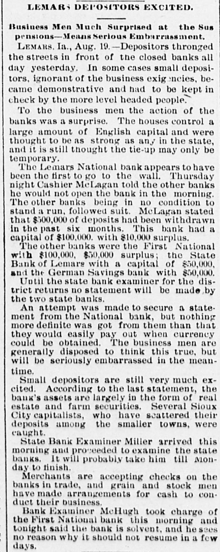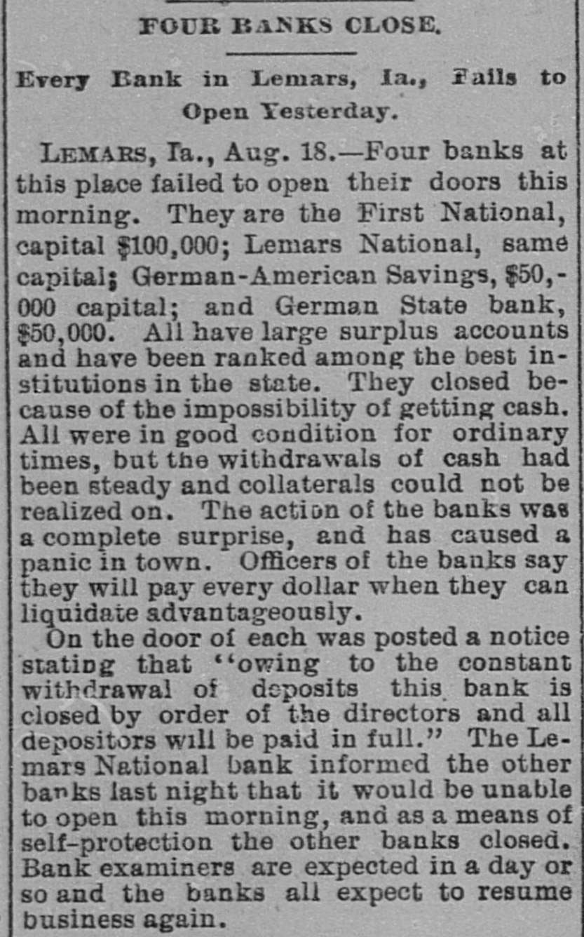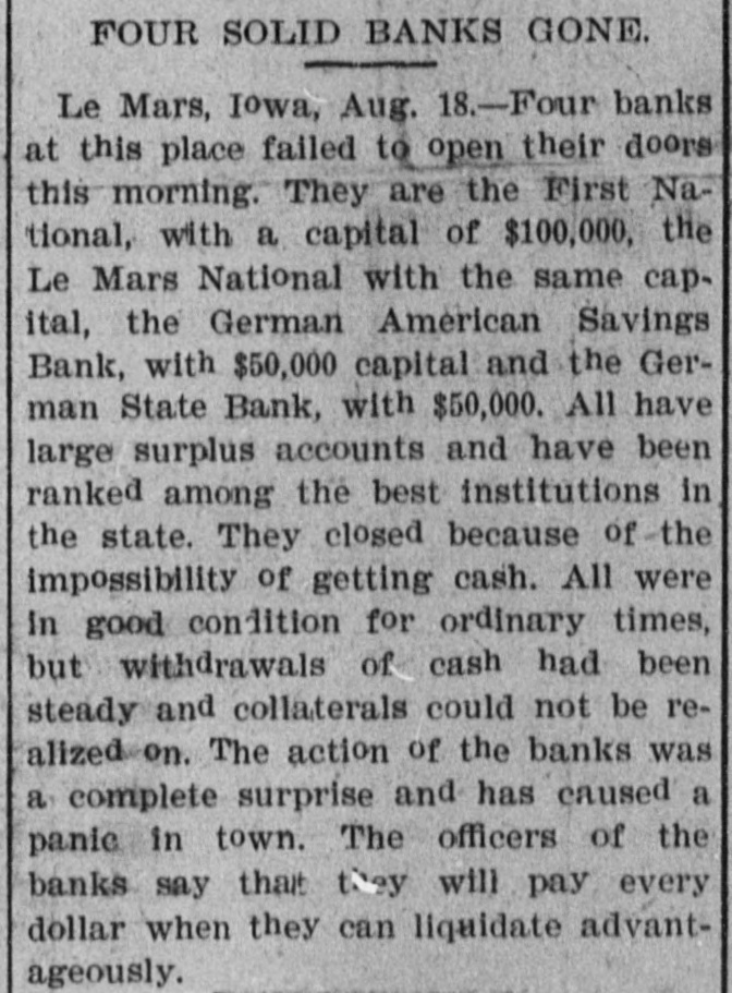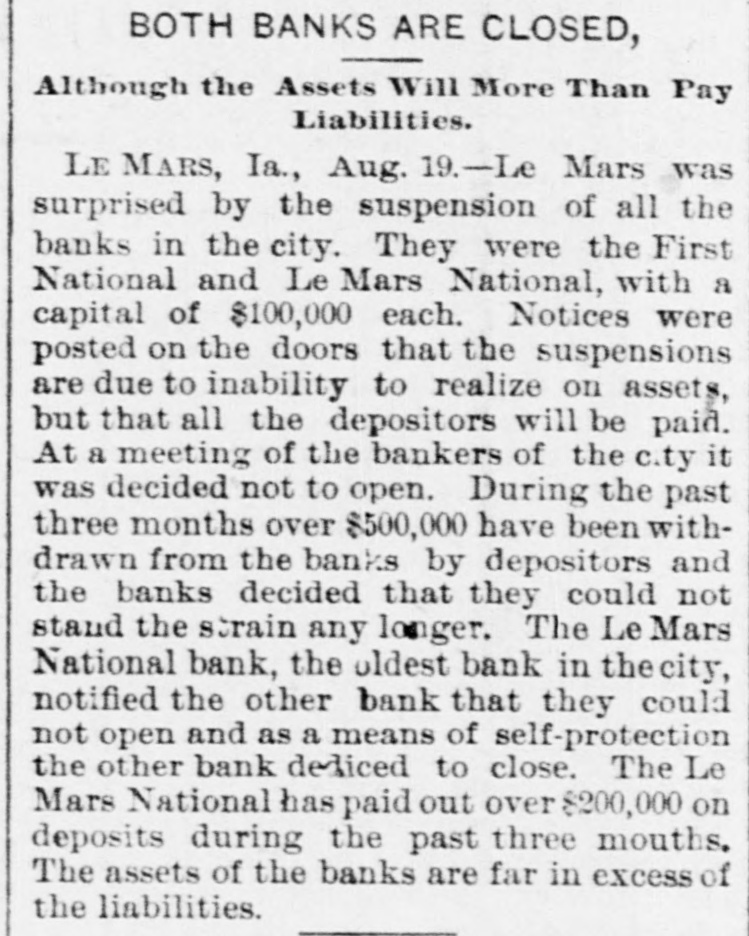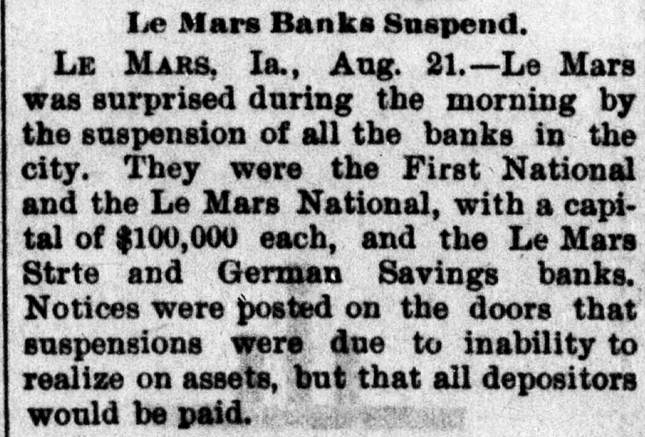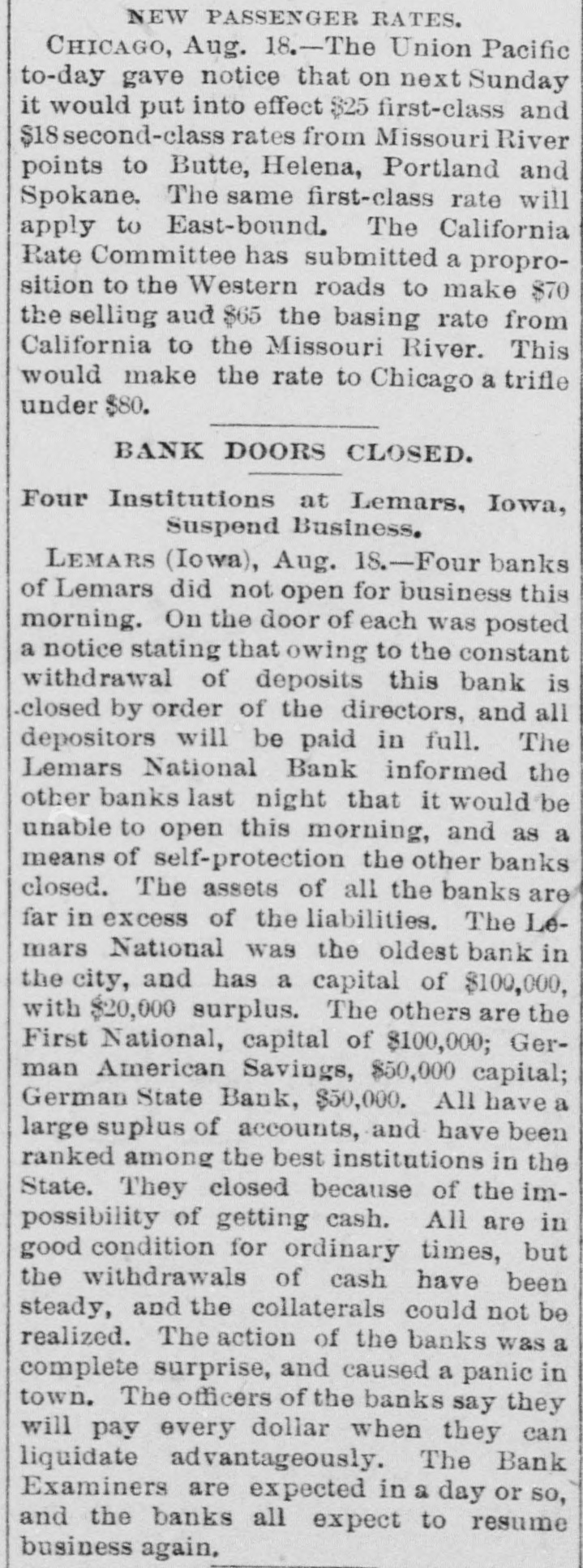 NEW PASSENGER RATES. CHICAGO, Aug. 18.-The Union Pacific to-day gave notice that on next Sunday it would put into effect $25 first-class and Ssecond-class rates from Missouri River points to Butte, Helena, Portland and Spokane. The same first-class rate will apply to East-bound. The California Rate Committee has submitted a proprosition to the Western roads to make $70 the selling aud $65 the basing rate from California to the Missouri River. This would make the rate to Chicago a trifle under $80. BANK DOORS CLOSED. Four Institutions at Lemars, Iowa, Suspend Business. LEMARS (Iowa), Aug. 18.-Four banks of Lemars did not open for business this morning. On the door of each was posted a notice stating that owing to the constant withdrawal of deposits this bank is .closed by order of the directors, and all depositors will be paid in full. The Lemars National Bank informed the other banks last night that it would be unable to open this morning, and as a means of self-protection the other banks closed. The assets of all the banks are far in excess of the liabilities. The Lemars National was the oldest bank in the city, and has a capital of $100,000, with $20,000 surplus. The others are the First National, capital of $100,000; German American Savings, $50,000 capital; German State Bank, $50,000. All have a large suplus of accounts, and have been ranked among the best institutions in the State. They closed because of the impossibility of getting cash. All are in good condition for ordinary times, but the withdrawals of cash have been steady, and the collaterals could not be realized. The action of the banks was a complete surprise, and caused a panic in town. The officers of the banks say they will pay every dollar when they can liquidate advantageously. The Bank Examiners are expected in a day or so, and the banks all expect to resume business again,