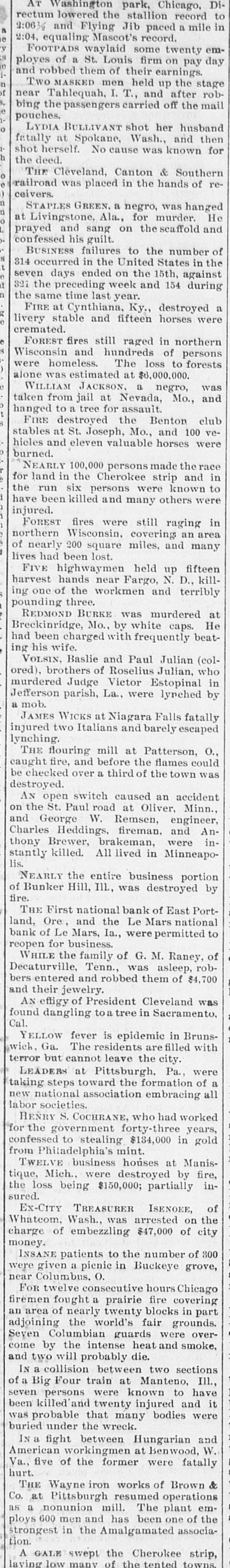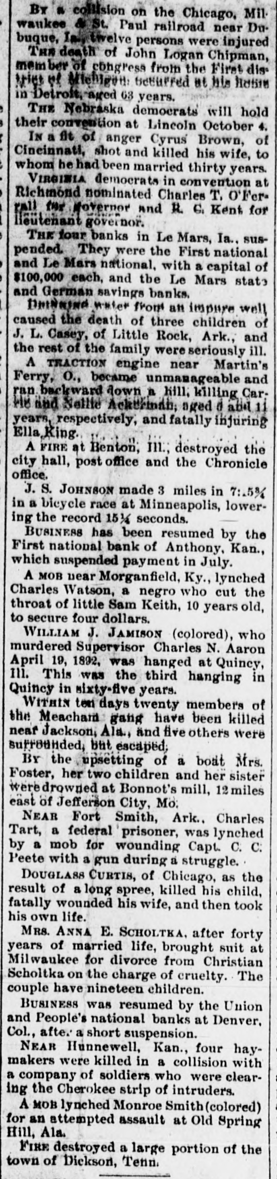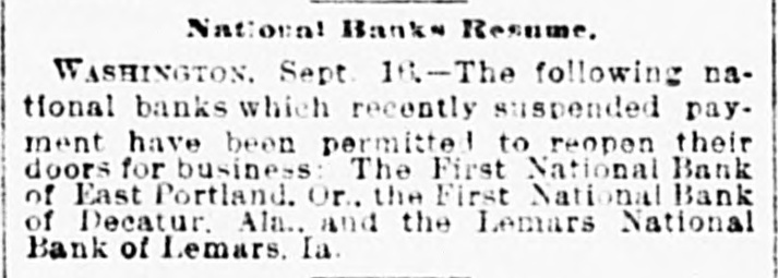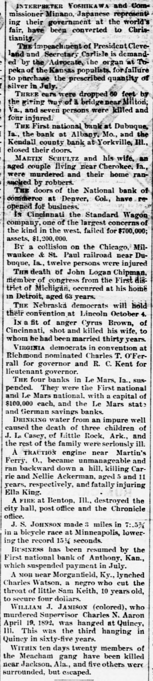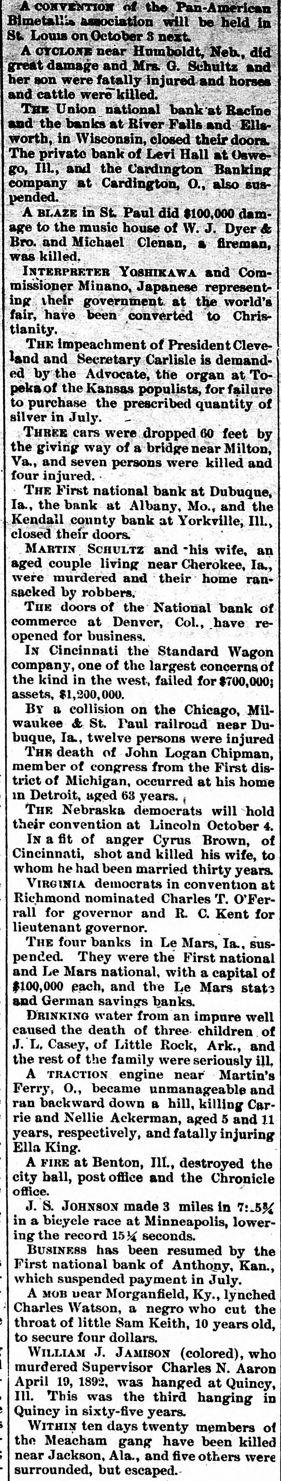NEW PASSENGER RATES. CHICAGO, Aug. 18.-The Union Pacific to-day gave notice that on next Sunday it would put into effect $25 first-class and Ssecond-class rates from Missouri River points to Butte, Helena, Portland and Spokane. The same first-class rate will apply to East-bound. The California Rate Committee has submitted a proprosition to the Western roads to make $70 the selling aud $65 the basing rate from California to the Missouri River. This would make the rate to Chicago a trifle under $80. BANK DOORS CLOSED. Four Institutions at Lemars, Iowa, Suspend Business. LEMARS (Iowa), Aug. 18.-Four banks of Lemars did not open for business this morning. On the door of each was posted a notice stating that owing to the constant withdrawal of deposits this bank is .closed by order of the directors, and all depositors will be paid in full. The Lemars National Bank informed the other banks last night that it would be unable to open this morning, and as a means of self-protection the other banks closed. The assets of all the banks are far in excess of the liabilities. The Lemars National was the oldest bank in the city, and has a capital of $100,000, with $20,000 surplus. The others are the First National, capital of $100,000; German American Savings, $50,000 capital; German State Bank, $50,000. All have a large suplus of accounts, and have been ranked among the best institutions in the State. They closed because of the impossibility of getting cash. All are in good condition for ordinary times, but the withdrawals of cash have been steady, and the collaterals could not be realized. The action of the banks was a complete surprise, and caused a panic in town. The officers of the banks say they will pay every dollar when they can liquidate advantageously. The Bank Examiners are expected in a day or so, and the banks all expect to resume business again,