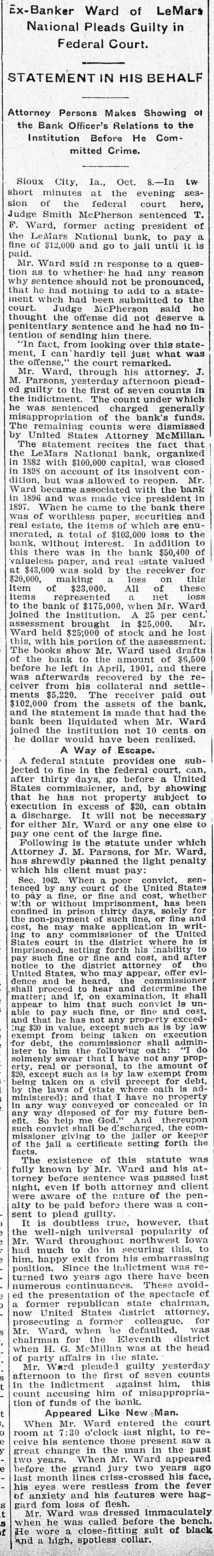 of Ward LeMars in Ex-Banker National Pleads Guilty Federal Court. STATEMENT IN HIS BEHALF Makes Showing the Attorney Persons Officer's Relations Com- to the Bank Before He Institution mitted Crime. tw Oct. s.-In sesSioux City, Ia., at the evening court here, T. short minutes the federal sentenced of sion of Smith McPherson acting president pay of Judge Ward, former National bank, until to it the F. LeMars $12,000 and go to jail to a quespaid. fine Ward said in response he had anyounced, reason tion Mr. as to whether should not add be to a to state- the why sentence he had nothing been to submit said he that ment whch Judge had McPherson did not deserve no inthere. this court. thought the sentence offense and he had statetention penitential of from looking him over just what was fact, tell remarked. ment, "In I can hardly the court his attorney. J. the offense, Ward, esterday through afternoon counts M. Mr. Parsons to the first count of seven t under general which ed the guilty indictment sentenced The charged the bank's funds. he was opriation counts of were McMillan sapple Attorney fact that The United States recites the organized ized by The statement National capital, bank, olvent was closed con the 1882 LeMars with $100,000 of its insolvent reopen bank Mr in in 1898 on account was allowed to with sident the in dition, became but associated vice presid bank there Ward was made to the and real in When paper, which are the total 1897. 1896 and worthless he came of Securities loss to enuIn was estate, of the items of $103,000 addition of to merated, without a interest in the bank estate $50,400 valued for bank. was real receiver this there paper sold and by the loss on these this $20,000, $23,000. valueless at $43,00 making was a All net of loss the Ward Institution of represented when Mr. cent. $25,000 item items bank of $175,000 A 25 per Mr. lost joinedmen to assessment the $25,000 brought of stock in the and ssment. he drafts Ward with held his portion Mr. of amount Ward used of $6,500 there The this, books show to the 1901 and the reof the he bank left in recovered April and by settlewas beforafterwards from his collateral receiver the paid bank, out is bank ceiver ments $5,220. from the The assets made of that Mr. had Ward the on have $102,000 and the been statement is liquidated institution when not been 10 realized. cents joined the would Escape. subhe dollar A Way of provides one can, court, A federal fine statute in the federal before a showing United jected thirty to days, go and, by subject to after themmissioner, property obtain States he comm has excess not of $20, be can necessary to that tion in It will not any one else discharge Ward or fine. a for either cent Mr. of the statute large under Ward, which pay Following one J. M. is the Parsons, the for light Mr. penalty Attorney shrewdly planned must pay senconvict, court States a which has 1042. his client When a of poor the cost, United nether been days Sec. by any Andine and has for tenced fine, or solely and fine confined ment appli the without to pay without in prison of thirty such fine, or in United writ non- missioner make of where he is to the he may Whability ing court cost, of cost, to any commis in the forth distric his and after the imprisoned States setting or fine and attorney offer eviimprison fine district mission pay such to the who may the appear, the notice States, heard, and determin it shall United and be to hear amination is undence proceed if, on and cost, matter; shall and him that fine, such or fine exceed jaw to such property by appear able to pay has not any such on as execution that he except taken administration and $20 in value being ssioner shall do from oath: propexempt the Following not any for debt, him the that have the a mount from solmenly ister to swear personal, to law xempt for debt, adreal or as is by precept is erty, except such civil where oath proper in taken on of (state I have no or being the laws and that or future benconveyed my thereupon any disposed God.' for And the keeper comany efit. way Somet help shall me to be the discharges setting jaller or forth the missioner such of the convictiving jail a certificate this statute and his was atfacts. The existence by Mr. of Ward was passed and client last fully known before sentence both attorney of the pen- contorney night, aware even if of before the nature there was a It alty were to be plead paid guilty. true, however, that of this, sent to is doubtless universal versal northwere thwest populari Iowa to the well-inroughouth Ward do in securing emba Mr. much to from .lictment his was had happy exit the have been him. position two Since years ago there Spectacle avoid- of former States numerous turned Sentation continua of state the chairman attorney ed the republican district colleague was for a now United uting a former he defaulted district Mr. for was prose Ward, when the Eleventh at the head chairman McMil Millan state. when H. affairs G. in the guilty yesterday counts fternoon Mr. ictment of of party Ward the pleaded first of seven him, this indiction him in the accusing the bank. count tion of funds of Like New Man. the court Appearward entered jast night, to saw When Mr. 7:30 o'clock those present the past room ceive his at sentence in the man Ward in appeared great change When Mr. two years his face, two years. grand criss- jury the fever last were his features before month the lines rest estless from were hag anxiety loss of was of his eyes and dressed flesh. immac immaculately the bench. ose-fitting a and gard Mr. fom Ward was called before suit of black when wore he a close-11 collar. He high, spotless