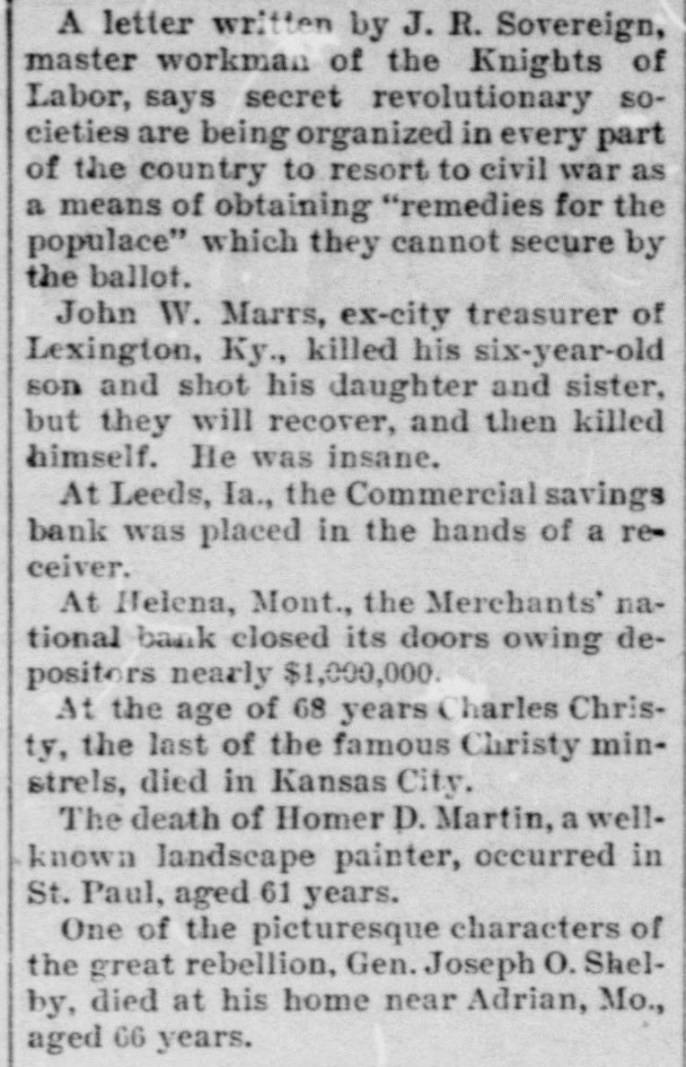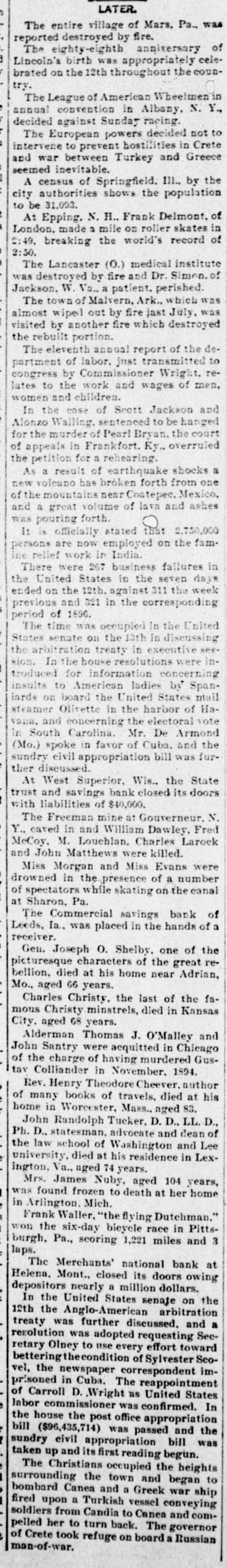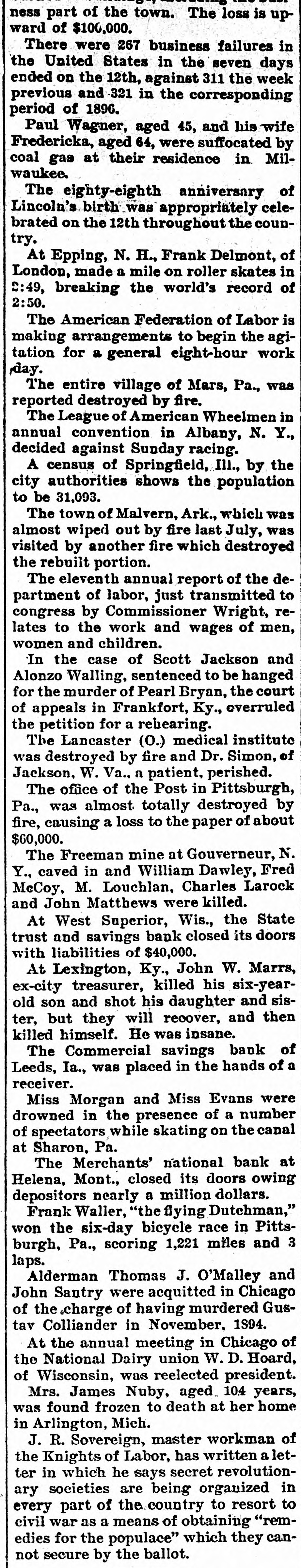 ness part of the town. The loss is upward of $100,000. There were 267 business failures in the United States in the seven days ended on the 12th, against 311 the week previous and 321 in the corresponding period of 1896. Paul Wagner, aged 45, and his wife Fredericka, aged 64, were suffocated by coal gas at their residence in Milwaukee. The eighty-eighth anniversary of Lincoln's birth was appropriately celebrated on the 12th throughout the country. At Epping, N. H., Frank Delmont, of London, made a mile on roller skates in 2:49, breaking the world's record of 2:50. The American Federation of Labor is making arrangements to begin the agitation for a general eight-hour work day. The entire village of Mars, Pa., was reported destroyed by fire. The League of American Wheelmen in annual convention in Albany, N. Y., decided against Sunday racing. A census of Springfield, III., by the city authorities shows the population to be 31,093. The town of Malvern, Ark., which was almost wiped out by fire last July, was visited by another fire which destroyed the rebuilt portion. The eleventh annual report of the department of labor, just transmitted to congress by Commissioner Wright, relates to the work and wages of men, women and children. In the case of Scott Jackson and Alonzo Walling, sentenced to be hanged for the murder of Pearl Bryan, the court of appeals in Frankfort, Ky., overruled the petition for a rebearing. The Lancaster (O.) medical institute was destroyed by fire and Dr. Simon, of Jackson, W. Va., a patient, perished. The office of the Post in Pittsburgh, Pa., was almost totally destroyed by fire, causing a loss to the paper of about $60,000. The Freeman mine at Gouverneur, N. Y., caved in and William Dawley, Fred McCoy, M. Louchlan, Charles Larock and John Matthews were killed. At West Superior, Wis., the State trust and savings bank closed its doors with liabilities of $40,000. At Lexington, Ky., John W. Marrs, ex-city treasurer, killed his six-yearold son and shot his daughter and sister, but they will recover, and then killed himself. He was insane. The Commercial savings bank of Leeds, Ia., was placed in the hands of a receiver. Miss Morgan and Miss Evans were drowned in the presence of a number of spectators while skating on the canal at Sharon. Pa. The Merchants' national bank at Helena, Mont., closed its doors owing depositors nearly a million dollars. Frank Waller, "the flying Dutchman," won the six-day bicycle race in Pittsburgh, Pa., scoring 1,221 miles and 3 laps. Alderman Thomas J. O'Malley and John Santry were acquitted in Chicago of the charge of having murdered Gustav Colliander in November. 1S94. At the annual meeting in Chicago of the National Dairy union W. D. Hoard, of Wisconsin, was reelected president. Mrs. James Nuby, aged. 104 years, was found frozen to death at her home in Arlington, Mich. J. R. Sovereign, master workman of the Knights of Labor, has written a letter in which he says secret revolutionary societies are being organized in every part of the country to resort to civil war as a means of obtaining "remedies for the populace" which they cannot secure by the ballot.