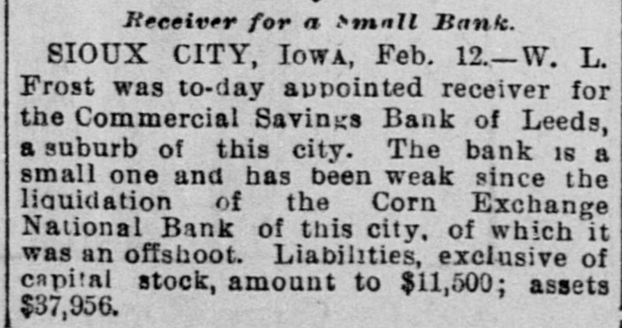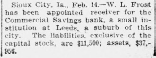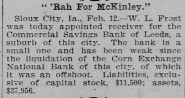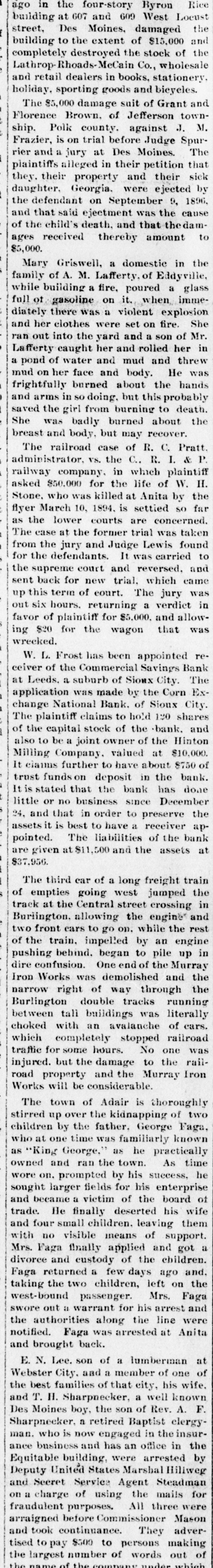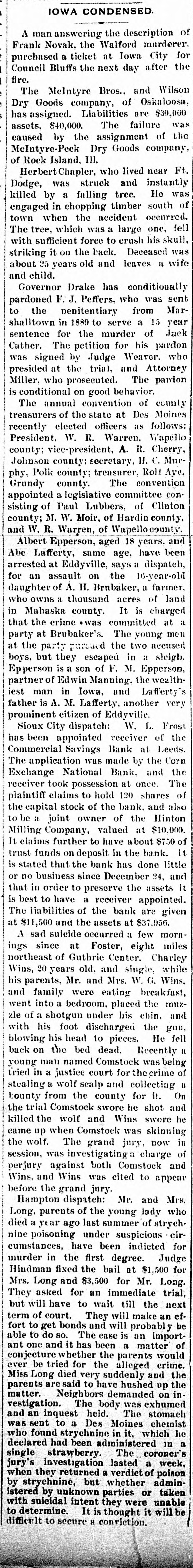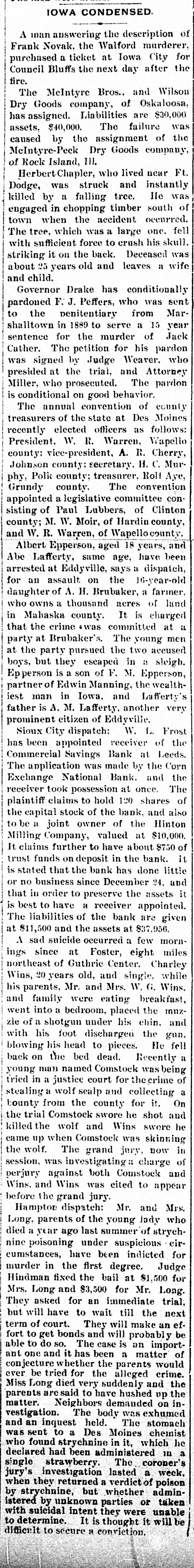 ness part of the town. The loss is upward of $100,000. There were 267 business failures in the United States in the seven days ended on the 12th, against 311 the week previous and 321 in the corresponding period of 1896. Paul Wagner, aged 45, and his wife Fredericka, aged 64, were suffocated by coal gas at their residence in Milwaukee. The eighty-eighth anniversary of Lincoln's birth was appropriately celebrated on the 12th throughout the country. At Epping, N. H., Frank Delmont, of London, made a mile on roller skates in 2:49, breaking the world's record of 2:50. The American Federation of Labor is making arrangements to begin the agitation for a general eight-hour work day. The entire village of Mars, Pa., was reported destroyed by fire. The League of American Wheelmen in annual convention in Albany, N. Y., decided against Sunday racing. A census of Springfield, III., by the city authorities shows the population to be 31,093. The town of Malvern, Ark., which was almost wiped out by fire last July, was visited by another fire which destroyed the rebuilt portion. The eleventh annual report of the department of labor, just transmitted to congress by Commissioner Wright, relates to the work and wages of men, women and children. In the case of Scott Jackson and Alonzo Walling, sentenced to be hanged for the murder of Pearl Bryan, the court of appeals in Frankfort, Ky., overruled the petition for a rebearing. The Lancaster (O.) medical institute was destroyed by fire and Dr. Simon, of Jackson, W. Va., a patient, perished. The office of the Post in Pittsburgh, Pa., was almost totally destroyed by fire, causing a loss to the paper of about $60,000. The Freeman mine at Gouverneur, N. Y., caved in and William Dawley, Fred McCoy, M. Louchlan, Charles Larock and John Matthews were killed. At West Superior, Wis., the State trust and savings bank closed its doors with liabilities of $40,000. At Lexington, Ky., John W. Marrs, ex-city treasurer, killed his six-yearold son and shot his daughter and sister, but they will recover, and then killed himself. He was insane. The Commercial savings bank of Leeds, Ia., was placed in the hands of a receiver. Miss Morgan and Miss Evans were drowned in the presence of a number of spectators while skating on the canal at Sharon. Pa. The Merchants' national bank at Helena, Mont., closed its doors owing depositors nearly a million dollars. Frank Waller, "the flying Dutchman," won the six-day bicycle race in Pittsburgh, Pa., scoring 1,221 miles and 3 laps. Alderman Thomas J. O'Malley and John Santry were acquitted in Chicago of the charge of having murdered Gustav Colliander in November. 1S94. At the annual meeting in Chicago of the National Dairy union W. D. Hoard, of Wisconsin, was reelected president. Mrs. James Nuby, aged. 104 years, was found frozen to death at her home in Arlington, Mich. J. R. Sovereign, master workman of the Knights of Labor, has written a letter in which he says secret revolutionary societies are being organized in every part of the country to resort to civil war as a means of obtaining "remedies for the populace" which they cannot secure by the ballot.