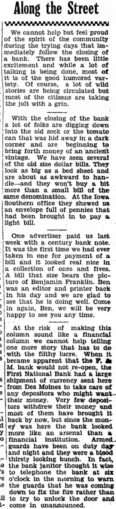 the We cannot help but feel proud of the spirit of the community during the trying days that immediately follow the closing of bank. There has been little excitement and while lot talking is being done, most of is of the good humored variety. Of course, lot of wild stories are being circulated but most of the citizens are taking the jolt with a grin. With the closing of the bank lot of folks are digging down into the old sock or the tomato can that was hid away in dark corner and are beginning to bring forth money of an ancient vintage. We have seen several of the old size dollar bills. They look as big as a bed sheet and are about as awkward to hanthey won't buy bit more than small bill of the same denomination. At the Iowa Southern office they showed us envelope full of pennies that had been brought in to pay light bill. One advertiser paid us last week with century bank note. was the first time had ever taken in one for payment of bill and looked real nice in collection of ones and fives. bill that size bears the picture of Benjamin Franklin. Ben was an editor and printer back his day and are glad to that he doing well. Come in again, Ben, we will be very happy to see you any time. At the risk of making this column sound like financial column we cannot help telling more story that has to do with the filthy lucre. When became apparent that the bank would not re-open, the First National Bank had large shipment of currency sent here from Des Moines to take care of any depositors who might their money. Very few depositors withdrew their money and most of them have brought back by now, but since the monwas here the bank looked like an arsenal than financial guards have been on duty day and night and they were blood looking bunch. In fact, the bank janitor thought it wise telephone the bank at six o'clock in the morning to warn the guards that he was coming down to fix the fire rather than to try to unlock the door and in unannounced.