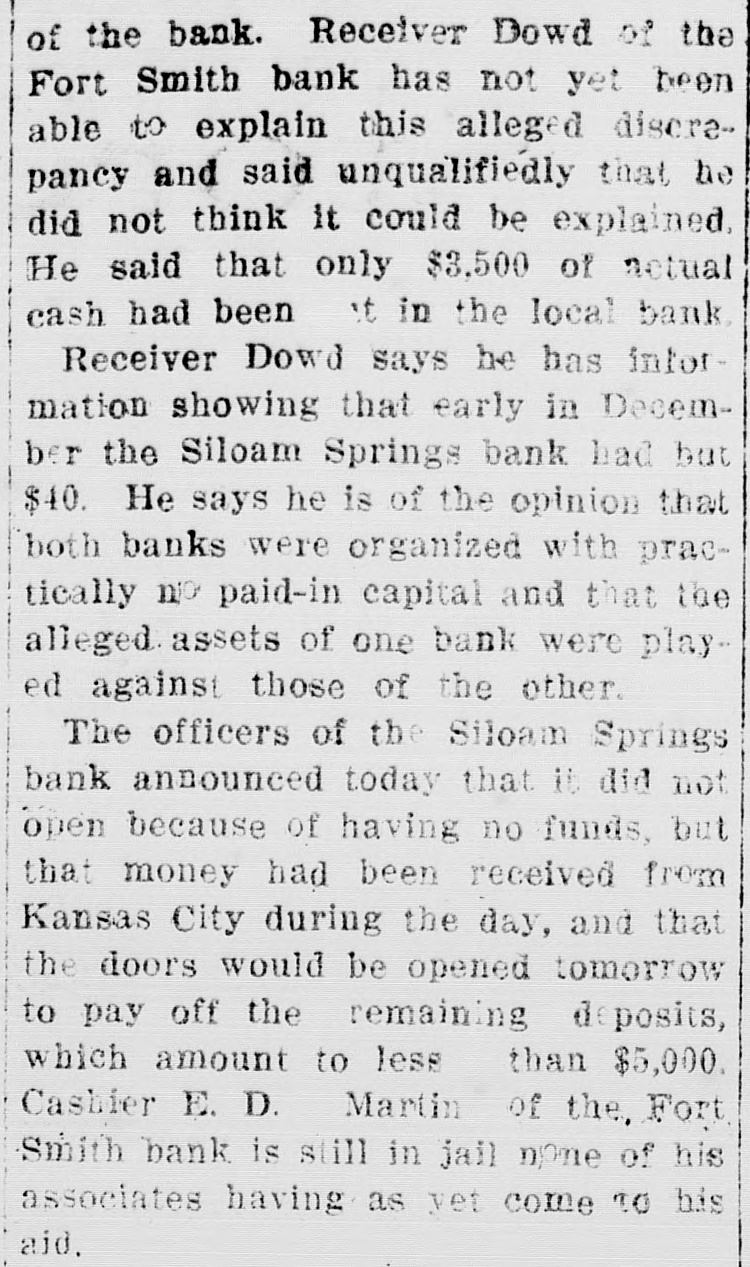 of the bank. Receiver Dowd of the Fort Smith bank has not yet been able to explain this alleged discrepancy and said unqualifiedly that be did not think it could be explained. He said that only $3,500 of actual cash had been it in the local bank. Receiver Dowd says he has information showing that early in December the Siloam Springs bank had but $40. He says he is of the opinion that both banks were organized with practically njo paid-in capital and that the alleged assets of one bank were played against those of the other. The officers of the Siloam Springs bank announced today that it did not open because of having no funds, but that money had been received from Kansas City during the day, and that the doors would be opened tomorrow to pay off the remaining deposits, which amount to less than $5,000. Cashier E. D. Martin of the, Fort Smith bank is still in jail none of his associates having as yet come TO his aid.