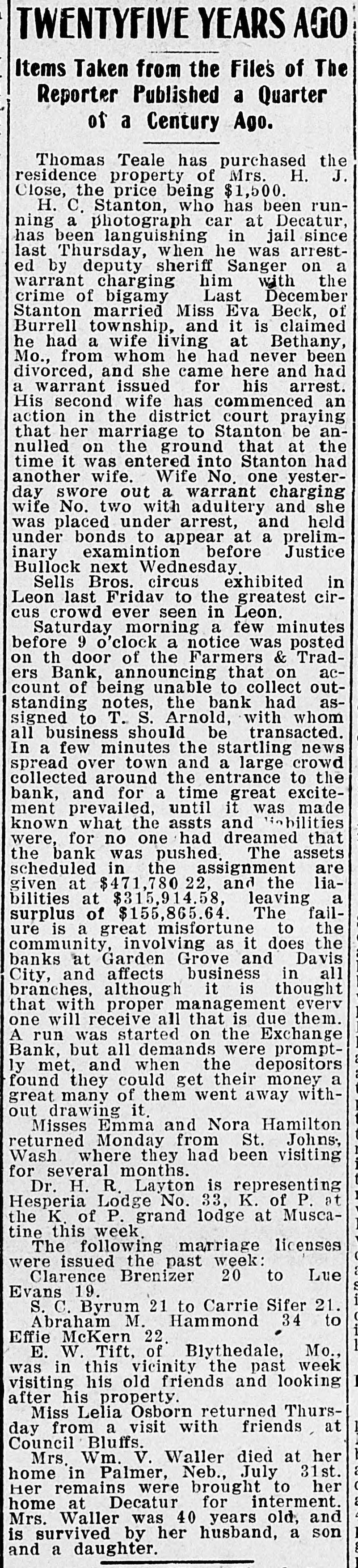 TWENTYFIVE YEARS AGO Items Taken from the Files of The Reporter Published a Quarter of a Century Ago. Thomas Teale has purchased the residence property of Mrs. H. J. Close, the price being $1,500. H. C. Stanton, who has been running a photograph car at Decatur, has been languishing in jail since last Thursday, when he was arrested by deputy sheriff Sanger on a warrant charging him with the crime of bigamy Last December Stanton married Miss Eva Beck, of Burrell township, and it is claimed he had a wife living at Bethany, Mo., from whom he had never been divorced, and she came here and had a warrant issued for his arrest. His second wife has commenced an action in the district court praying that her marriage to Stanton be annulled on the ground that at the time it was entered into Stanton had another wife. Wife No. one yesterday swore out a warrant charging wife No. two with adultery and she was placed under arrest, and held under bonds to appear at a preliminary examintion before Justice Bullock next Wednesday. Sells Bros. circus exhibited in Leon last Fridav to the greatest circus crowd ever seen in Leon. Saturday morning a few minutes before 9 o'clock a notice was posted on th door of the Farmers & Traders Bank. announcing that on account of being unable to collect outstanding notes, the bank had assigned to T. S. Arnold, with whom all business should be transacted. In a few minutes the startling news spread over town and a large crowd collected around the entrance to the bank, and for a time great excitement prevailed, until it was made known what the assts and bilities were, for no one had dreamed that the bank was pushed. The assets scheduled in the assignment are given at $471,780 22, and the liabilities at $315,914.58, leaving a surplus of $155,865.64. The failure is a great misfortune to the community, involving as it does the banks at Garden Grove and Davis City, and affects business in all branches, although it is thought that with proper management every one will receive all that is due them. A run was started on the Exchange Bank, but all demands were promptly met, and when the depositors found they could get their money a great many of them went away without drawing it Misses Emma and Nora Hamilton returned Monday from St. Johns, Wash where they had been visiting for several months. Dr. H. R. Layton is representing Hesperia Lodge No. 33, K. of P. at the K. of P. grand lodge at Muscatine this week The following marriage licenses were issued the past week: Clarence Brenizer 20 to Lue Evans 19. S. C. Byrum 21 to Carrie Sifer 21. Abraham M. Hammond 34 to Effie McKern 22 E. W. Tift, of Blythedale, Mo., was in this vicinity the past week visiting his old friends and looking after his property. Miss Lelia Osborn returned Thursday from a visit with friends at Council Bluffs. Mrs. Wm. V. Waller died at her home in Palmer, Neb., July 31st. Her remains were brought to her home at Decatur for interment. Mrs. Waller was 40 years old, and is survived by her husband, a son and a daughter.
