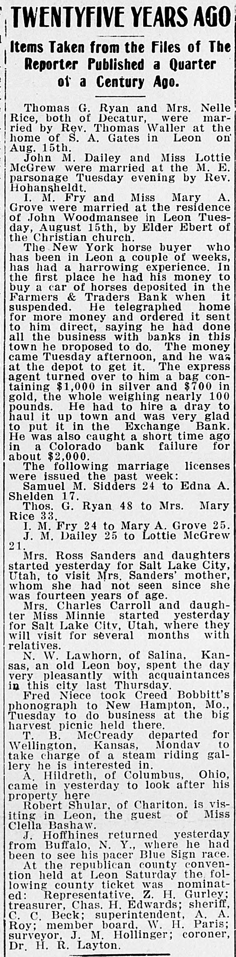 TWENTYFIVE YEARS AGO Items Taken from the Files of The Reporter Published a Quarter 01 a Century Ago. Thomas G. Ryan and Mrs. Nelle Rice, both of Decatur, were married by Rev. Thomas Waller at the home of S. A. Gates in Leon on Aug. 15th. John M. Dailey and Miss Lottie McGrew were married at the M. E. parsonage Tuesday evening by Rev. Hohansheldt. I. M. Fry and Miss Mary A. Grove were married at the residence of John Woodmansee in Leon Tuesday, August 15th, by Elder Ebert of the Christian church. The New York horse buyer who has been in Leon a couple of weeks, has had a harrowing experience. In the first place he had his money to buy a car of horses deposited in the Farmers & Traders Bank when it suspended. He telegraphed home for more money and ordered it sent to him direct, saying he had done with to do. money town all the he business proposed banks The in this came Tuesday afternoon, and he was the depot to get it. The express turned over to a agent at him and bag $700 con- in taining $1,000 in silver gold, the whole weighing nearly 100 pounds. He had to hire a dray to it town and was very to it in the haul put up Exchange time Bank. glad He was also caught a short ago in a Colorado bank failure for about $2,000. The following marriage licenses were issued the past week: Samuel M. Sidders 24 to Edna A. Shelden 17. Thos. G. Ryan 48 to Mrs. Mary Rice 33. I. M. Fry 24 to Mary A. Grove 25. J. M. Dailey 25 to Lottie McGrew 21. Mrs. Ross Sanders and daughters started yesterday for Salt Lake City, Utah, to visit Mrs. Sanders' mother, whom she had not seen since she was fourteen years of age. Mrs. Charles Carroll and daughter Miss Minnie started yesterday for Salt Lake Citv, Utah, where they will visit for several months with relatives. N. W. Lawhorn, of Salina, Kansas, an old Leon boy, spent the day very pleasantly with acquaintances in this city last Thursday. Fred Niece took Creed Bobbitt's phonograph to New Hampton, Mo., Tuesday to do business at the big harvest picnic held there. T. B. McCready departed for Wellington, Kansas, Mondav to take charge of a steam riding gallery he is interested in. A. Hildreth, of Columbus, Ohio, came in yesterday to look after his property here Robert Shular, of Chariton. is visiting in Leon, the guest of Miss Clella Bashaw. J. Hoffhines returned yesterday from Buffalo, N. Y., where he had been to see his pacer Blue Sign race. At the republican county convenLeon Saturday ticket was tion lowing held county at nominat- the foled: Representative. Z. H. Gurley: treasurer, Chas. H. Edwards; sheriff, member board, C. Roy; C. Beck; superintendent, W. H. Paris; A. A. surveyor, J. M. Hollinger; coroner, Dr. H. R. Layton.
