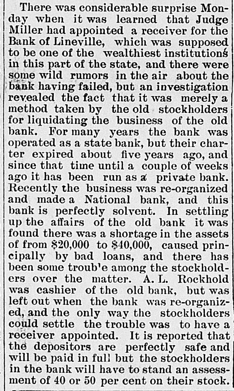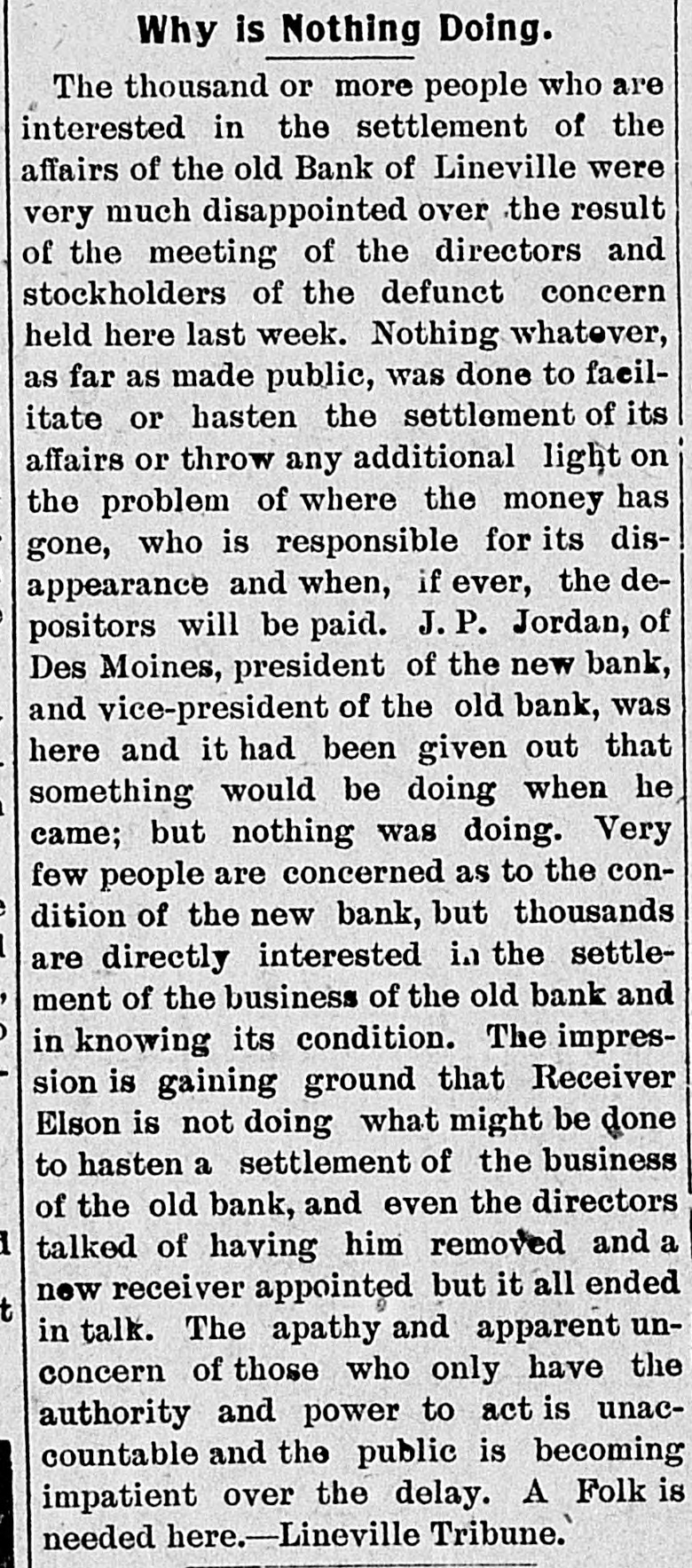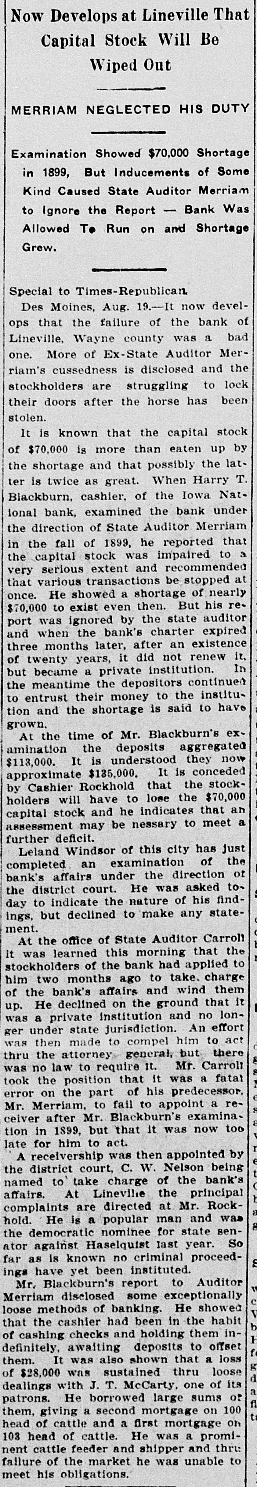 Now Develops at Lineville That Capital Stock Will Be Wiped Out MERRIAM NEGLECTED HIS DUTY Examination Showed $70,000 Shortage in 1899, But Inducements of Some Kind Caused State Auditor Merriam to Ignore the Report - Bank Was Allowed To Run on and Shortage Grew. Special to Times-Republican Des Moines, Aug. 19.--It now develops that the failure of the bank of Lineville, Wayne county was a bad one. More of Ex-State Auditor Merriam's cussedness is disclosed and the stockholders are struggling to lock their doors after the horse has been stolen. It is known that the capital stock of $70,000 is more than eaten up by the shortage and that possibly the lat. ter is twice as great. When Harry T. Blackburn, cashier, of the Iowa NatIonal bank, examined the bank under the direction of State Auditor Merriam in the fall of 1899, he reported that the capital stock was impaired to a very serious extent and recommended that various transactions be stopped at once. He showed a shortage of nearly $70,000 to exist even then. But his report was ignored by the state auditor and when the bank's charter expired three months later, after an existence of twenty years, it did not renew it. but became a private institution. In the meantime the depositors continued to entrust their money to the institution and the shortage is said to have grown. At the time of Mr. Blackburn's examination the deposits aggregated $113,000. It is understood they now approximate $135,000. It is conceded by Cashier Rockhold that the stockholders will have to lose the $70,000 capital stock and he indicates that an assessment may be nessary to meet a further deficit. Leland Windsor of this city has just completed an examination of the bank's affairs under the direction of the district court. He was asked today to indicate the nature of his findings, but declined to make any statement. At the office of State Auditor Carroll it was learned this morning that the stockholders of the bank had applied to him two months ago to take. charge of the bank's affairs and wind them up. He declined on the ground that it was a private institution and no longer under state jurisdiction. An effort was then made to compel him to act thru the attorney general, but there was no law to require it. Mr. Carroll took the position that it was a fatal error on the part of his predecessor. Mr. Merriam, to fail to appoint a receiver after Mr. Blackburn's examination in 1899, but that it was now too late for him to act. A receivership was then appointed by the district court, C. W. Nelson being named to take charge of the bank's affairs. At Linevilie the principal complaints are directed at Mr. Rockhold. He is a popular man and was the democratic nominee for state senator against Haselquist last year. So far as is known no criminal proceedings have yet been instituted. Mr. Blackburn's report to Auditor Merriam disclosed some exceptionally loose methods of banking. He showed that the cashier had been in the habit of cashing checks and holding them indefinitely, awaiting deposits to offset f them. It was also shown that a loss of $28,000 was sustained thru loose dealings with J. T. McCarty, one of its patrons. He borrowed large sums of them, giving a second mortgage on 100 t head of cattle and a first mortgage on 103 head of cattle. He was a prominent cattle feeder and shipper and thru failure of the market he was unable to meet his obligations.
