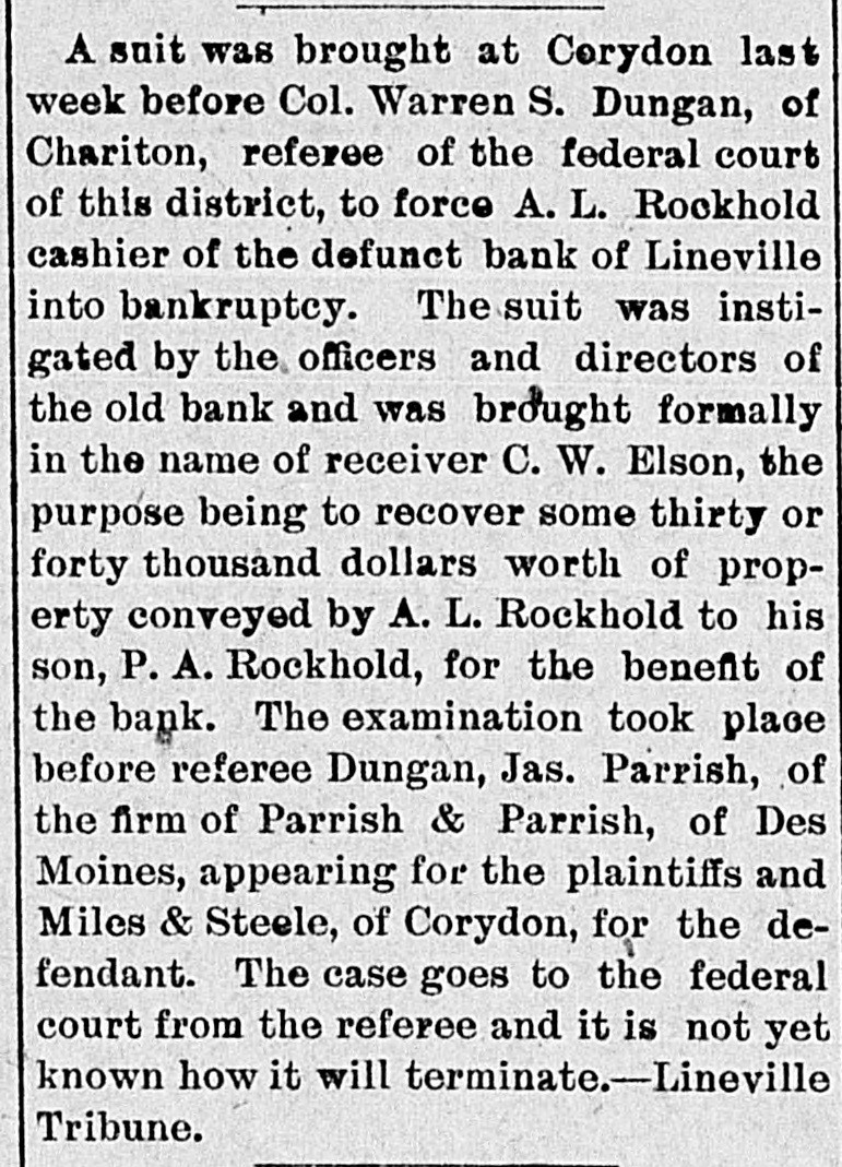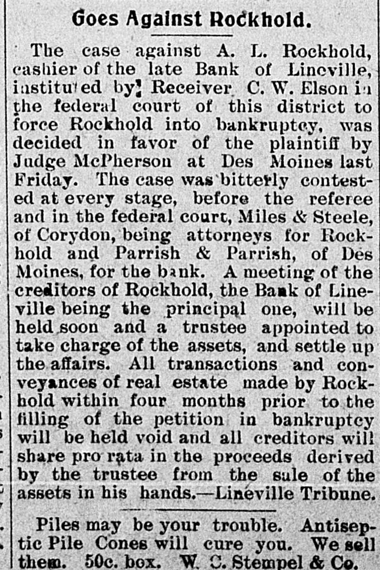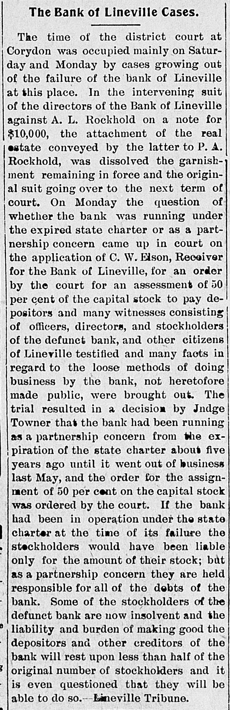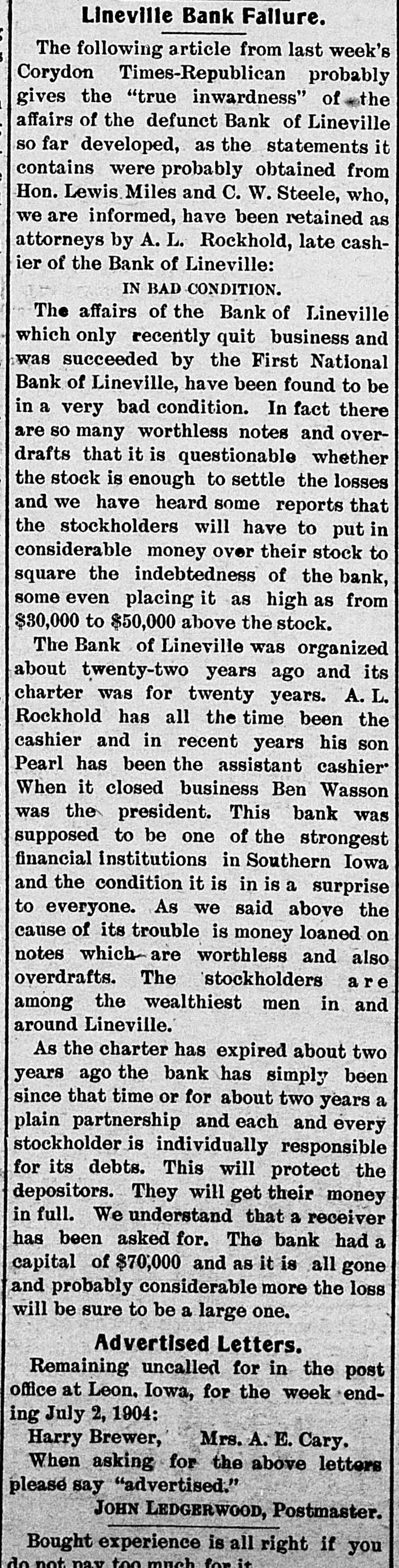 Now Develops at Lineville That Capital Stock Will Be Wiped Out MERRIAM NEGLECTED HIS DUTY Examination Showed $70,000 Shortage in 1899, But Inducements of Some Kind Caused State Auditor Merriam to Ignore the Report - Bank Was Allowed To Run on and Shortage Grew. Special to Times-Republican Des Moines, Aug. 19.--It now develops that the failure of the bank of Lineville, Wayne county was a bad one. More of Ex-State Auditor Merriam's cussedness is disclosed and the stockholders are struggling to lock their doors after the horse has been stolen. It is known that the capital stock of $70,000 is more than eaten up by the shortage and that possibly the lat. ter is twice as great. When Harry T. Blackburn, cashier, of the Iowa NatIonal bank, examined the bank under the direction of State Auditor Merriam in the fall of 1899, he reported that the capital stock was impaired to a very serious extent and recommended that various transactions be stopped at once. He showed a shortage of nearly $70,000 to exist even then. But his report was ignored by the state auditor and when the bank's charter expired three months later, after an existence of twenty years, it did not renew it. but became a private institution. In the meantime the depositors continued to entrust their money to the institution and the shortage is said to have grown. At the time of Mr. Blackburn's examination the deposits aggregated $113,000. It is understood they now approximate $135,000. It is conceded by Cashier Rockhold that the stockholders will have to lose the $70,000 capital stock and he indicates that an assessment may be nessary to meet a further deficit. Leland Windsor of this city has just completed an examination of the bank's affairs under the direction of the district court. He was asked today to indicate the nature of his findings, but declined to make any statement. At the office of State Auditor Carroll it was learned this morning that the stockholders of the bank had applied to him two months ago to take. charge of the bank's affairs and wind them up. He declined on the ground that it was a private institution and no longer under state jurisdiction. An effort was then made to compel him to act thru the attorney general, but there was no law to require it. Mr. Carroll took the position that it was a fatal error on the part of his predecessor. Mr. Merriam, to fail to appoint a receiver after Mr. Blackburn's examination in 1899, but that it was now too late for him to act. A receivership was then appointed by the district court, C. W. Nelson being named to take charge of the bank's affairs. At Linevilie the principal complaints are directed at Mr. Rockhold. He is a popular man and was the democratic nominee for state senator against Haselquist last year. So far as is known no criminal proceedings have yet been instituted. Mr. Blackburn's report to Auditor Merriam disclosed some exceptionally loose methods of banking. He showed that the cashier had been in the habit of cashing checks and holding them indefinitely, awaiting deposits to offset f them. It was also shown that a loss of $28,000 was sustained thru loose dealings with J. T. McCarty, one of its patrons. He borrowed large sums of them, giving a second mortgage on 100 t head of cattle and a first mortgage on 103 head of cattle. He was a prominent cattle feeder and shipper and thru failure of the market he was unable to meet his obligations.