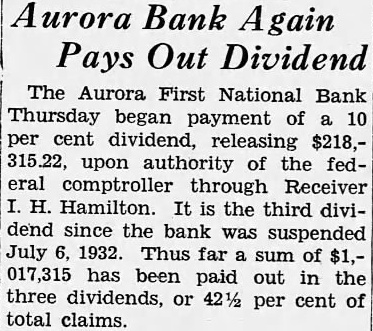The Aurora First National Bank Thursday began payment of ... dividend, releasing upon authority of the comptroller through Receiver Hamilton. It the third ... since the bank suspended ... Thus far ... has been paid out in the three dividends ... claims. (The True Republican, 1933-09-23).