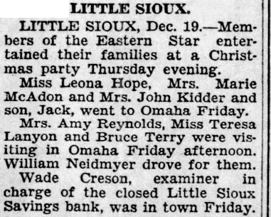 LITTLE SIOUX. LITTLE SIOUX, Dec. 19.-Members of the Eastern Star entertained their families at a Christmas party Thursday evening. Miss Leona Hope, Mrs. Marie McAdon and Mrs. John Kidder and son, Jack, went to Omaha Friday. Mrs. Amy Reynolds, Miss Teresa Lanyon and Bruce Terry were visiting in Omaha Friday afternoon. William Neidmyer drove for them. Wade Creson, examiner in charge of the closed Little Sioux Savings bank, was in town Friday.