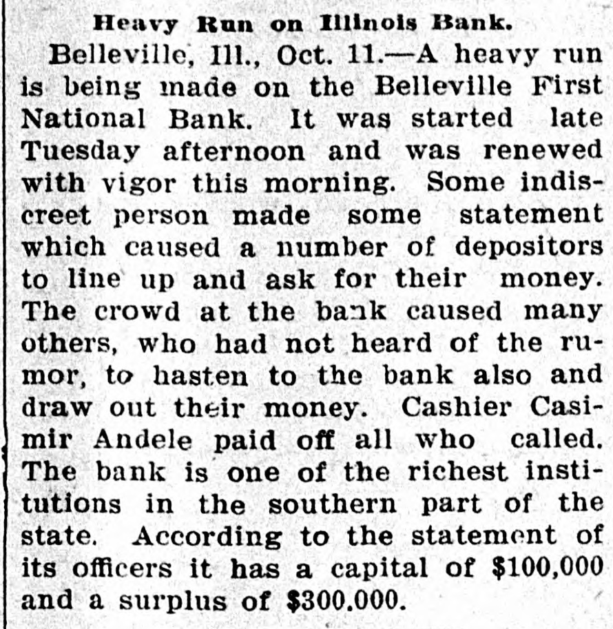 DUE TO A WILD STATEMENT. A Run On the First National Bank of Belleville, III., Caused by Indiscreet Remark. St. Louis, Oct. 10.-There was considerable excitement, Tuesday, in Belleville, III., for an hour or more on account of a run on the First national bank. Some indiscreet person made a statement which caused a number of depositors to line up and ask for their money. The crowd at the bank caused many others who had not heard of the rumor to hasten to the bank also and draw out their money. President Andel paid off all who called. He then addressed the crowd, and stated that anyone who was not satisfied and did not have confidence in the bank could cΓ²me forward and get deposited money. The statement pacified the people. A number of the men and women who had drawn out their money redeposited it and the incident closed. The First national bank of Belleville is one of the richest institutions in the southern part of the state. It has a capital of $100,000 and a surplus of $300,000. The bank pays taxes on $400,000.