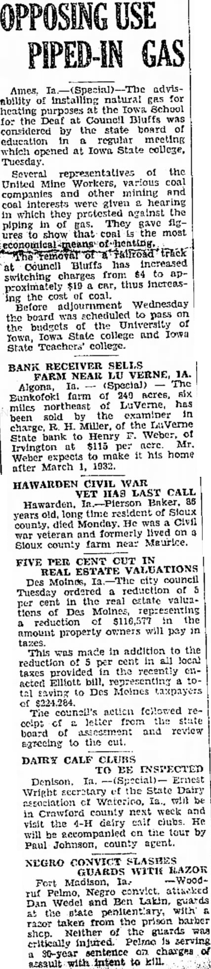 OPPOSING PIPED-IN GAS advisability of installing natural gas for heating purposes the Iowa School for the Deaf at Council Bluffs was considered by the state board regular meeting education which opened at Iowa State college, Tuesday. Several representatives of the United Mine Workers, various coal companies and other mining and coal interests were given hearing in which they protested against the in of gas. They gave piping ures to show that coal the most Bluffs has increased Council from $4 to apswitching charges $19 thus the cost of coal. ing adjournment Wednesday Before board was to pass the University of the budgets of Yown, Iowa State college and Iowa State Teachers' college. BANK RECEIVER SELLS FARM NEAR LU VERNE, 1A. (Special) The Algona, 240 acres, six farm of miles northeast of LuVerne, has the examiner been sold of the LaVerne R. H. Miller, Weber, of State bank to Henry Mr. at $115 per Irvington make it his home Weber expects to after March 1932. HAWARDEN CIVIL WAR HAS LAST CALL VET 85 Hawarden. years old, long time resident of Stoux county, died Monday. He was Civil and formerly lived war veteran Stoux county farm near Maurice. FIVE PER CENT CUT IN REAL ESTATE city council Des Moines, ordered reduction of Tuesday in the real estate valuaper cent tions Des Moines, representing $116,577 the reduction amount property owners will pay in taxes. This was made in addition to the cent in all local reduction per taxes provided recently onacted Elliott bill, representing total to Des Moines taxpayers of The council's action followed receipt of = letter from the state assessment and review board of to the cut. agreeing DAIRY CALF CLUBS TO BE INSPECTED of the State Dairy Wright secretary association of Waterico. Ia., will be in Crawford county next week and visit the 4-H delry salf clubs. He will be accompanied on the tour by Paul Johnson, county agent. CONVICT SLASHES NEGRO GUARDS WITH Fort Madison, convict. attacked ruf Pelmo, Negro Dan Wedel and Ben Lakin, with at the state razor taken from the prison barber Neither of the guards was Pelmo serving critically sentence on charges with intent to kill.