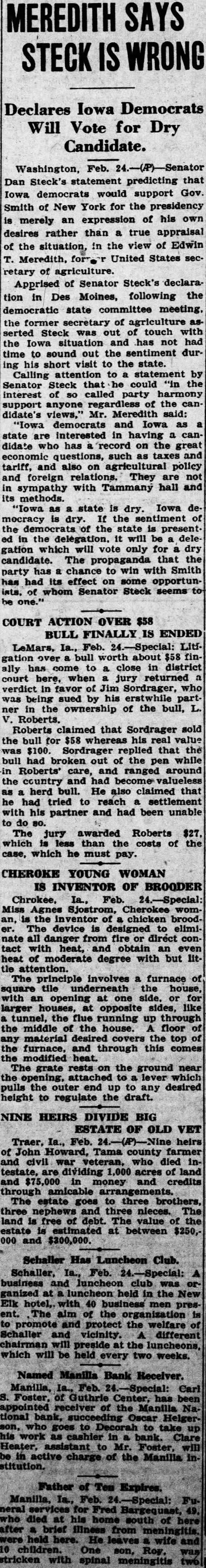 Washington, Dan Steck's statement predicting that Iowa democrats would support Gov. Smith of New York for the presidency merely an expression of his own desires rather than true appraisal the situation, in the view of Edwin Meredith, United States secretary of agriculture. Apprised of Senator Steck's declaraMoines, following the tion in Des democratic state committee meeting, the former secretary of agriculture serted Steck was out touch the Iowa and has not time to sound out the sentiment during his short visit to the state. Calling attention Senator Steck that could interest called party support anyone the didate's views," Mr. Meredith said: "Iowa democrats and Iowa as state are interested in didate has on the great such as taxes and tariff, and also on policy and foreign They are not sympathy with Tammany hall and its methods. "Iowa state is dry. Iowa deis the sentiment the state is presentthe delegation. will be delegation which will vote only for dry candidate. The propaganda party chance to win with Smith has had its effect on some opportunof whom Senator Steck