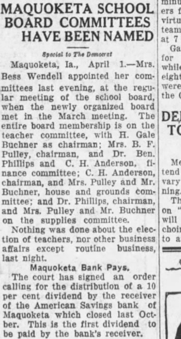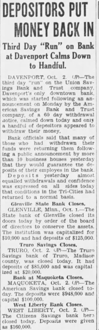 DEPOSITORS PUT MONEY BACK IN Third Day "Run" on Bank at Davenport Calms Down to Handful. third day "run" on the Union Savings Bank and Trust company. Davenport's only downtown bank which was started following an announcement on Monday by the American Savings Bank and Trust company. of 60 day withdrawal notice. calmed down today and only handful of depositors appeared to withdraw their money. Bank officials said that many of those who had withdrawn their funds were returning them following a public announcement by more than 10 business houses yesterday that they would guarantee the deposits of their employes in the bank yesterday almost equalled withdrawals and confidence was expressed on all sides today that conditions in the Tri-Cities had returned to a normal basis. Glenville State Bank Closes. GLENVILLE, Minn., Oct. The State bank of Glenville closed its doors today by order of the board of directors to conserve the assets. The institution was capitalized for $10,000 and had deposits of $125,000. Truro Savings Closes. TRURO, Oct. (P)-The Truro Savings bank of Truro, Madison county, was closed today. It had deposits of $85,000 and was capital ized at $20,000. Bank at Maquoketa Closes. MAQUOKETA, Oct. 2. American Savings bank closed today. The deposits were $948,000 and capital $100,000. West Liberty Bank Closes. WEST LIBERTY, Oct. 2. (P)The Citizens Savings bank hers closed today. Deposits were given as $160,000.