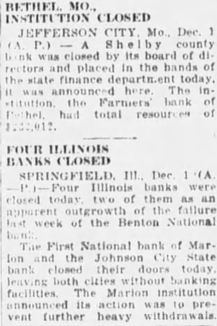 BETHEL MO., INSTITU CLOSED JEFFERSON Dec P.) county closed by its of rectors and placed the of the finance announced The the Farmers total resour of FOUR ILLINOIS CLOSED Dec Four Illinois banks were today of as an failure of the Benton National bank the State doors cities without The its vent further heavy