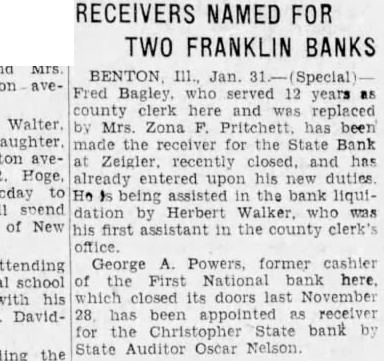 RECEIVERS NAMED FOR TWO FRANKLIN BANKS BENTON Ill., Jan. Fred Bagley. served 12 years county clerk here and replaced Mrs. Zona has been made the receiver for the State Bank Zeigler. recently closed, and has already entered upon his duties He being assisted the bank liquiby Herbert was his first assistant in the county clerk's George Powers. former cashier National here. which closed its doors last November appointed receiver for State bank State Auditor Oscar Nelson