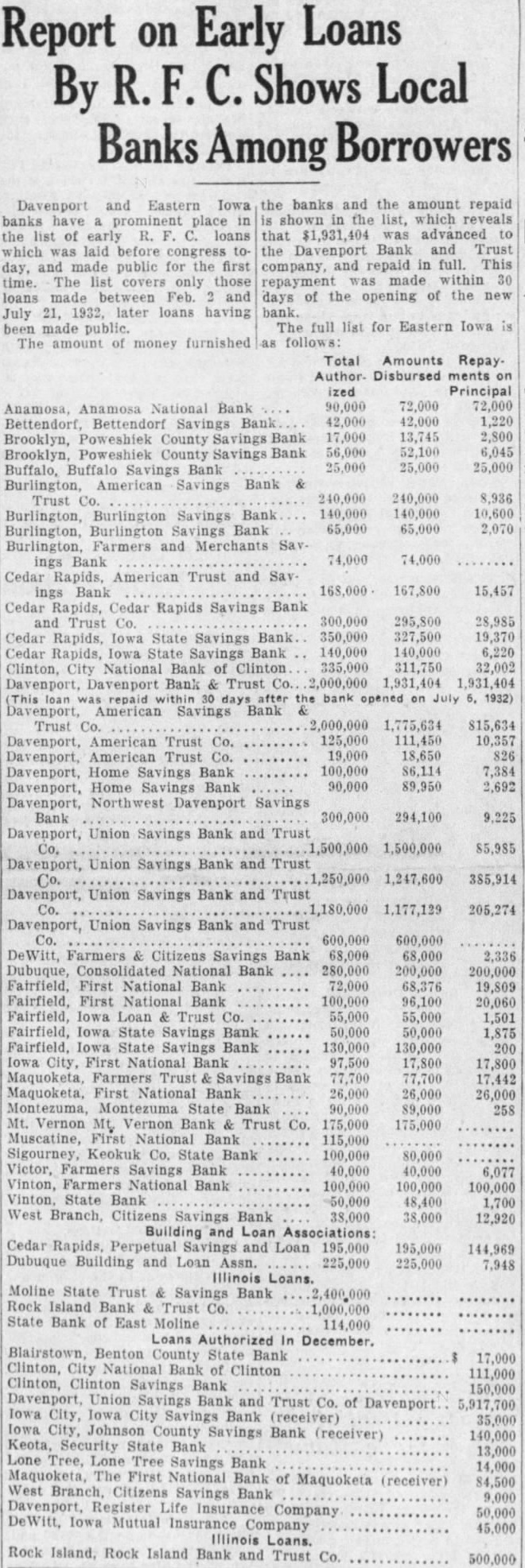 Banks Among Borrowers Davenport and Eastern banks have place the list of early loans which was laid before day, and made public for the first time. The list covers only those loans made between Feb. and July 21, 1932, later loans having been made public. The amount of money furnished banks and the amount repaid shown the list, which reveals that $1,931,404 was advanced the Davenport Bank and Trust and repaid in full. This company, repayment was made within 30 days of the opening of the new bank. The full list for Eastern Iowa follows: Total Amounts Disbursed ments ized Principal Anamosa, Anamosa National Bank 90,000 72,000 72,000 Bettendorf, Bettendorf Savings Bank 42,000 42,000 1,220 Brooklyn, Poweshiek County Bank 17,000 13,745 2,800 Brooklyn, Poweshiek County Savings Bank 56,000 52,100 6,045 Buffalo, Buffalo Savings Bank 25,000 25,000 25,000 Burlington, American Savings Bank Trust Co. 240,000 240,000 8,936 Burlington, Burlington Savings Bank 140,000 140,000 10,600 Burlington, Burlington Savings Bank 65,000 65,000 2,070 Burlington, Farmers and Merchants ings Bank 74,000 74,000 Cedar Rapids, American Trust and Savings Bank 168,000 167,800 15,457 Cedar Rapids, Cedar Rapids Savings Bank and Trust 300,000 295,800 28,985 Co. Cedar Rapids, Iowa State Savings Bank 350,000 327,500 19,370 Cedar Rapids, Iowa State Savings Bank 140,000 140,000 6,220 Clinton, City National Bank of Clinton 335,000 311,750 32,002 Davenport, Davenport Bank Trust 2,000,000 1,931,404 1,931,404 repaid the bank opened July 1932) Davenport, American Savings Bank Trust Co. 2,000,000 1,775,634 Davenport, American Trust Co. 125,000 111,450 10,357 Davenport, American Trust Co. 19,000 18,650 826 Davenport, Home Savings Bank 7,384 Davenport, Home Savings Bank 90,000 89,950 2,692 Davenport, Northwest Davenport Savings Bank 300,000 294,100 9,225 Davenport, Union Savings Bank and Trust 1,500,000 Davenport, Union Savings Bank and Trust 1,247,600 385,914 Davenport, Union Savings Bank and Trust 205,274 Davenport, Union Savings Bank and Trust Co. 600,000 600,000 DeWitt, Farmers Citizens Savings Bank 68,000 68,000 2,336 Dubuque, Consolidated National Bank 280,000 200,000 200,000 Fairfield, First National Bank 72,000 68,376 19,809 Fairfield, First National Bank 100,000 96,100 20,060 Fairfield, Iowa Loan Trust Co. 55,000 55,000 1,501 Fairfield, Iowa State Savings Bank 50,000 50,000 1,875 Fairfield, Iowa State Savings Bank 130,000 130,000 200 Iowa City, First National Bank 97,500 17,800 17,800 Maquoketa, Farmers Trust Savings Bank 77,700 77,700 17,442 Maquoketa, First National Bank 26,000 26,000 26,000 Montezuma, Montezuma State Bank 90,000 $9,000 258 Mt. Vernon Vernon Bank Trust Co. 175,000 175,000 Muscatine, First National Bank 115,000 Sigourney, Keokuk Co. State Bank 100,000 80,000 Victor, Farmers Savings Bank 40,000 40,000 6,077 Vinton, Farmers National Bank 100,000 100,000 100,000 State Bank 50,000 48,400 1,700 West Branch, Citizens Savings Bank 38,000 38,000 12,920 Building and Loan Cedar Rapids, Perpetual Savings and Loan 195,000 195,000 144,969 Dubuque Building and Loan Assn. 225,000 225,000 7,948 Illinois Loans. Moline State Trust Savings Bank Rock Island Bank Trust Co. 1,000,000 State Bank of East Moline 114,000 Loans Authorized In Blairstown, Benton County State Bank 17,000 Clinton, City National Bank of Clinton 111,000 Clinton, Clinton Savings Bank 150,000 Davenport, Union Savings Bank and Trust Co. of Davenport 5,917,700 Iowa City, Iowa City Savings Bank (receiver) 35,000 Iowa Johnson County Savings Bank (receiver) 140,000 Keota, Security State Bank 13,000 Lone Tree, Lone Tree Savings Bank 14,000 Maquoketa, The First National Bank of Maquoketa (receiver) 84,500 West Branch, Citizens Bank Savings 9,000 Davenport, Register Life Company 50,000 Iowa Mutual Insurance Company 45,000 Illinois Loans. Rock Island, Rock Island Bank and Trust Co. 500,000