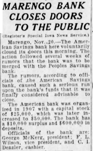 MARENGO BANK CLOSES DOORS TO THE PUBLIC (Register's Special Iowa News bank closed its doors this morning action rumors that the bank to merged with the Peoples Savings bank The rumors, according to officials of the American Savings serious run the bank's that was finally considered advisable The American bank was organ ized in 1907 with capital stock of $25 which was later creased to $50,000 The bank surplus and $600,000 deposits. Officials of the bank Wilson, vice president, and C. Denzler, cashier.