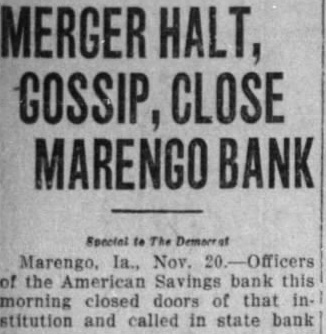 BANK CLOSES People's Savings Fails To Open Friday Morning (By Associated Press) MARENGO, Ia., Nov. the failure of the People's Savings bank to open here early Fri. day morning, Marengo is left without a single bank, the American Savings bank having closed its doors on November 20th, and the reorganization plans failing in their completion. Heavy runs have been noticed the People's bank since the closing of the American and unable to withstand the loses. The People's Savings bank was organized in 1905 with the late Arthur N. Vetty as president. After the death of Mr. Vetty the bank by Mr. Ole Olson, president, and Mr. Rouse, cashier. The capital stock was $100,000, deposits, good and the total resources estimated at $678,000.