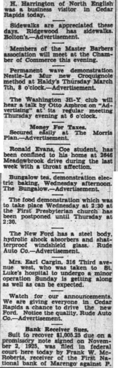 H. Harrington of North English was a business visitor in Cedar Rapids today. Sidewalks are appreciated these days. Ridgewood has sidewalks. Bolton's. Advertisement. Members of the Master Barbers association will meet at the Chamber of Commerce this evening. Permanent wave demonstration Nestle-Le Mur new Croquignole method at Haldy's Thursday March The Washington Hi-Y club will hear a talk by Otto Ambroz on "Advertising' at its regular meeting Thursday evening at 6 o'clock. Money For Taxes. Secured easily at The Morris Ronald Evans, Coe student, has been confined to his home at 2646 Meadowbrook drive during the last week with a throat affection. Bungalow tea, demonstration electric baking, Wednesday afternoon. The The food demonstration which was to take place Wednesday at 2:30 at the First Presbyterian church has 2:30. been postponed until Thursday at The New Ford has a steel body, hydrolic shock absorbers and shatterproof windshield glass. Rude Auto Co.-Advertisement. Mrs. Earl Cargin, 316 Third avenue west, who was taken to St. Luke's hospital to undergo a minor operation Sunday is getting along as well as can be expected. Watch for our announcements. We are giving everyone in Cedar Rapids a chance to drive the new Ford. Notice the quality. Rude Auto Co.-Advertisement. Bank Receiver Sues. Suit to recover $1,005.25 due on a promissory note signed on November 2, 1925, was filed in federal court here today by Frank W. McRoberts, receiver of the First National bank of Marengo against P.