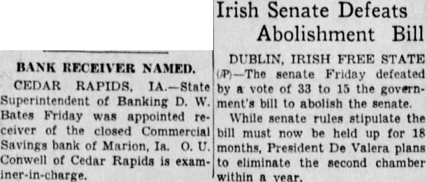Irish Senate Defeats Abolishment Bill DUBLIN, IRISH FREE STATE BANK RECEIVER NAMED. P)-The senate Friday defeated CEDAR RAPIDS. IA.-State by vote of 33 to 15 the governSuperintendent of Banking D. W. ment's bill to abolish the senate. Bates Friday was appointed re- While senate rules stipulate the ceiver of the closed Commercial bill must now be held up for 18 Savings bank of Marion, Ia. O.U. months, President De Valera plans Conwell of Cedar Rapids is exam- to eliminate the second chamber iner-in-charge. within year.