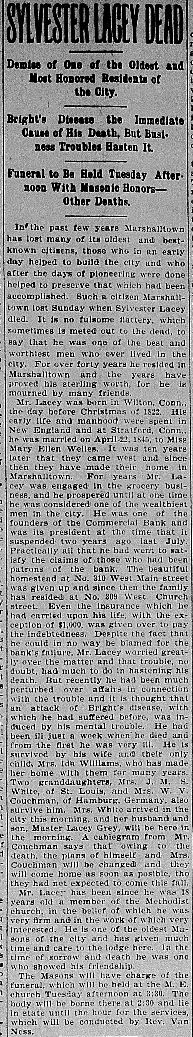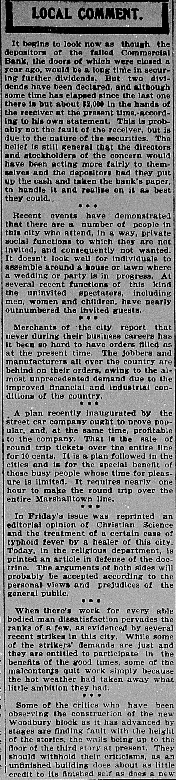 LOCAL COMMENT. It begins to look now as though the depositors of the failed Commercial Bank, the doors of which were closed a year ago, would be a long time in securing further dividends. But two dividends have been declared, and although some time has elapsed since the last one there is but about $2,000 in the hands of the reeciver at the present time, according to his own statement. This is probably not the fault of the receiver, but is due to the nature of the securities. The belief is still general that the directors and stockholders of the concern would have been acting more fairly to themselves and the depositors had they put up the cash and taken the bank's paper, to handle it and realize on it as best they could. Recent events have demonstrated that there are a number of people in this city who attend, in a way, private social functions to which they are not invited, and consequently not wanted. It doesn't look well for individuals to assemble around a house or lawn where a wedding or party is in progress. At several recent functions of this kind the uninvited spectators, including men, women and children, have nearly outnumbered the invited guests. Merchants of the city report that never during their business careers has it been so hard to have orders filled as at the present time. The jobbers and manufacturers all over the country are behind on their orders, owing to the almost unprecedented demand due to the improved financial and industrial conditions of the country. A plan recently inaugurated by the street car company ought to prove popular, and, at the same time, profitable to the company. That is the sale of round trip tickets over the entire line for 10 cents. It is a plan followed in the cities and is for the special benefit of those busy people whose time for pleasure is limited. It requires nearly one hour to make the round trip over the entire Marshalltown line. In Friday's Issue was reprinted an editorial opinion of Christian Science and the treatment of a certain case of typhoid fever by a healer of this city. Today, in the religious department, is printed an article in defense of the doctrine. The arguments of both sides will probably be accepted according to the personal views and prejudices of the general public. When there's work for every able bodied man dissatisfaction pervades the ranks of a few, as evidenced by several recent strikes in this city. While some of the strikers' demands are just and they are entitled to participate in the benefits of the good times, some of the malcontents quit work simply because the hot weather had taken away what little ambition they had. Some of the critics who have been observing the construction of the new Woodbury block as it has advanced by stages are finding fault with the height of the stories, the walls being up to the floor of the third story at present. They should withhold their criticisms, as an unfinished building does about as little credit to its finished self as does a new
