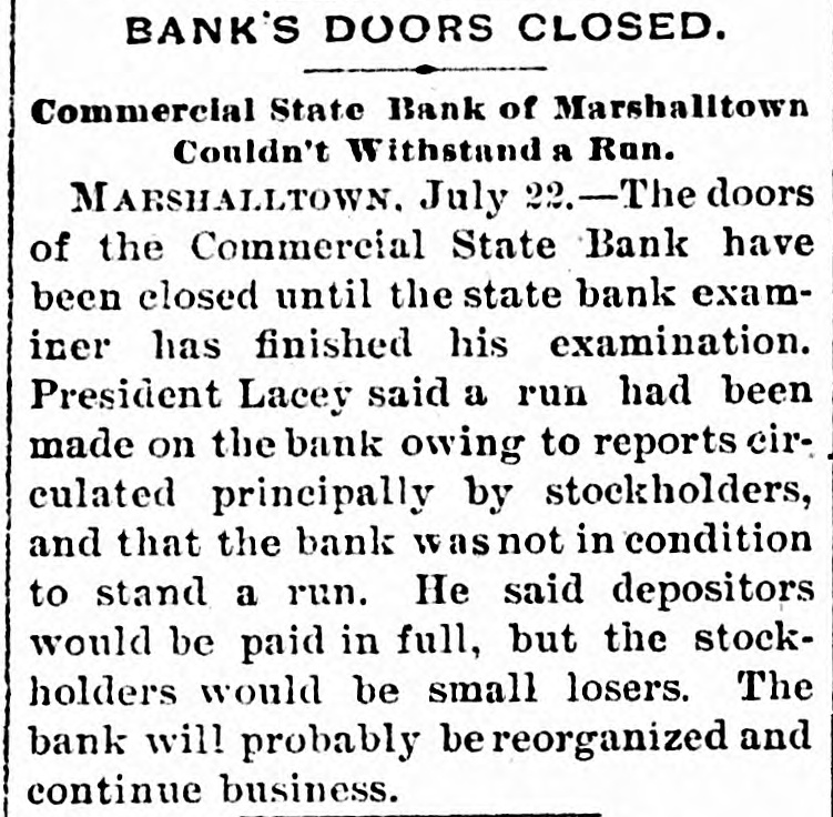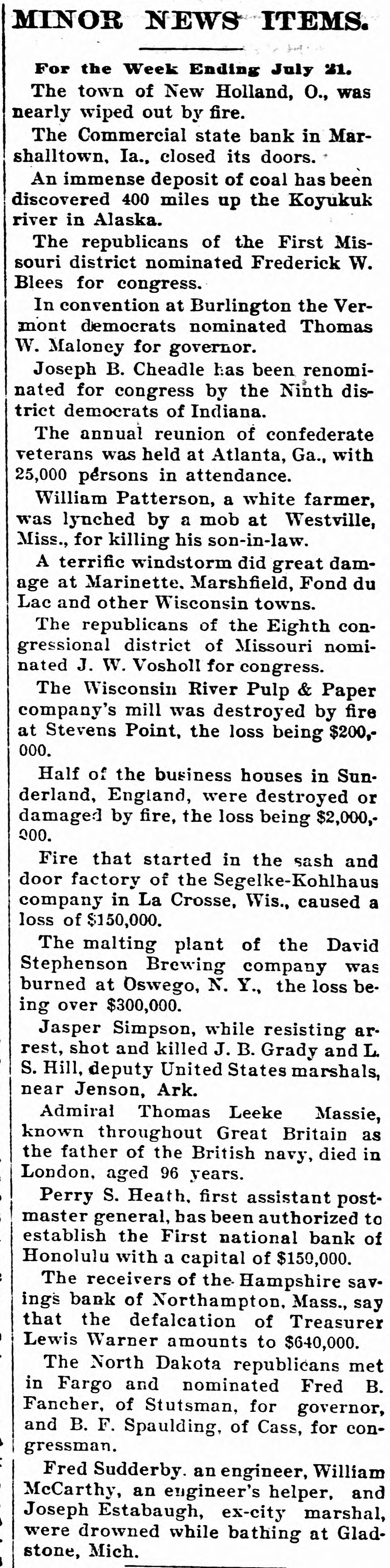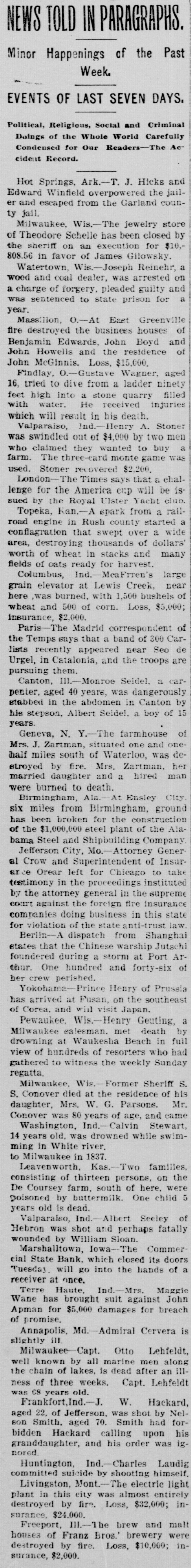 Minor Happenings of the Past Week. EVENTS OF LAST SEVEN DAYS. Political, Religious, Social and Criminal Doings of the Whole World Carefully Condensed for Our Readers-The Accident Record. Hot Springs, Ark.-T. J. Hicks and Edward Winfield overpowered the jailer and escaped from the Garland county jail. Milwaukee, Wis.-The jewelry store of Theodore Schelle has been closed by the sheriff on an execution for $10,808.56 in favor of James Gilowsky Watertown, Wis.-Joseph Reinehr, a wood and coal dealer, was arrested on a charge of forgery, pleaded guilty and a was sentenced to state prison for year. Massilion, 0.-At East Greenville fire destroyed the businees houses of Benjamin Edwards, John Boyd and John Howells and the residence of John McGinnis. Loss, $15,000. Findlay, 0.-Gustave Wagner, aged 16, tried to dive from a ladder ninety feet high into a stone quarry filled with water. He received injuries which will result in his death. Valparaiso, !nd.-Henry A. Stone: was swindled out of $4,000 by two men who claimed they wanted to buy a farm. The three-card monte game was used. Stoner recovered $2,200. London-The Times says that a challenge for the America cup will be issued by the Royal Ulster Yacht club. Topeka, Kan.-A spark from a railroad engine in Rush county started a conflagration that swept over a wide area, destroying thousands of dollars worth of wheat in stacks and many fields of oats ready for harvest. Columbus, Ind.-McaFrren's large grain elevator at Lewis Creek, near here ,was burned, with 1,500 bushels of wheat and 500 of corn. Loss, $5,000; insurance, $2.000. Paris-The Madrid correspondent of the Temps say that a band of 300 Carlists recently appeared near Seo de Urgel, in Catalonia, and the troops are pursuing them. Canton, Ill.- Monroe Seidel, a carpenter, aged 40 years, was dangerously stabbed in the abdomen in Canton by his stepson, Albert Seidel, a boy of 15 years. Geneva, N. Y.-The farmhouse of Mrs. J. Zartman, situated one and onehalf miles south of Waterloo, was deetroyed by fire. Mrs. Zartman, her married daughter and a hired man were burned to death. Birmingham, Ala.-At Ensley City six miles from Birmingham, ground has been broken for the construction of the $1,000,000 steel plant of the Alabama Steel and Shipbuilding Company Jefferson City, No.-Attorney General Crow and Superintendent of Insurance Orear left for Chicago to take testimony in the proceedings instituted by the attorney general in the supreme court against the foreign fire insurance companies doing business in this state for violation of the state anti-trust law. Berlin-A dispatch from Shanghai states that the Chinese warship Jutschi foundered during a storm at Port Arthur. One hundred and forty-six of her crew perished. Yokohama-Prince Henry of Prussia has arrived at Fusan, on the southeast of Corea. and will visit Japan. Pewaukee, Wis.-Henry Geuting, a Milwaukee salesman. met death by drowning at Waukesha Beach in fuil view of hundreds of resorters who had gathered to witness the weekly Sunday regatta, Milwaukee. Wis.-Former Sheriff S. S. Conover died at the residence of his daughter, Mrs. W. G. Parsons. Mr. Conover was 80 years of age, and came Washington, d.-Calvin Stewart, 14 years old. was drowned while swimming in White river. to Milwaukee in 1837. Leavenworth, Kas.-Two families, consisting of thirteen persons, on the De Coursey farm, south of here. were Doisoned by buttermilk. One child 5 years old is dead. Valparaiso, Ind.-Albert Seeley of Hebron was shot and perhaps fatally wounded by William Sloan. Marshalltown, Iowa-The Commercial State Bank. which closed its doors Tuesday will go into the hands of a receiver at once. Terre Haute, Ind.-Mrs. Maggie Wane has brought suit against John Apman for $5,000 damages for breach of promise. Annapolis, Md.-Admiral Cervera is slightly ill. Milwaukee-Capt. Otto Lehfeldt, well known by all marine men along the chain of lakes. is dead after an illness of three weeks. Capt. Lehfeldt was €8 years old. Frankfort,Ind.-J W. Hackard, aged 22. of Jefferson, was shot by Nelson Smith, aged 70. Smith had forbidden Hackard calling upon his granddaughter, and his order was ignored Huntington, Ind.-Charles Laudig committed suicide by shooting himself. Livingston, Mont.-The electric light plant in this city was almost entirely destroyed by fire. Loss, $32,000; insurance, $24,000. Freeport, III.-The brew and malt houses of Franz Bros.' brewery were destroyed by fire. Loss, $10,000; insurance, $2,000.