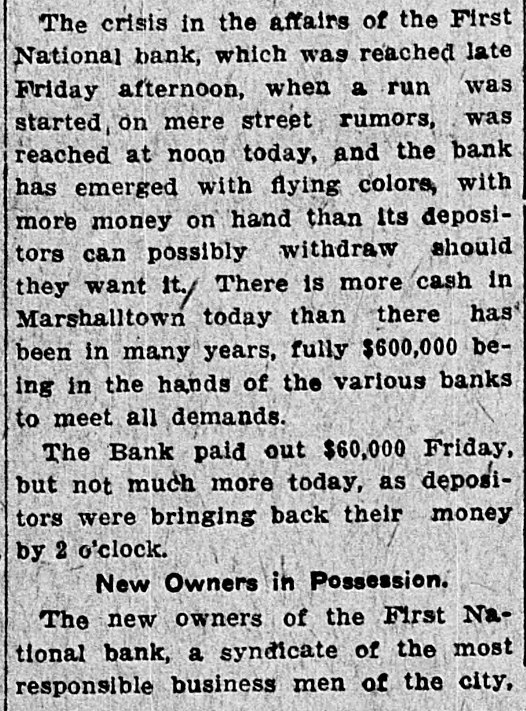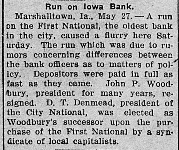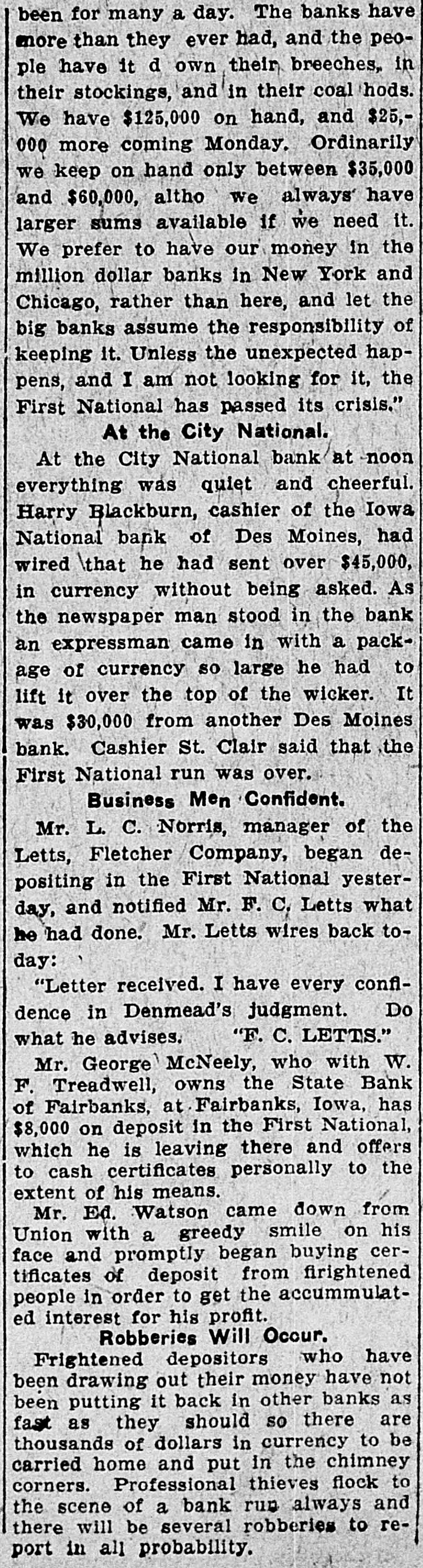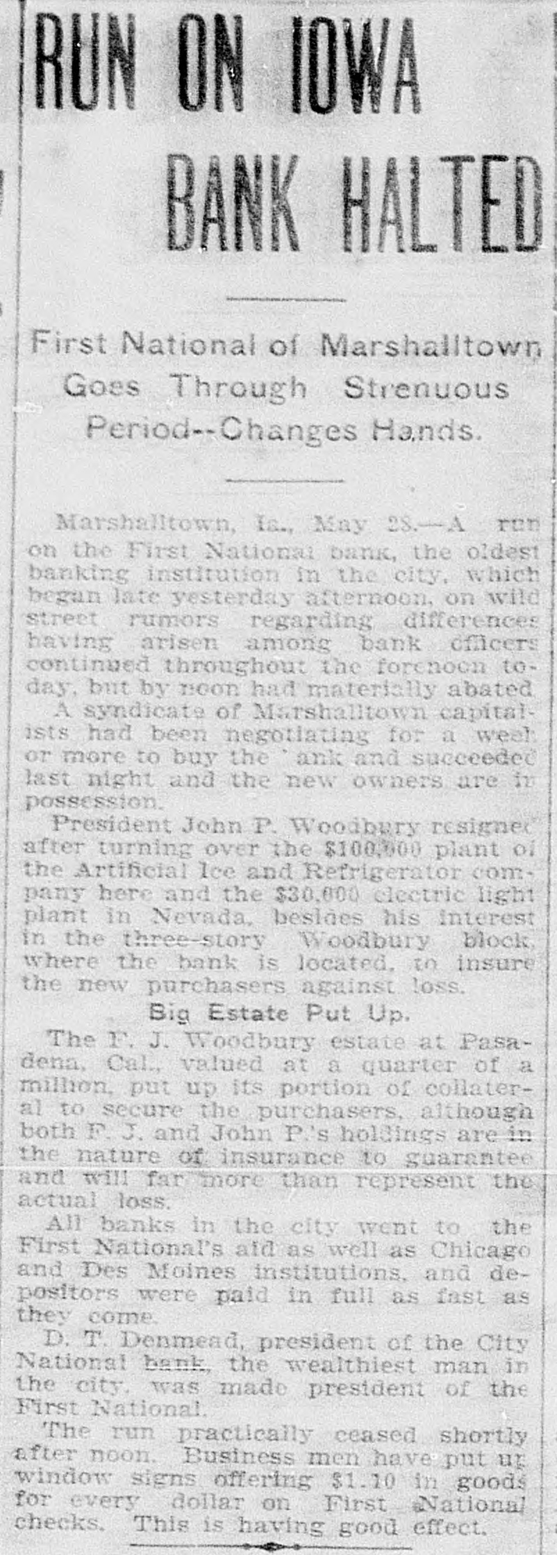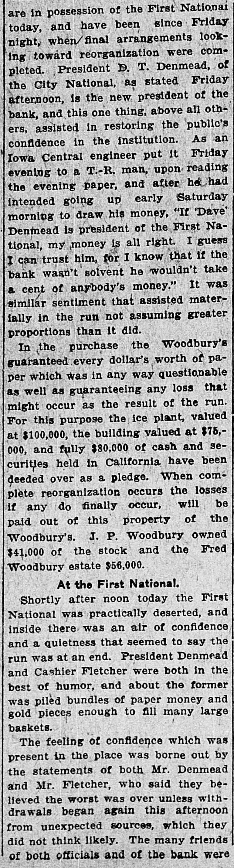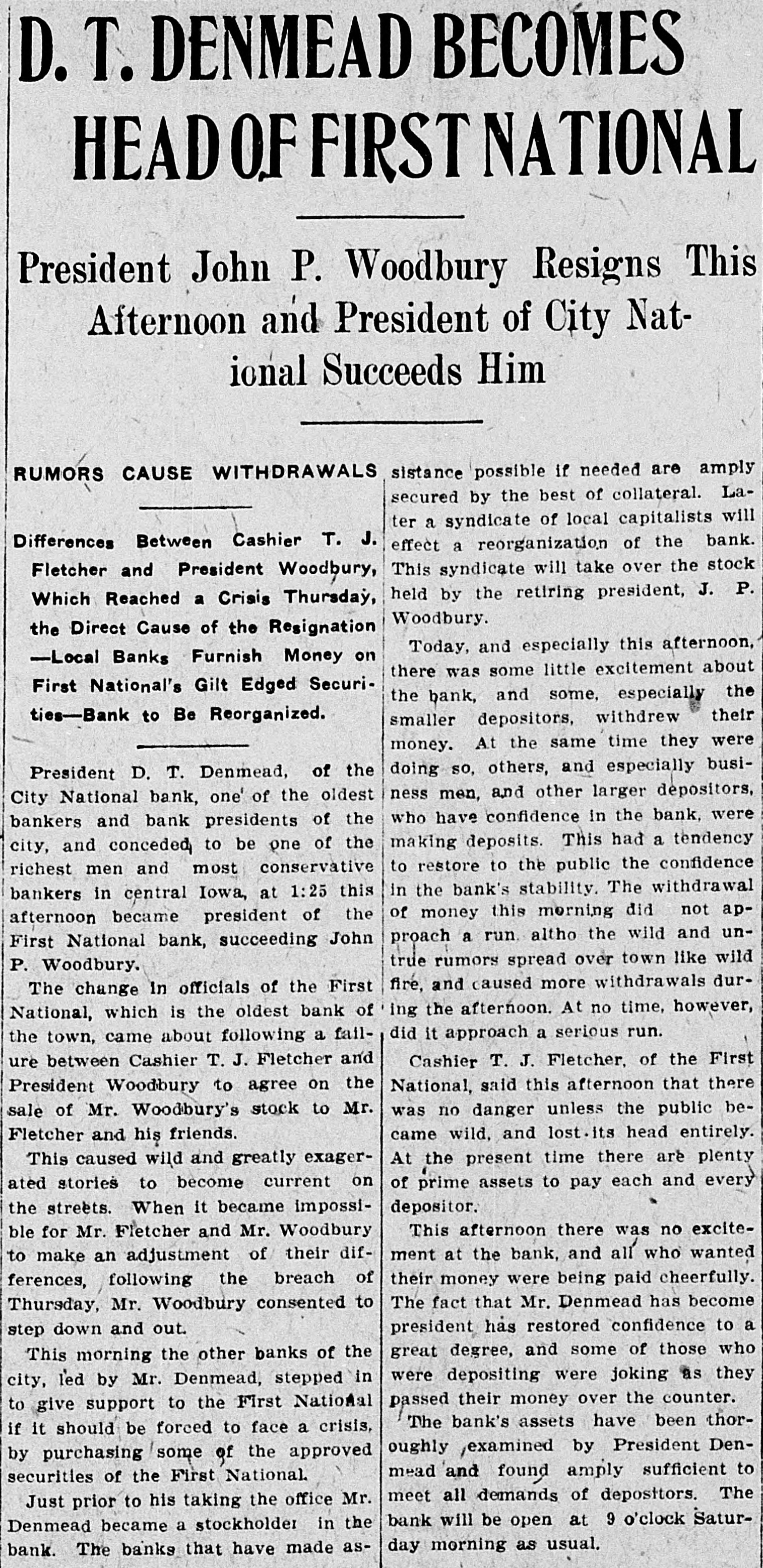 D. T. DENMEAD BECOMES HEAD OF FIRST NATIONAL President John P. Woodbury Resigns This Afternoon and President of City National Succeeds Him sistance possible if needed are amply RUMORS CAUSE WITHDRAWALS secured by the best of collateral. Later a syndicate of local capitalists will Differences Between Cashier T. J. effect a reorganization of the bank. This syndicate will take over the stock Fletcher and President Woodbury, held by the retiring president, J. P. Which Reached a Crisis Thursday, Woodbury. the Direct Cause of the Resignation Today, and especially this afternoon, -Local Banks Furnish Money on there was some little excitement about First National's Gilt Edged Securithe bank, and some, especially the ties-Bank to Be Reorganized. smaller depositors, withdrew their money. At the same time they were doing so, others, and especially busiPresident D. T. Denmead, of the ness men, and other larger depositors, City National bank, one' of the oldest who have confidence in the bank, were bankers and bank presidents of the making deposits. This had a tendency city, and conceded to be one of the to restore to the public the confidence richest men and most conservative in the bank's stability. The withdrawal bankers in central Iowa, at 1:25 this of money this morning did not apafternoon became president of the proach a run. altho the wild and unFirst National bank, succeeding John true rumors spread over town like wild P. Woodbury. fire, and caused more withdrawals durThe change in officials of the First ing the afternoon. At no time, however, National, which is the oldest bank of did it approach a serious run. the town, came about following a failure between Cashier T. J. Fletcher and Cashier T. J. Fletcher, of the First President Woodbury to agree on the National, said this afternoon that there was no danger unless the public besale of Mr. Woodbury's stock to Mr. Fletcher and his friends. came wild, and lost its head entirely. This caused wild and greatly exagerAt the present time there are plenty ated stories to become current on of prime assets to pay each and every the streets. When it became impossidepositor. This afternoon there was no exciteble for Mr. Fletcher and Mr. Woodbury ment at the bank, and all who wanted to make an adjustment of their diftheir money were being paid cheerfully. ferences, following the breach of The fact that Mr. Denmead has become Thursday, Mr. Woodbury consented to president has restored confidence to a step down and out. great degree, and some of those who This morning the other banks of the were depositing were joking as they city, led by Mr. Denmead, stepped in passed their money over the counter. to give support to the First National The bank's assets have been thorif it should be forced to face a crisis, oughly examined by President Denby purchasing some of the approved mead and found amply sufficient to securities of the First National. meet all demands of depositors. The Just prior to his taking the office Mr. bank will be open at 9 o'clock SaturDenmead became a stockholder in the day morning as usual. bank. The banks that have made as-