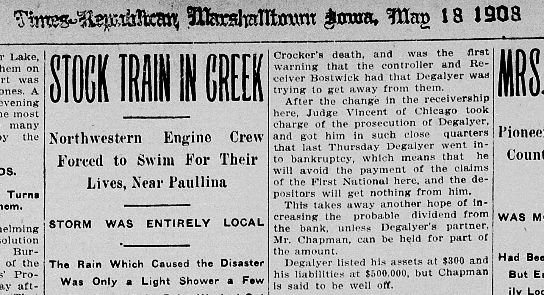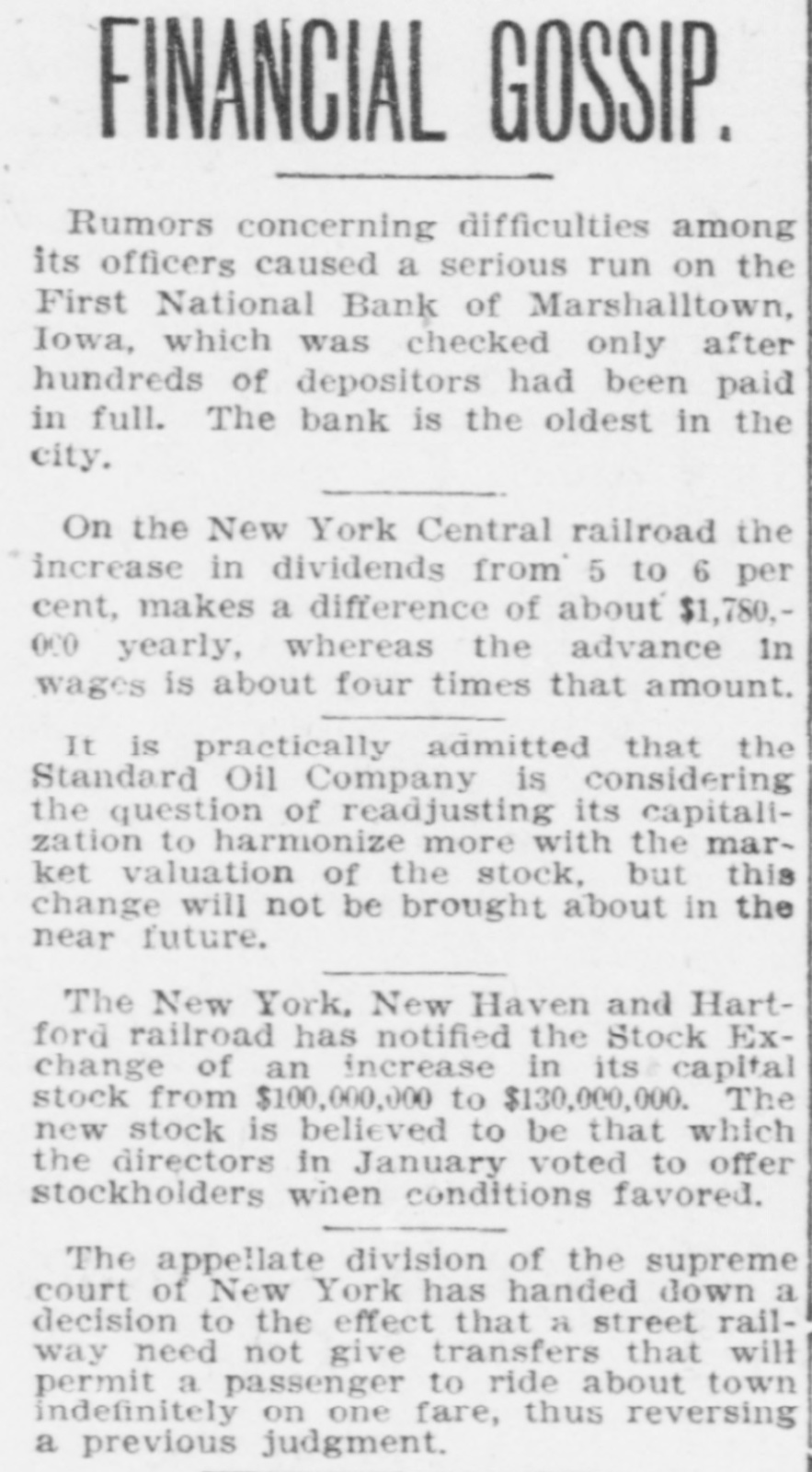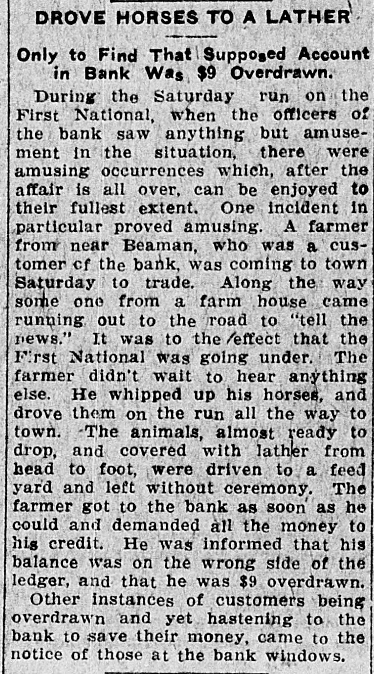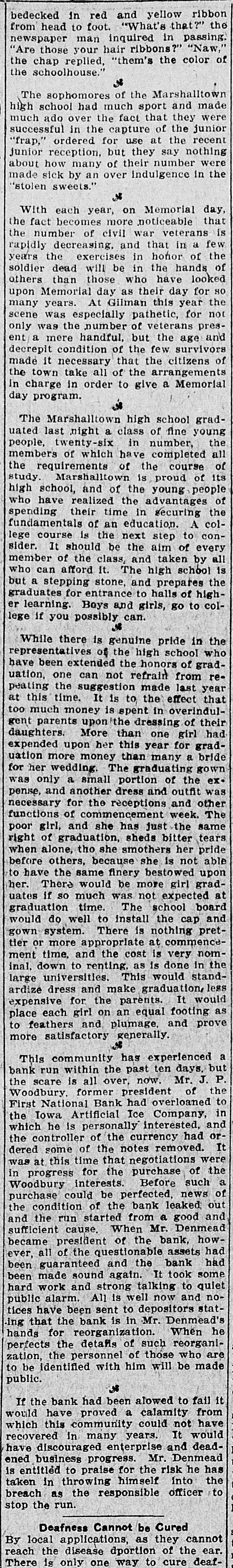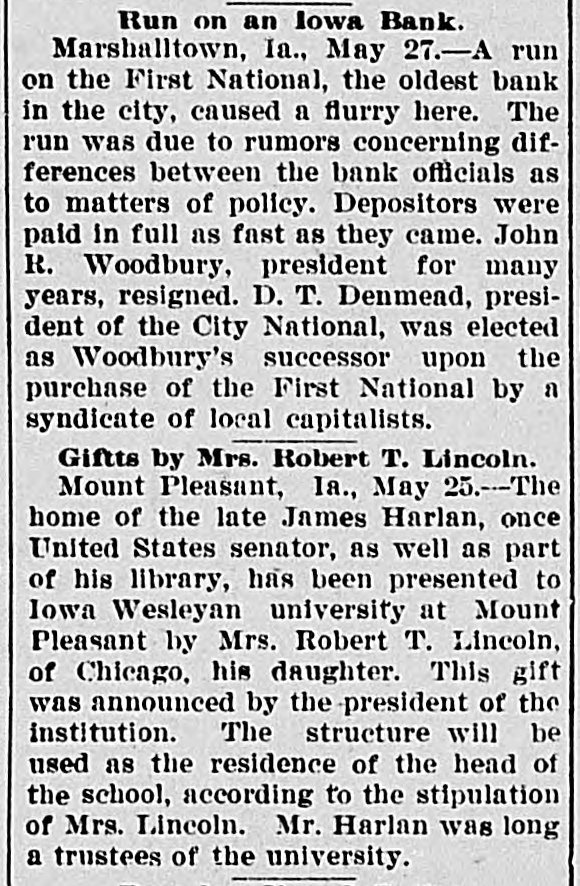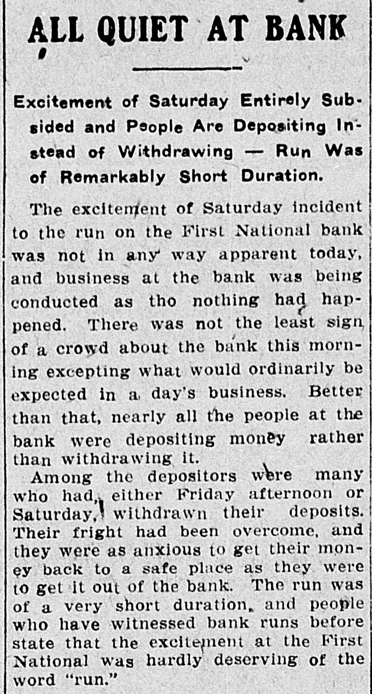 D. T. DENMEAD BECOMES HEAD OF FIRST NATIONAL President John P. Woodbury Resigns This Afternoon and President of City National Succeeds Him sistance possible if needed are amply RUMORS CAUSE WITHDRAWALS secured by the best of collateral. Later a syndicate of local capitalists will Differences Between Cashier T. J. effect a reorganization of the bank. This syndicate will take over the stock Fletcher and President Woodbury, held by the retiring president, J. P. Which Reached a Crisis Thursday, Woodbury. the Direct Cause of the Resignation Today, and especially this afternoon, -Local Banks Furnish Money on there was some little excitement about First National's Gilt Edged Securithe bank, and some, especially the ties-Bank to Be Reorganized. smaller depositors, withdrew their money. At the same time they were doing so, others, and especially busiPresident D. T. Denmead, of the ness men, and other larger depositors, City National bank, one' of the oldest who have confidence in the bank, were bankers and bank presidents of the making deposits. This had a tendency city, and conceded to be one of the to restore to the public the confidence richest men and most conservative in the bank's stability. The withdrawal bankers in central Iowa, at 1:25 this of money this morning did not apafternoon became president of the proach a run. altho the wild and unFirst National bank, succeeding John true rumors spread over town like wild P. Woodbury. fire, and caused more withdrawals durThe change in officials of the First ing the afternoon. At no time, however, National, which is the oldest bank of did it approach a serious run. the town, came about following a failure between Cashier T. J. Fletcher and Cashier T. J. Fletcher, of the First President Woodbury to agree on the National, said this afternoon that there was no danger unless the public besale of Mr. Woodbury's stock to Mr. Fletcher and his friends. came wild, and lost its head entirely. This caused wild and greatly exagerAt the present time there are plenty ated stories to become current on of prime assets to pay each and every the streets. When it became impossidepositor. This afternoon there was no exciteble for Mr. Fletcher and Mr. Woodbury ment at the bank, and all who wanted to make an adjustment of their diftheir money were being paid cheerfully. ferences, following the breach of The fact that Mr. Denmead has become Thursday, Mr. Woodbury consented to president has restored confidence to a step down and out. great degree, and some of those who This morning the other banks of the were depositing were joking as they city, led by Mr. Denmead, stepped in passed their money over the counter. to give support to the First National The bank's assets have been thorif it should be forced to face a crisis, oughly examined by President Denby purchasing some of the approved mead and found amply sufficient to securities of the First National. meet all demands of depositors. The Just prior to his taking the office Mr. bank will be open at 9 o'clock SaturDenmead became a stockholder in the day morning as usual. bank. The banks that have made as-