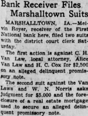 MARSHALLTOWN, IA.-Melvin Royer, receiver of the First National bank here. filed two suits with the district court clerk Saturday. The first action is against C.H. Van Law, local attorney, Alice Van Law and H. C. Cox for $2,500 on an alleged delinquent promissory note. The second suit against the Van Laws and W. N. Norris asks Judgment for $5,000 and the foreclosure of a real estate mortgage used to secure an alleged delinquent promissory note.