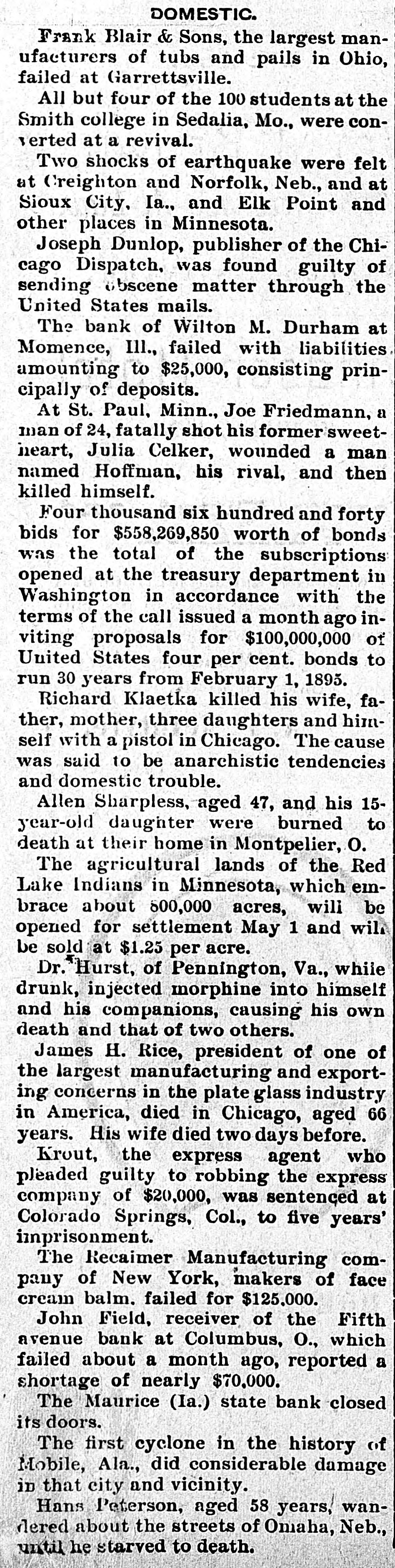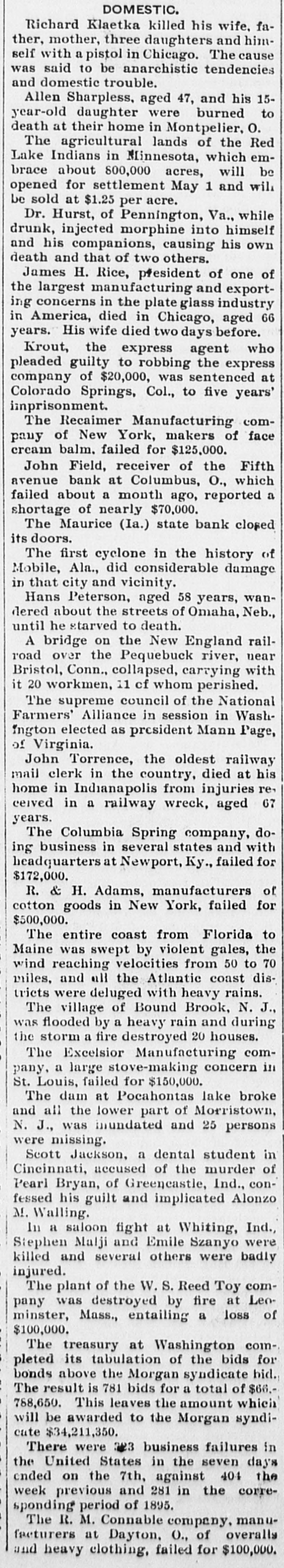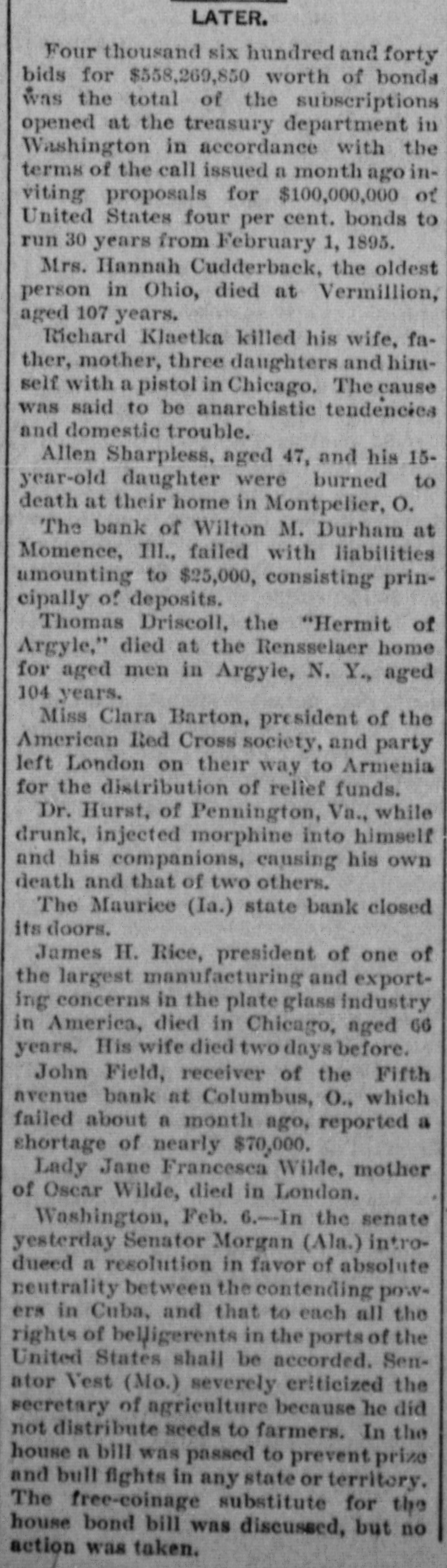 LATER. Four thousand six hundred and forty bids for $558,269,850 worth of bonds was the total of the subscriptions opened at the treasury department in Washington in accordance with the terms of the call issued a month ago inviting proposals for $100,000,000 of United States four per cent. bonds to run 30 years from February 1, 1895. Mrs. Hannah Cudderback, the oldest person in Ohio, died at Vermillion, aged 107 years. Richard Klaetka killed his wife, father, mother, three daughters and himself with a pistol in Chicago. The cause was said to be anarchistic tendencies and domestic trouble. Allen Sharpless, aged 47, and his 15year-old daughter were burned to death at their home in Montpelier, O. The bank of Wilton M. Durham at Momence, III., failed with liabilities amounting to $25,000, consisting principally of deposits. Thomas Driscoll, the "Hermit of Argyle," died at the Rensselaer home for aged men in Argyle, N. Y., aged 104 years. Miss Clara Barton, president of the American Red Cross society, and party left London on their way to Armenia for the distribution of relief funds. Dr. Hurst, of Pennington, Va., while drunk, injected morphine into himself and his companions, causing his own death and that of two others. The Maurice (Ia.) state bank closed its doors. James H. Rice, president of one of the largest manufacturing and exporting concerns in the plate glass industry in America, died in Chicago, aged 66 years. His wife died two days before. John Field, receiver of the Fifth avenue bank at Columbus, O., which failed about a month ago, reported a shortage of nearly $70,000. Lady Jane Francesca Wilde, mother of Oscar Wilde, died in London. Washington, Feb. 6.--In the senate yesterday Senator Morgan (Ala.) introdueed a resolution in favor of absolute neutrality between the contending powers in Cuba, and that to each all the rights of belligerents in the ports of the United States shall be accorded. Senator Vest (Mo.) severely criticized the secretary of agriculture because he did not distribute seeds to farmers. In the house a bill was passed to prevent prize and bull fights in any state or territory. The free-coinage substitute for the house bond bill was discussed, but no action was taken.