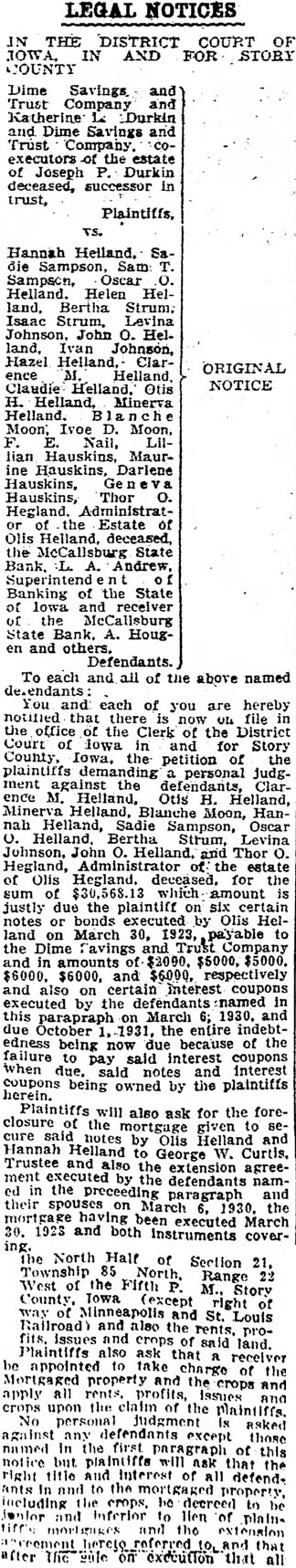 LEGAL NOTICES IN THE DISTRICT COURT OF IOWA. IN AND FOR STORY COUNTY Dime Savings and) Trust Company and Katherine Durkin and Dime Savings and Trust Company. coexecutors the estate of Joseph P. Durkin deceased, successor in trust, Hannah Helland. Sa. die Sampson, Sam Sampson, Oscar O. Helland. Helen Helland, Bertha Strum, Isaac Strum, Levina Johnson, John O. Helland, Ivan Johnson, Hazel Helland, Clarence H. Helland, Minerva Helland. Moon, Ivoe D. Moon, Nail, lian Hauskins, Maurine Hauskins, Darlene Hauskins, Ge Hauskins, Thor O. Hegland. Administrator the Estate of the McCallsburg State Superintend Banking of the State of lowa and receiver the McCallsburg State Bank, A. Hougen and others. ORIGINAL NOTICE To each and all of the above named You and each of you are hereby notified that there now file in the office of the Clerk of the District Court of lowa in and for Story County, Iowa, the petition of the plaintiffs demanding personal Judgment against the defendants, Clarence M. Helland, Otis H. Helland, Minerva Helland, Blanche Moon, Hannah Helland, Sadie Sampson, Oscar O. Helland, Bertha Strum, Levina Johnson, John O. Helland. and Thor O. Hegland, Administrator of the estate of Olis Hegland. deceased. for the sum of $30,568.13 which amount justly due the plaintiff on six certain notes or bonds executed by Olis Helland on March 30, 1923, payable to the Dime Tavings Company and in amounts of $2000. $5000, $5000. $6000. $6000, and $6000, respectively and also on certain Interest coupons executed by the defendants named in this parapraph on March 1930. and due October 1931 the entire indebtedness being now due because of the failure to pay said interest coupons when due. said notes and interest herein. coupons being owned by the plaintiffs Plaintiffs will also ask for the foreclosure of the mortgage given to secure said by Olis Helland and Hannah Helland George W. Curtis, Trustee and also the extension agreement executed by the defendants namin the paragraph and their on March 1930. the mortgage having been executed March 30. 1923 and both instruments cover- ing. the North Half of Section 21, Township 85 Range 22 West of the Fifth M., Story County, Towa (except right way Minneapolis and St. Louis Railroad) and also the rents, profits, Plaintiffs issues also and crops said land. ask that be appointed to take charge receiver of the Mortgaged property and the crops and apply all rents. profits, Issues and crops upon the claim of the plaintiffs. No personal judgment is asked against any defendants except those named In the first paragraph of this notice but plaintiffs ASK that right title and Interest of all defend. ants In and to the mortgaged property. Junior and Inferior lien of plain. mortgages and the extension after The on execution that