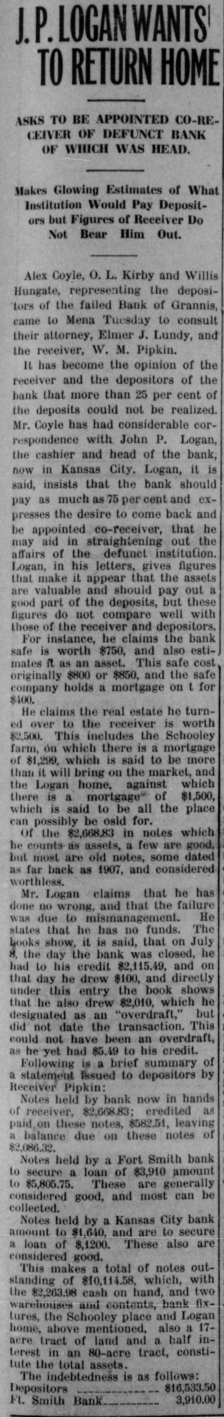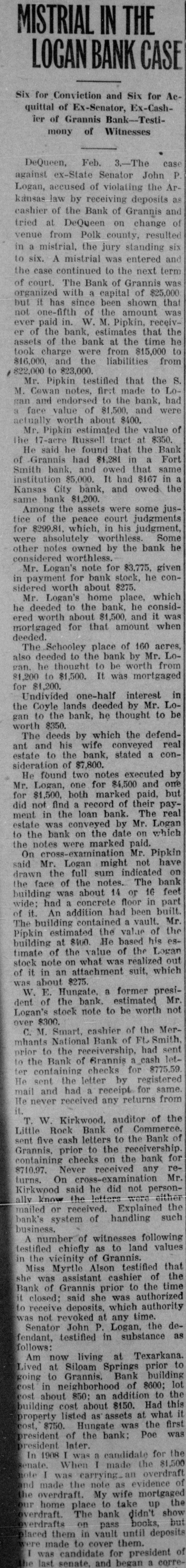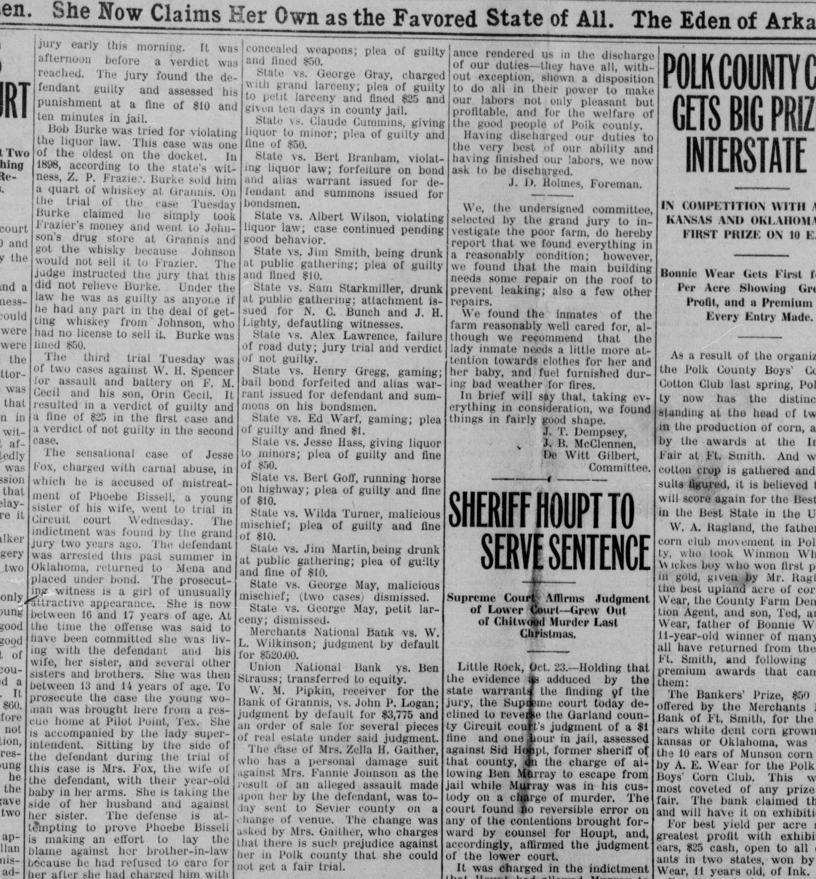 en. She Now Claims Her Own as the Favored State of All. The Eden of Arka jury early this morning, It was concealed weapons; plea of guilty ance rendered us in the discharge and fined $50. afternoon before a verdict was of our duties-they have all, withState VS. George Gray, charged reached. The jury found the deout exception, shown a disposition POLK COUNTY C with grand larceny; plea of guilty fendant guilty and assessed his to do all in their power to make to petit larceny and fined $25 and our labors not only pleasant but punishment at a fine of $10 and given ten days in county jail. RT profitable, and for the welfare of ten minutes in jail. State vs. Claude Cummins, giving the good people of Poik county. GETS BIG PRIZ Bob Burke was tried for violating liquor to minor; plea of guilty and Having discharged our duties to the liquor law. This case was one fine of $50. the very best of our ability and t Two of the oldest on the docket. In State vs. Bert Branham, violathaving finished our labors, we now hing 1898, according to the state's witINTERSTATE ing liquor law; forfeiture on bond ask to be discharged. Reness, Z. P. Frazier. Burke sold him and alias warrant issued for deJ. D. Holmes, Foreman. $ a quart of whiskey at Grannis. On fendant and summons issued for bondsmen. the trial of the case Tuesday IN COMPETITION WITH We, the undersigned committee, Burke claimed he simply took State VS. Albert Wilson, violating KANSAS AND OKLAHOMA selected by the grand jury to inFrazier's money and went to Johncourt liquor law; case continued pending vestigate the poor farm, do hereby FIRST PRIZE ON 10 E son's drug store at Grannis and good behavior. 0 and report that we found everything in got the whisky because Johnson State vs. Jim Smith, being drunk a reasonably condition; however, y the would not sell it to Frazier. The at public gathering; plea of guilty we found that the main building Bonnie Wear Gets First f and fined $10. judge instructed the jury that this needs some repair on the roof to and a did not relieve Burke. Under the State vs. Sam Starkmiller, drunk Per Acre Showing Gre prevent leaking; also a few other law he was as guilty as anyone if nessat public gathering; attachment isrepairs. Profit, and a Premium sued for N. C. Bunch and J. H. he had any part in the deal of getWe found the inmates of the could Every Entry Made. ting whiskey from Johnson, who Lighty, defautling witnesses. farm reasonably well cared for, alwere had no license to sell it. Burke was State VS. Alex Lawrence, failure though we recommend that the were lined $50. of road duty; jury trial and verdict lady inmate needs a little more atAs a result of the organiz the of not guilty. The third trial Tuesday was tention towards clothes for her and the Polk County Boys' Co of two cases against W. H. Spencer State VS. Henry Gregg, gaming; ttorher baby, and fuel furnished durfor assault and battery on F. M. bail bond forfeited and alias waring bad weather for fires. Cotton Club last spring, Pol was rant issued for defendant and sumCecil and his son, Orin Cecil. It In brief will say that, taking ev+ ly now has the distine that mons on his bondsmen. resulted in a verdict of guilty and erything in consideration, we found standing at the head of tw in n a fine of $25 in the first case and State vs. Ed Warf, gaming; plea things in fairly good shape. in the production of corn, a witof guilty and fined $1. a verdict of not guilty in the second J. T. Dempsey, case. by the awards at the In afState vs. Jesse Hass, giving liquor J. B. McClennen, The sensational case of Jesse Fair at Ft. Smith. And W to minors; plea of guilty and fine De Witt Gilbert, Ledly of $50. was Committee. Fox, charged with carnal abuse, in cotton crop is gathered and ssion State vs. Bert Goff, running horse which he is accused of mistreatsults figured, it is believed that on highway; plea of guilty and fine ment of Phoebe Bissell, a young will score again for the Best of $10. laysister of his wife, went to trial in in the Best State in the U re it State vs. Wilda Turner, malicious Circuit court Wednesday. The SHERIFF HOUPT TO mischief; plea of guilty and fine W. A. Ragland, the father indictment was found by the grand of $10. lker corn club movement in Pol jury two years ago. The defendant State vs. Jim Martin, being drunk gery ty, who took Winmon Wh was arrested this past summer in at public gathering; plea of guilty SERVE SENTENCE two Wickes boy who won first p Oklahoma, returned to Mena and and fine of $10. in gold, given by Mr. Rag placed under bond. The prosecutState vs. George May, malicious the best upland acre of cor ing witness is a girl of unusually only mischief; (two cases) dismissed. Supreme Court Affirms Judgment Wear, the County Farm Den attractive appearance. She is now State vs. George May, petit larof Lower Court-Grew Out ung tion Agent, and son, Ted, a between 16 and 17 years of age. At ceny; dismissed. of Chitwood Murder Last Wear, father of Bonnie W good the time the offense was said to Merchants National Bank VS. W. Christmas. 11-year-old winner of many have been committed she was livgood L. Wilkinson; judgment by default all have returned from the ing with the defendant and his of for $520.00. Ft. Smith, and following wife, her sister, and several other Union National Bank vs. Ben Little Rock, Oct. 23.-Holding that coupremium awards that can sisters and brothers. She was then Strauss; transferred to equity. the evidence as adduced by the d a them: between 13 and 14 years of age. To It W. M. Pipkin, receiver for the state warrants the finding of the The Bankers' Prize, $50 prosecute the case the young woBank of Grannis, VS. John P. Logan; jury, the Supreme court today de$60. offered by the Merchants man was brought here from a resclined to reverse the Garland counjudgment by default for $3,775 and fore Bank of Ft. Smith, for the cue home at Pilot Point, Tex. She an order of sale for several pieces ty Circuit court's judgment of a $1 not ears
