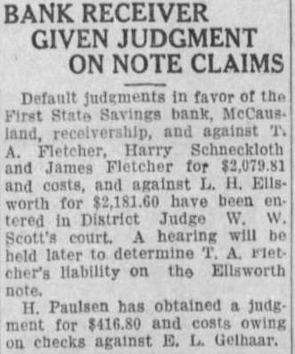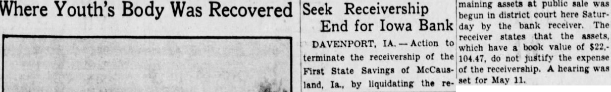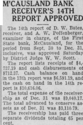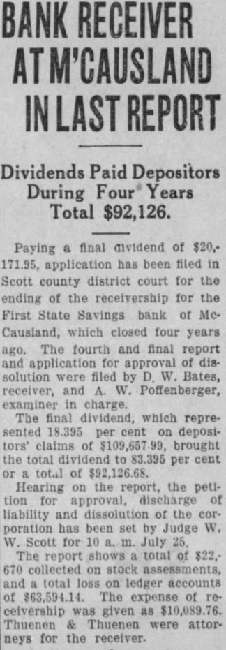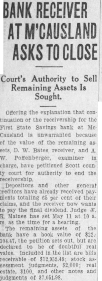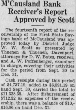 CHANGE IN BANK RECEIVERS WINS COURT APPROVAL An interlocutory report ferring the affairs the Bettendorf bank receivership from Andrew, retiring state superintendent of banking, to his successor, Bates, proved today by District Judge Scott. The order directs that Mr. receiver, discharged his bondsmen exonerated. Similiar orders were to be entered in the day the Home Savings bank the American Trust company receivership. Hearing on the Northwest enport bank, the LeClaire Savings bank and the American Trust company receiverships July Union Savings Bank Trust company First State Savings bank, McCausland, July