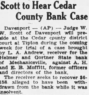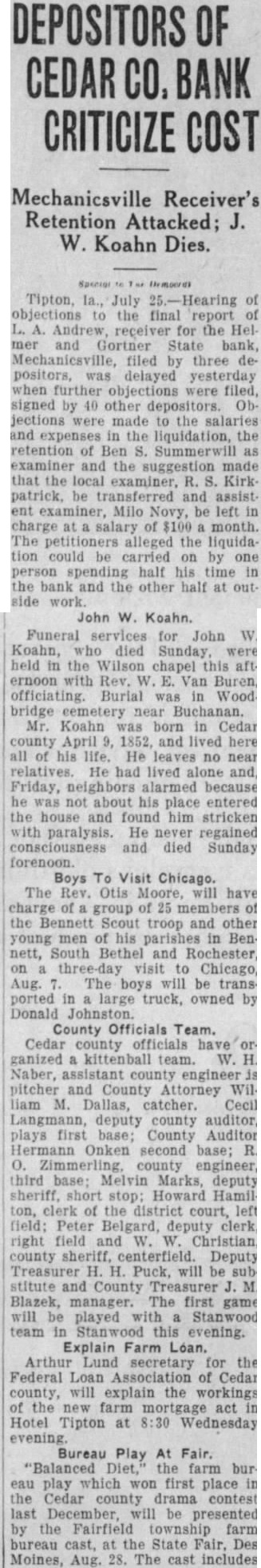 John W. Koahn. Funeral services for John W. Koahn, who died Sunday, were held in the Wilson chapel this afternoon with Rev. W. E. Van Buren, officiating Burial was in Wood. bridge cemetery near Buchanan. Mr. Koahn was born in Cedar county April 9, 1852, and lived here all of his life. He leaves no near relatives. He had lived alone and, Friday, neighbors alarmed because he was not about his place entered the house and found him stricken with paralysis. He never regained consciousness and died Sunday Boys To Visit Chicago. The Rev. Otis Moore, will have charge of group of 25 members of the Bennett Scout troop and other young men of his parishes in Bennett, South Bethel and Rochester, on a three-day visit to Chicago, Aug. 7. The boys will be transported in a large truck, owned by Donald Johnston. County Officials Team. Cedar county officials have organized a kittenball team. W. H. Naber, assistant county engineer is pitcher and County Attorney William M. Dallas, catcher. Cecil Langmann, deputy county auditor, plays first base; County Auditor Hermann Onken second base; R. O. Zimmerling, county engineer, third base; Melvin Marks, deputy sheriff, short stop: Howard Hamilton, clerk of the district court, left field: Peter Belgard, deputy clerk, right field and W. W. Christian, county sheriff, centerfield. Deputy Treasurer H. H. Puck, will be substitute and County Treasurer J. M. Blazek, manager. The first game will be played with a Stanwood team in Stanwood this evening. Explain Farm Loan. Arthur Lund secretary for the Federal Loan Association of Cedar county, will explain the workings of the new farm mortgage act in Hotel Tipton at 8:30 Wednesday