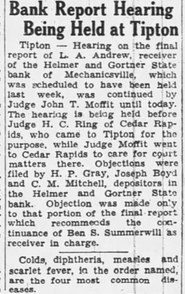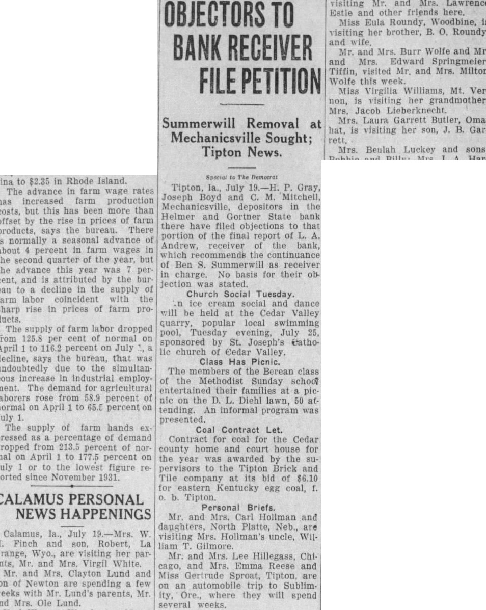Tipton, la., July 25.-Hearing of objections to the final report of L. A. Andrew, receiver for the Hel mer and Gortner State bank, Mechanicsville, filed by three depositors, was delayed yesterday when further objections were filed, signed by 40 other depositors. Objections were made to the salaries and expenses in the liquidation, the retention of Ben S. Summerwill as examiner and the suggestion made that the local examiner, R. S. Kirkpatrick, be transferred and assist ent examiner, Milo Novy, be left in charge at salary of $100 a month. The petitioners alleged the liquidation could be carried on by one person spending half his time in the bank and the other half at outside work.