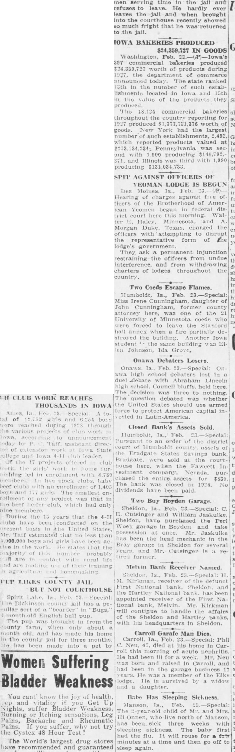 CLUB WORK REACHES THOUSANDS IN IOWA of girls and during 1928 through various projects work according by assistant State leader. or the 17 offered club home mishing led enrollment live stock baby enrollment of and smallest rollment project that beef heifer club, had only members. During the years that the clubs been conducted the estimated no less than that the number probably are contact their training men time the and refuses to leave. He hardly ever leaves the jail and when brought into the courthouse recently showed much fright that he the jail. BAKERIES PRODUCED $24,359,727 IN GOODS Washington, Feb. commercial bakeries produced worth of during 1927, the department of commerce state ranked in the such establocated in 15th the value of the products they The commercial bakeries throughout the country 1937 produced worth goods. New York had the largest number such which products valued ond with producing and Illinois third 1,990 producing $131,034,733. of SPIT OFFICERS OF YEOMAN LODGE IS BEGUN Des of five of ficers of the Brotherhood of Amerbegan federal dis. court this WalHaley, Minnesota, Morgan Duke, Texas, the attempting to disrupt the representative form of lodge's government They permanent injunction restraining the ofifcers from undue interference, and from charters of lodges throughout the country. Two Coeds Escape Flames. Humboldt, Feb. 23.-Special Miss Irene daughter John Cunningham, former county attorney here, was one of the of Minnesota coeds forced to leave the Stanford hall annex when fire partially de. stroyed the building. Another Iowa student the same building Johnson, Ida Grove, Onawa Debaters Losers. high school debaters in debate Abraham Lincoln school. Council bluffs, held here. decision to nothing. The question debated whether the United should armed force American capital ested in Closed Bank's Assets Sold. order of the district court sold the house the company pur chased the entire assets The closed 1924. vidends have been paid. Two Buy Boyden Garage. Sheldon, Feb. Cutsinger and William Jaskulke, Sheldon, purchased the Perl garage in Boyden and take once. Mr. has been the head mechanic in the Bray garage in Sheldon years. and Mr. Cutsinger is tired Bank Receiver Named. defunct National bank. Sheldon and the Hartley National bank been appointed receiver of the First National bank, Melvin. Mr. Kirkman will continue to handle affairs the Hartley banks, with his headquarters in Sheldon. Carroll Garafe Man Dies. Phil Neu. 47, died his home Carroll this of acute He had been week. Mr. Neu born and raised Carroll, and in the garage business He member the Elks lodge. survived by widow daughter. Babe Has Sleeping Sickness. Feb. The child of Mr. and Mrs. Onnen, who live north of Manson, has been sick three weeks with sleeping sickness. The baby first had the will rouse faty minutes at time and then go off sleep again.