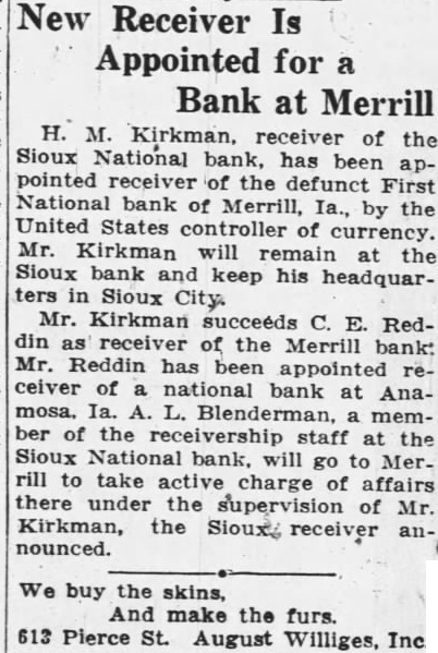 New Receiver Is Appointed for a Bank at Merrill H. M. Kirkman, receiver of the Sioux National bank, has been appointed receiver of the defunct First National bank of Merrill, Ia., by the United States controller of currency. Mr. Kirkman will remain at the Sioux bank and keep his headquarters Sioux City. Mr. Kirkman succeeds C. E. Reddin receiver of the Merrill bank: Mr. Reddin has been appointed receiver of a national bank at Anamosa, Ia. A. L. Blenderman, a member of the receivership staff at the Sioux National bank, will go to Merrill to take active charge of affairs there under the supervision of Mr. Kirkman, the Sioux receiver announced. We buy the skins, And make the furs. 613 Pierce St. August Williges, Inc.
