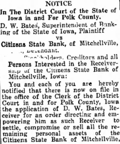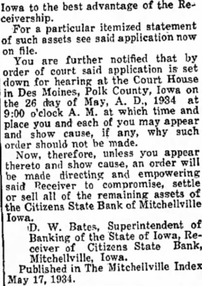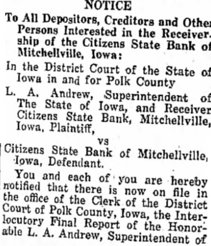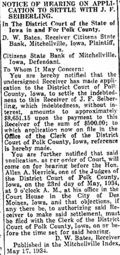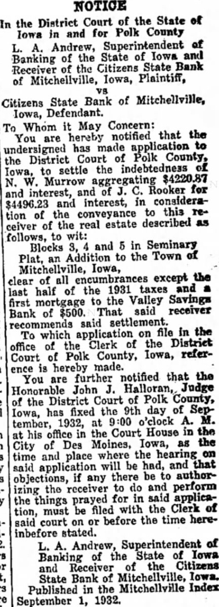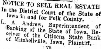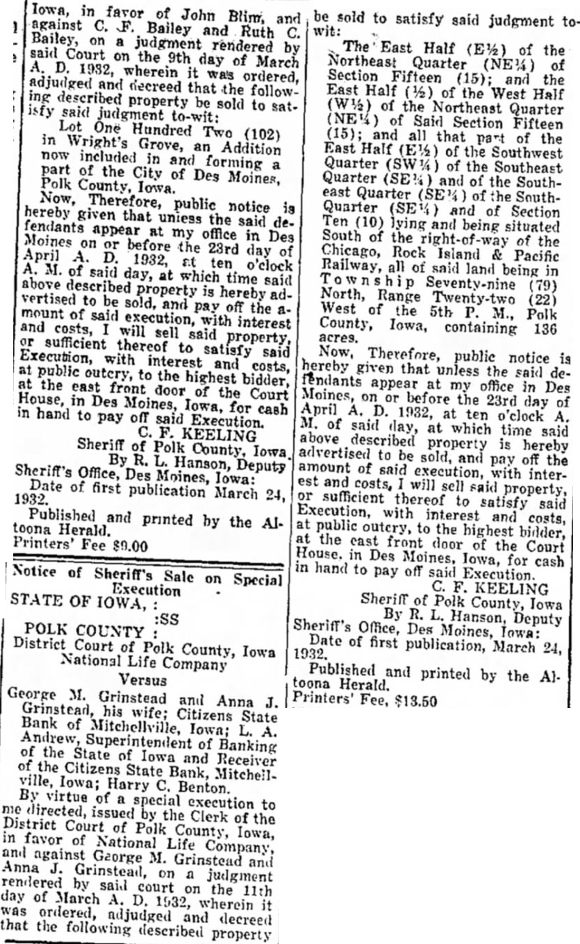 Iowa, in favor of John Blim, and against C. F. Bailey and Ruth C. Bailey, on a judgment rendered by said Court on the 9th day of March A. D. 1932, wherein it was ordered, adjudged and decreed that the following described property be sold to satisfy said judgment to-wit: Lot One Hundred Two (102) in Wright's Grove, an Addition now included in and forming a part of the City of Des Moines, Polk County, Iowa. Now, Therefore, public notice is hereby given that unless the said defendants appear at my office in Des Moines on or before the 23rd day of April A. D. 1932, at ten o'clock A. M. of said day, at which time said above described property is hereby advertised to be sold, and pay off the a. mount of said execution, with interest and costs, will sell said property, or sufficient thereof to satisfy said Execution, with interest and costs, at public outery, to the highest bidder, at the east front door of the Court House, in Des Moines, Iowa, for cash in hand to pay off said Execution. C. F. KEELING Sheriff of Polk County, Iowa. By R. L. Hanson, Deputy Sheriff's Office, Des Moines, Iowa: Date of first publication March 24, 1932. Published and printed by the Altoona Herald. Printers' Fee $9.00 Notice of Sheriff's Sale on Special Execution STATE OF IOWA, :SS POLK COUNTY District Court of Polk County, Iowa National Life Company Versus George M. Grinstead and Anna J. Grinstead, his wife: Citizens State Bank of Mitchellville, Iowa; L. A. Andrew, Superintendent of Banking of the State of Iowa and Receiver of the Citizens State Bank, Mitchellville, Iowa; Harry C. Benton. By virtue of a special execution to me directed, issued by the Clerk of the District Court of Polk County, Iowa, in favor of National Life Company, and against George M. Grinstead and Anna J. Grinstead, on a judgment rendered by said court on the 11th day of March A. D. 1932, wherein it was ordered, adjudged and decreed that the following described property be sold to satisfy said judgment towit: The East Half (E½) of the Northeast Quarter (NE%) of Section Fifteen (15); and the East Half (1/2) of the West Half (W½) of the Northeast Quarter (NE%) of Said Section Fifteen (15); and all that part of the East Half (E½) of the Southwest Quarter (SW%) of the Southeast Quarter (SEM) and of the Southeast Quarter (SE%) of the SouthQuarter (SE%) and of Section Ten (10) lying and being situated South of the right-of-way of the Chicago, Rock Island & Pacific Railway, all of said land being in Seventy-nine (79) North, Range Twenty-two (22) West of the 5th P. M., Polk County, Iowa, containing 136 acres. Now, Therefore, public notice is hereby given that unless the said defendants appear at my office in Des Moines, on or before the 23rd day of April A. D. 1932, at ten o'clock A. M. of said day, at which time said above described property is hereby advertised to be sold, and pay off the amount of said execution, with interest and costs, will sell said property, or sufficient thereof to satisfy said Execution, with interest and costs, at public outery, to the highest bidder, at the cast front door of the Court House. in Des Moines, Iowa, for cash in hand to pay off said Execution. C.F. KEELING Sheriff of Polk County, Iowa By R. L. Hanson, Deputy Sheriff's Office, Des Moines, Iowa: Date of first publication, March 24, 1932. Published and printed by the Altoona Herald. Printers' Fee, $13.50