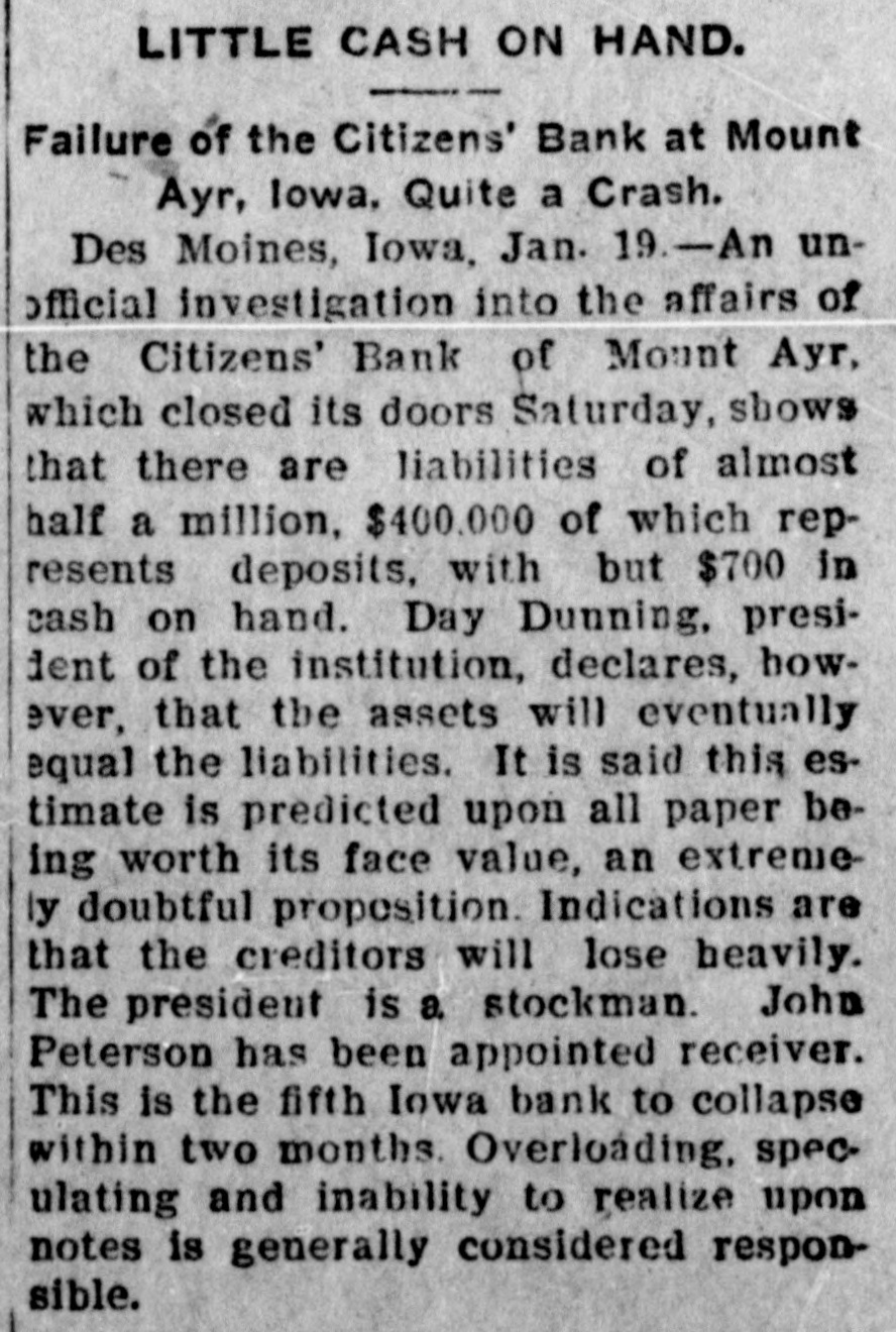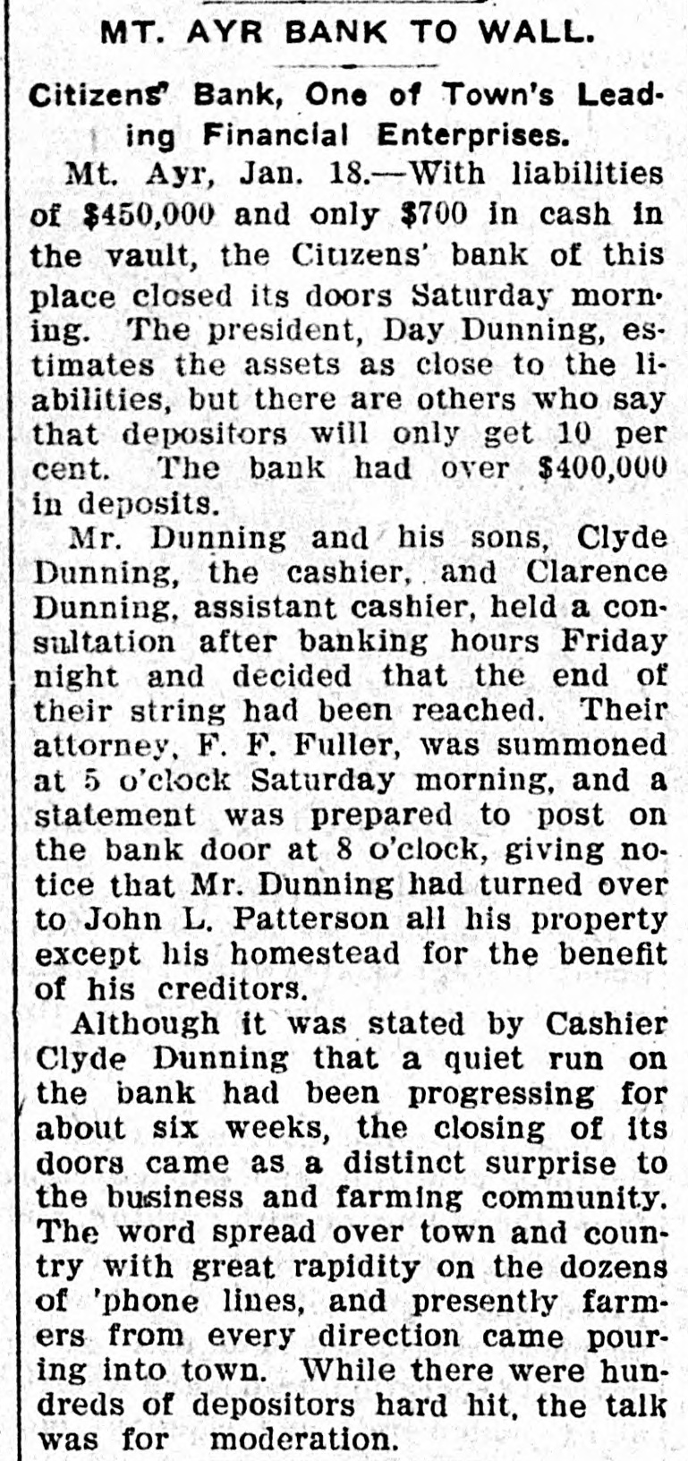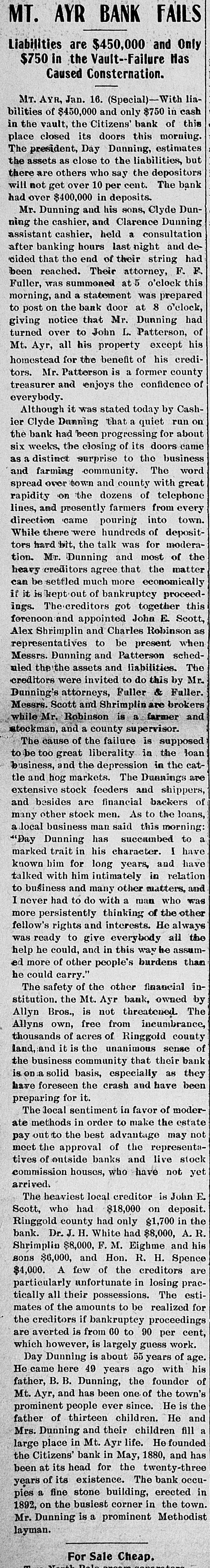MT. AYR BANK FAILS Liabilities are $450,000 and Only $750 in the Vault--Failure Has Caused Consternation. MT. AYR, Jan. 16. (Special)-With liabilities of $450,000 and only in the Citizens bank in place the closed vault, $750 of cash this its doors this morning. The president, Day Dunning, estimates the assets as close to the liabilities, but there are others who say the depositors will not get over 10 per cent. The bank had over $400,000 in deposits. Mr. Dunning and his sons, Clyde Dunning the cashier, and Clarence Dunning assistant held a consultation hours last after cided banking cashier, night and dethat the end of their string had Their F. was summoned at 5 this been Fuller, reached. attorney, o'clock F. morning, and a statement was on the bank door at 8 giving to post prepared o clock, notice that Mr. Dunning had over to John L. of his property his Mt. turned Ayr, all Patterson, except homestead for the benefit of his creditors. Mr. Patterson is a former county treasurer and enjoys the confidence of everybody. Although it was stated today by Cashier Clyde Danning that a quiet run on the bank had been progressing for about six weeks, the closing of its doors as a surprise to the community. The spread and distinct farming business word came over town and county with on the dozens of lines, rapidity and telephone great presently farmers from came pouring into were hundreds of tors direction While there deposit- every town. hard bit, the talk was for moderation. Mr. Dunning and most of the heavy creditors agree that the matter can be settled much more if of ings. it is kept.out bankruptcy economically proceedThe creditors got together this appointed John E. and Charles as Alex forenoon and Shrimplin Robinson Scott, representatives to be present when Messrs. Dunning and Patterson scheduled the the assets and liabilities. The creditors were invited to do this by Mr. Dunning's attorneys, Fuller & Fuller. Messrs. Scott and Shrimplin are brokers while Mr. Robinson is a farmer and stockman, and a county supervisor. The cause of the failure is supposed to be too great liberality in the loan business, and the depression in the cattle and hog markets. The Dunnings extensive stock feeders and shippers, and besides are financial many stock men. As to the a local other business backers loans, of man said this morning: "Day Dunning has succumbed to a marked trait in his character. I have known him for long years, and have talked with him intimately in relation to business and many other matters, and never had to do with a man who was more persistently thinking of the other fellow's rights and interests. He always was ready to give everybody all the help he could, and in this way he assumed more of other people's burdens than he could carry.' The safety of the other financial institution. the Mt. Ayr bank, owned by Allyn Bros., is not threatened. The Allyns own, free from incumbrance, thousands of acres of Ringgold county land, and it is the unanimous sense of the business community that their bank is solid basis, especially as they have foreseen the crash and have been preparing for it. The local sentiment in favor of moderate methods in order to make the estate pay out to the best advantage may not meet the approval of the representatives of outside banks and live stock commission houses, who have not yet arrived. The heaviest local creditor is John E. Scott, who had $18,000 on county had only Ringgold bank. Dr. $1,700 deposit. in the J. H. White had $8,000, $8,000, F. M. and his and Hon. R. H. sons Shrimplin $6,000, Eighme Spence $4,000. A few of the creditors are particularly unfortunate in losing practically all their possessions. The estimates of the amounts to be realized for the creditors if bankruptcy proceedings are averted is from 60 to 90 per cent, which however, is largely guess work. Day Dunning is about 55 years of age. He came here 49 years ago with his father, B. B. Dunning, the founder of Mt. Ayr, and has been one of the people ever since. He is the thirteen children. father prominent of He town's and Mrs. Dunning and their children fill large place in Mt. Ayr life. He founded the Citizens' bank in May, 1880, and has been at its head for the twenty-three years of its existence. The bank occupies a fine stone building, erected in on the busiest corner in town. 1892, Mr. Dunning the is a prominent Methodist layman. For Sale Cheap.