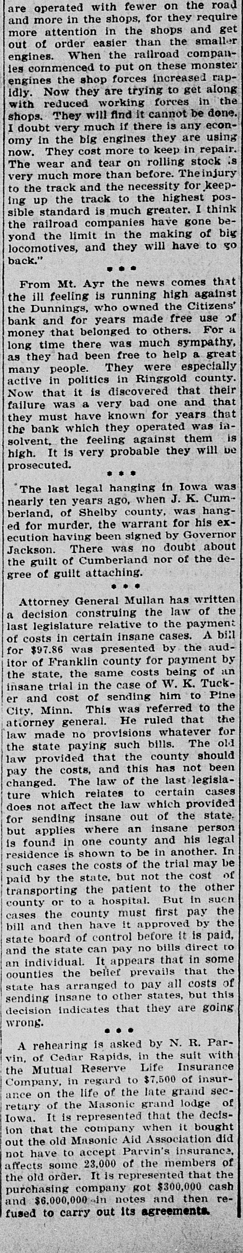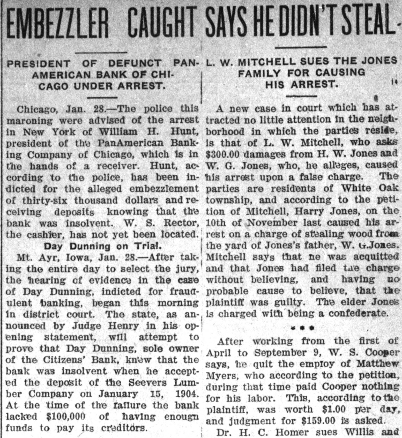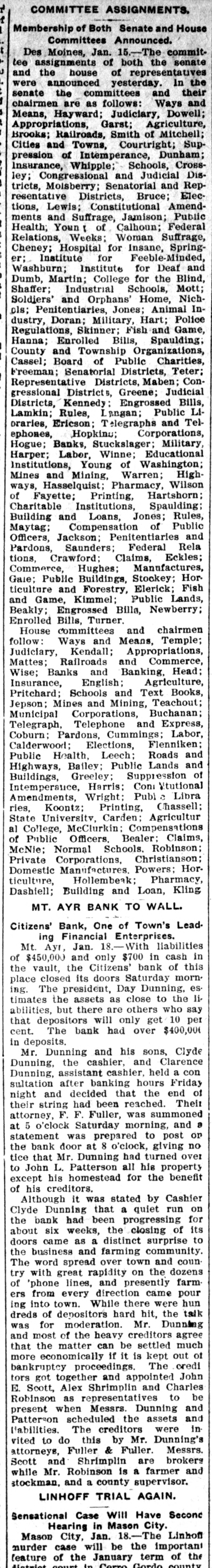MT. AYR BANK FAILS Liabilities are $450,000 and Only $750 in the Vault--Failure Has Caused Consternation. MT. AYR, Jan. 16. (Special)-With liabilities of $450,000 and only in the Citizens bank in place the closed vault, $750 of cash this its doors this morning. The president, Day Dunning, estimates the assets as close to the liabilities, but there are others who say the depositors will not get over 10 per cent. The bank had over $400,000 in deposits. Mr. Dunning and his sons, Clyde Dunning the cashier, and Clarence Dunning assistant held a consultation hours last after cided banking cashier, night and dethat the end of their string had Their F. was summoned at 5 this been Fuller, reached. attorney, o'clock F. morning, and a statement was on the bank door at 8 giving to post prepared o clock, notice that Mr. Dunning had over to John L. of his property his Mt. turned Ayr, all Patterson, except homestead for the benefit of his creditors. Mr. Patterson is a former county treasurer and enjoys the confidence of everybody. Although it was stated today by Cashier Clyde Danning that a quiet run on the bank had been progressing for about six weeks, the closing of its doors as a surprise to the community. The spread and distinct farming business word came over town and county with on the dozens of lines, rapidity and telephone great presently farmers from came pouring into were hundreds of tors direction While there deposit- every town. hard bit, the talk was for moderation. Mr. Dunning and most of the heavy creditors agree that the matter can be settled much more if of ings. it is kept.out bankruptcy economically proceedThe creditors got together this appointed John E. and Charles as Alex forenoon and Shrimplin Robinson Scott, representatives to be present when Messrs. Dunning and Patterson scheduled the the assets and liabilities. The creditors were invited to do this by Mr. Dunning's attorneys, Fuller & Fuller. Messrs. Scott and Shrimplin are brokers while Mr. Robinson is a farmer and stockman, and a county supervisor. The cause of the failure is supposed to be too great liberality in the loan business, and the depression in the cattle and hog markets. The Dunnings extensive stock feeders and shippers, and besides are financial many stock men. As to the a local other business backers loans, of man said this morning: "Day Dunning has succumbed to a marked trait in his character. I have known him for long years, and have talked with him intimately in relation to business and many other matters, and never had to do with a man who was more persistently thinking of the other fellow's rights and interests. He always was ready to give everybody all the help he could, and in this way he assumed more of other people's burdens than he could carry.' The safety of the other financial institution. the Mt. Ayr bank, owned by Allyn Bros., is not threatened. The Allyns own, free from incumbrance, thousands of acres of Ringgold county land, and it is the unanimous sense of the business community that their bank is solid basis, especially as they have foreseen the crash and have been preparing for it. The local sentiment in favor of moderate methods in order to make the estate pay out to the best advantage may not meet the approval of the representatives of outside banks and live stock commission houses, who have not yet arrived. The heaviest local creditor is John E. Scott, who had $18,000 on county had only Ringgold bank. Dr. $1,700 deposit. in the J. H. White had $8,000, $8,000, F. M. and his and Hon. R. H. sons Shrimplin $6,000, Eighme Spence $4,000. A few of the creditors are particularly unfortunate in losing practically all their possessions. The estimates of the amounts to be realized for the creditors if bankruptcy proceedings are averted is from 60 to 90 per cent, which however, is largely guess work. Day Dunning is about 55 years of age. He came here 49 years ago with his father, B. B. Dunning, the founder of Mt. Ayr, and has been one of the people ever since. He is the thirteen children. father prominent of He town's and Mrs. Dunning and their children fill large place in Mt. Ayr life. He founded the Citizens' bank in May, 1880, and has been at its head for the twenty-three years of its existence. The bank occupies a fine stone building, erected in on the busiest corner in town. 1892, Mr. Dunning the is a prominent Methodist layman. For Sale Cheap.