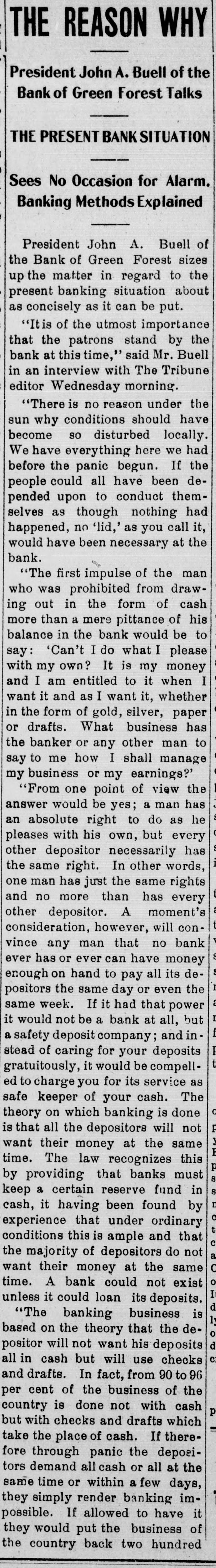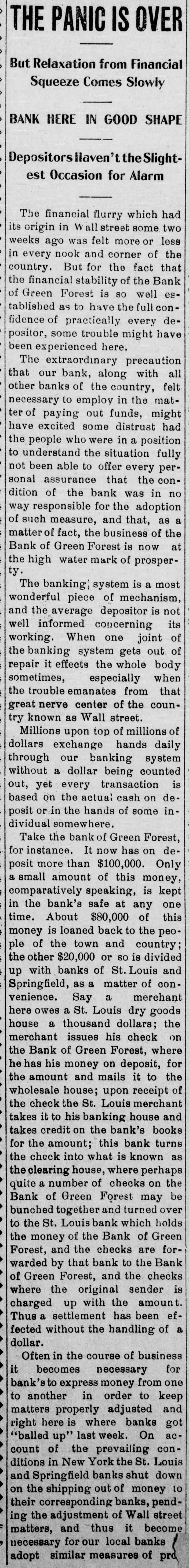 THE PANIC IS OVER But Relaxation from Financial Squeeze Comes Slowly BANK HERE IN GOOD SHAPE Depositors Haven't the Slightest Occasion for Alarm The financial flurry which had two its origin in wall street some weeks ago was felt more or less the in every nook and corner of that country. But for the fact the financial stability of the Bank esof Green Forest is so well tablished as to have the full confidence of practically every depositor, some trouble might have been experienced here. The extraordinary precaution all that our bank, along with felt other banks of the country, necessary to employ in the matter of paying out funds, might had have excited some distrust the people who were in a position to understand the situation fully not been able to offer every personal assurance that the condition of the bank was in no way responsible for the adoption a of such measure, and that, as matter of fact, the business of the at Bank of Green Forest is now the high water mark of prosperty. The banking; system is a most wonderful piece of mechanism, and the average depositor is not its well informed concerning working. When one joint of the banking system gets out of repair it effects the whole when body sometimes, especially that the trouble emanates from great nerve center of the country known as Wall street. Millions upon top of millions of dollars exchange hands daily through our banking system without a dollar being counted is out, yet every transaction debased on the actual cash on in posit or in the hands of some dividual somewhere. Take the bank of Green Forest, deinstance. It now has on for posit more than $100,000. Only small amount of this money, kept comparatively a speaking, is one the bank's safe at any this time. in About $80,000 of money is loaned back to the peoof the town and country; divided the ple other $20,000 or so is and with banks of St. Louis of Springfield, up as a matter merchant convenience. Say a here owes a St. Louis dry goods the house a thousand dollars; on merchant issues his check the Bank of Green Forest, where for he has his money on deposit, the the amount and mails it to of wholesale house; upon receipt check the St. Louis merchant and takes the it to his banking house books takes credit on the bank's turns for the amount; this bank as check into what is known the the clearing house, where perhaps the a number of checks on be Bank quite of Green Forest may over bunched together and turned holds the St. Louis bank which Green to the money of the Bank of forForest, and the checks are Bank warded by that bank to the checks Green Forest, and the is of where the original sender amount. charged up with the efa settlement has been of a Thus fected without the handling dollar. Often in the course of business for becomes necessary it to express money from one bank's another in order to keep and matters to properly adjusted got right here is where banks On ac"balled up" last week. conof the prevailing Louis ditions count in New York the St. down and Springfield banks shut to the shipping out of money pendtheir on corresponding banks, street the adjustment of Wall become ing and thus it 1 necessary matters, for our local banks of prd adopt similar measures