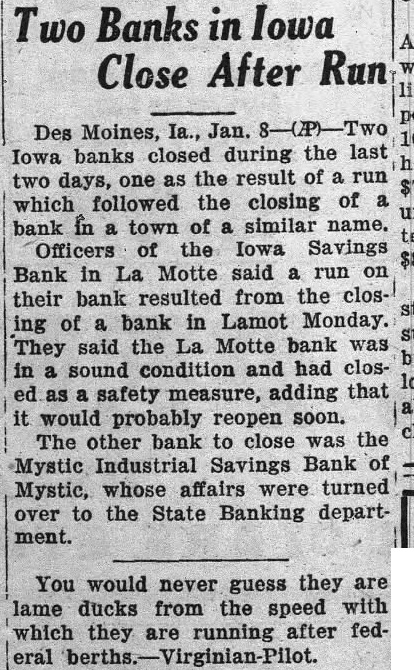 Two Banks in Iowa Close After Run Des Moines, Ia., Jan. banks closed during the last Iowa two days, one as the result of run which followed the closing of um bank in town of similar name. a ter Officers of the Iowa Savings Bank in La Motte said run on their bank resulted from the closing of bank in Lamot Monday. They said the La Motte bank was in sound condition and had closed as safety adding that it would probably reopen soon. The other bank close was the Mystic Industrial Savings Bank of Mystic, whose affairs were turned over to the State Banking department. You would never guess they are lame ducks from the speed with which they are running after fed-