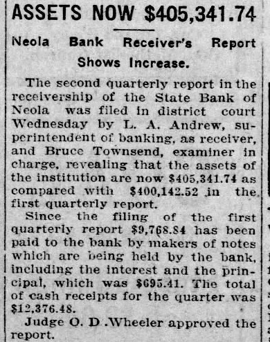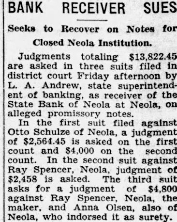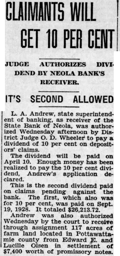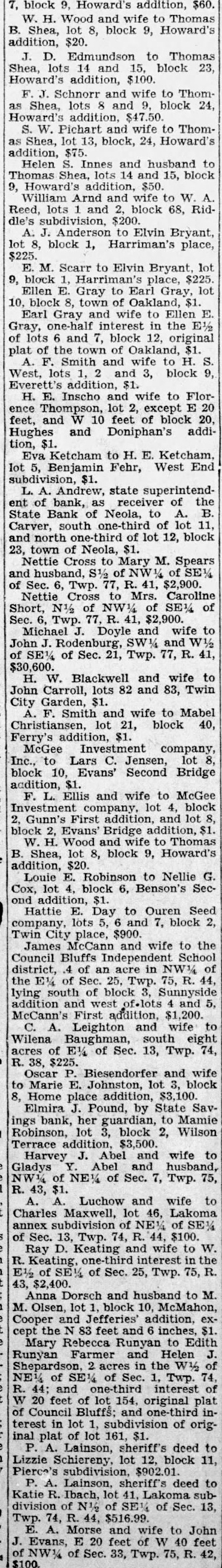 7, block 9. Howard's addition, $60. W. H. Wood and wife to Thomas B. Shea, lot 8, block 9, Howard's addition, $20. D. Edmundson to Thomas Shea, lots and 15. block 23, Howard's addition, $100. Schnorr and wife to ThomShea, and block 24, addition. $47.50 S. W. Pichart and wife to Thomas Shea, lot 13, block, 24, Howard's addition, $75. Helen Innes and husband to Thomas Shea, 14 and 15, block 9, Howard's $50 William Arnd and wife to W. Reed, lots and block 68, Riddle's subdivision, A. J. Anderson to Elvin Bryant, lot 8, block 1, Harriman's place, $225. E. M. Scarr to Elvin Bryant, lot 9, block Harriman's place, $225. Ellen E. Gray to Earl Gray, lot 10, block town of Oakland, $1. Earl Gray and wife to Ellen E. Gray, one-half interest in the E½ of lots and 7. block 12, original plat of the town of Oakland, $1. F. Smith and wife H. S. West, lots and 3, block 9, Everett's addition, $1. H. E. Inscho and wife to Florence Thompson, lot 2, except feet, and W 10 feet of block 20, Hughes and Doniphan's addition, $1. Eva Ketcham to H. E. Ketcham, lot 5, Benjamin Fehr, West End subdivision, $1. L. A. Andrew, state superintendent of bank, as receiver of the State Bank of Neola, to B. Carver, south of lot 11, and north of lot 12, block of Neola, $1. Nettie Cross to Mary M. Spears and of SE% of Sec. 6, Twp. 77, R. 41, $2,900. Nettie Cross to Mrs. Caroline Short, N½ of NW1/4 SE% of Sec. Twp. 77, 41, $2,900. Michael Doyle and wife to John Rodenburg, SW½ and W½ of SE% of Sec. 21, Twp. 77, R. H. W. Blackwell and wife to John Carroll, lots 82 and 83, Twin Garden, Smith and wife to Mabel Christiansen, lot 21, block 40, Ferry's $1. McGee Investment company, Inc., to Lars C. Jensen, lot block 10, Evans' Second Bridge F. Ellis and wife to McGee Investment company, lot 4. block Gunn's First addition, and lot block Evans' Bridge addition, $1. W. H. Wood and wife to Thomas B. Shea, lot 8, block 9, Howard's addition, $20. Louie E. Robinson to Nellie G. Cox, lot block 6, Benson's Second addition, Hattie E. Day to Ouren Seed company, lots and 7, block 2, Twin City place, $900. James McCann and wife to the Council Bluffs School district, of an acre in NW1/4 of the E% of Sec. 25. Twp. 75, R. 44, lying south of block Sunnyside addition and west of.lots and 5, McCann's First addition, $1,200. Leighton and wife to Wilena Baughman, south eight acres of E½ of Sec. 13, Twp. 74, R. 38, $225. Oscar Biesendorfer and wife Marie E. Johnston, lot block Home place addition, $3,100. Elmira Pound, by State Savings bank, her guardian, to Mamie Robinson, lot block 2, Wilson Terrace addition, $3,500. Harvey J. Abel and wife to Gladys Abel and husband, NW1/4 of NE% of Sec. 7, Twp. 75, Luchow and wife to Charles Maxwell, lot 46, Lakoma annex subdivision of NE% of SE% of Sec. 13, Twp. 74, R. $100. Ray D. Keating and wife to W. R. in the E½ of SE% of Sec. 25, Twp. 75, Anna Dorsch and husband to M. M. Olsen, lot block 10, McMahon, Cooper and Jefferies' addition, except the 83 feet and inches, $1. Mary Rebecca Runyan to Edith Runyan Farmer and Helen Shepardson, acres in the W½ of NE% of SE% of Sec. Twp. 74, 44; and one-third interest of 20 feet of lot 154, original plat of Council Bluffs: and one-third interest in lot subdivision of origof lot 161, $1. Lainson, sheriff's deed to Lizzie Schiereny, lot 12, block 11, Pierce's subdivision, $902.01 Lainson, sheriff's deed to Katie R. Ibach, lot 41, Lakoma subdivision of N½ of SE% of Sec. 13, Twp. 74, R. 44, $516.99. A. Morse and wife to John Evans, feet of 40 feet of NW% of Sec. 33, Twp. 75, R. 42,