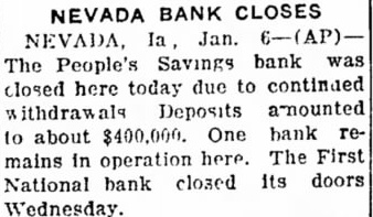 NEVADA BANK CLOSES NEVADA, Jan. The Savings bank was People's closed here today due to continued Deposits amounted to about $400,000. One here. The First mains operation bank closed its doors National Wednesday.