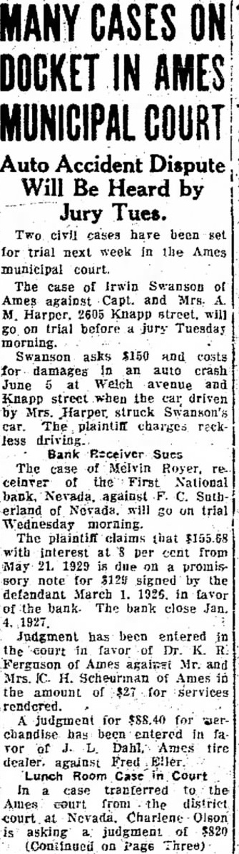 MANY ON DOCKET IN AMES MUNICIPAL Auto Accident Dispute Will Be Heard by Jury Tues. Two civil cases have been set for trial next week in the Ames municipal court. The case of Irwin Swanson Ames against Capt. and Mrs. Harper. 2605 Knapp street. on trial before jury Tuesday morning. Swanson asks $150 and costs for damages an auto crash June avenue and Knapp street when the car driven Mrs. Harper struck Swanson's car. The plaintiff charges reckless Bank Receiver Sues The case Melvin Royer, re. ceinver the First National bank. Nevada. against erland of Novada. will go on trial Wednesday morning. The plaintiff claims that with interest Der cent from May 21. 1929 due on promisnote for 3129 signed by the defendant March 1325. in of the bank The bank close Jan. Judgment has been entered the court favor of Dr. Ferguson Ames against Mr. and Mrs. H. Scheurman Ames in the amount of $27 for services rendered. judgment for for aerchandise bay been entered Ames tire dealer. against Fred Eller Lunch Room Case Court In case tranterred the Ames court from district court Novada. Charlene Olson asking judgment of $820 (Continued on